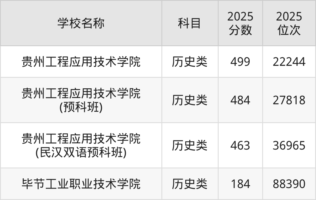 下文为2025年毕节市理工类大学在贵州历史类录取分数线和位次排名表,供大家参考: