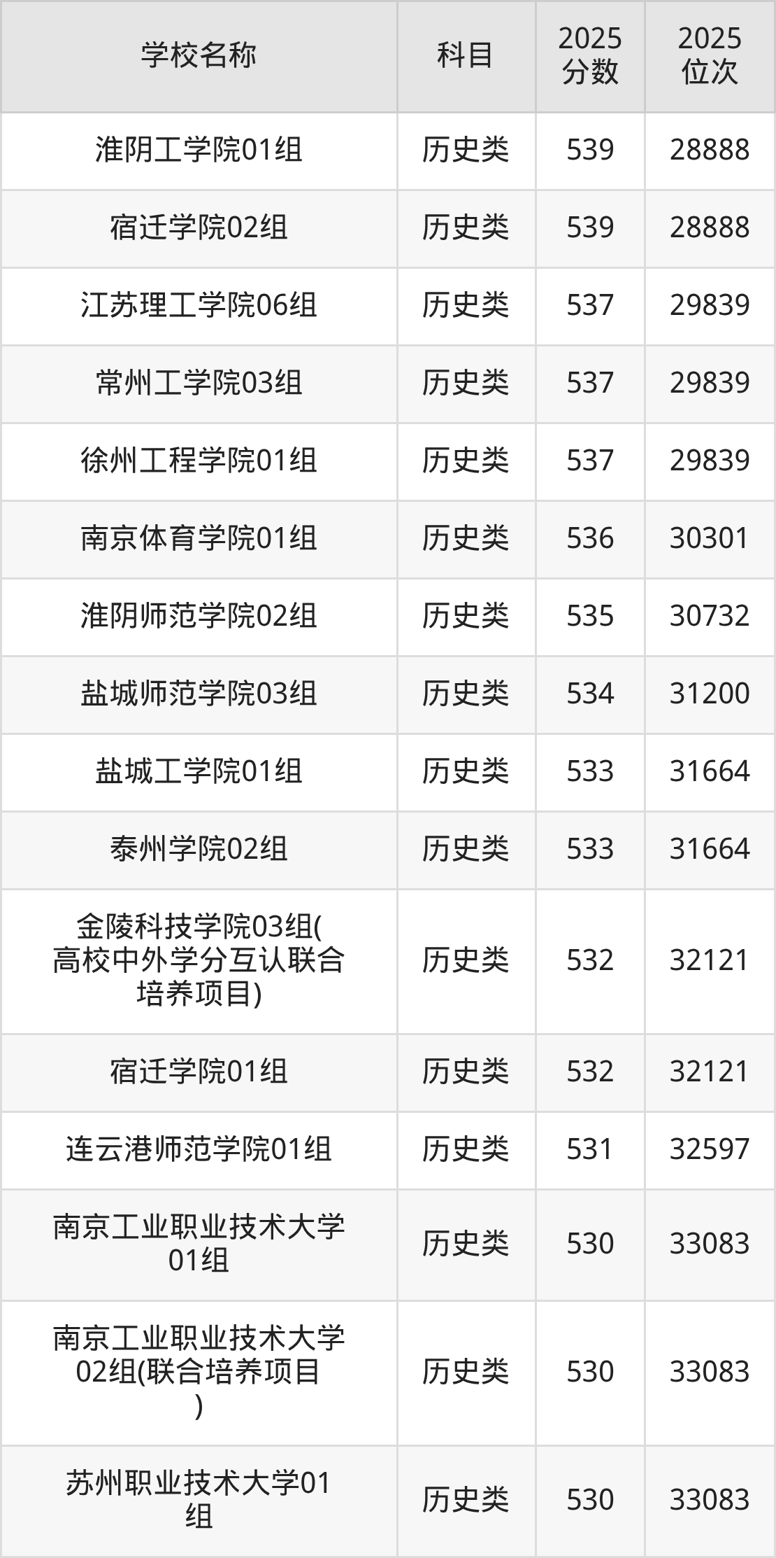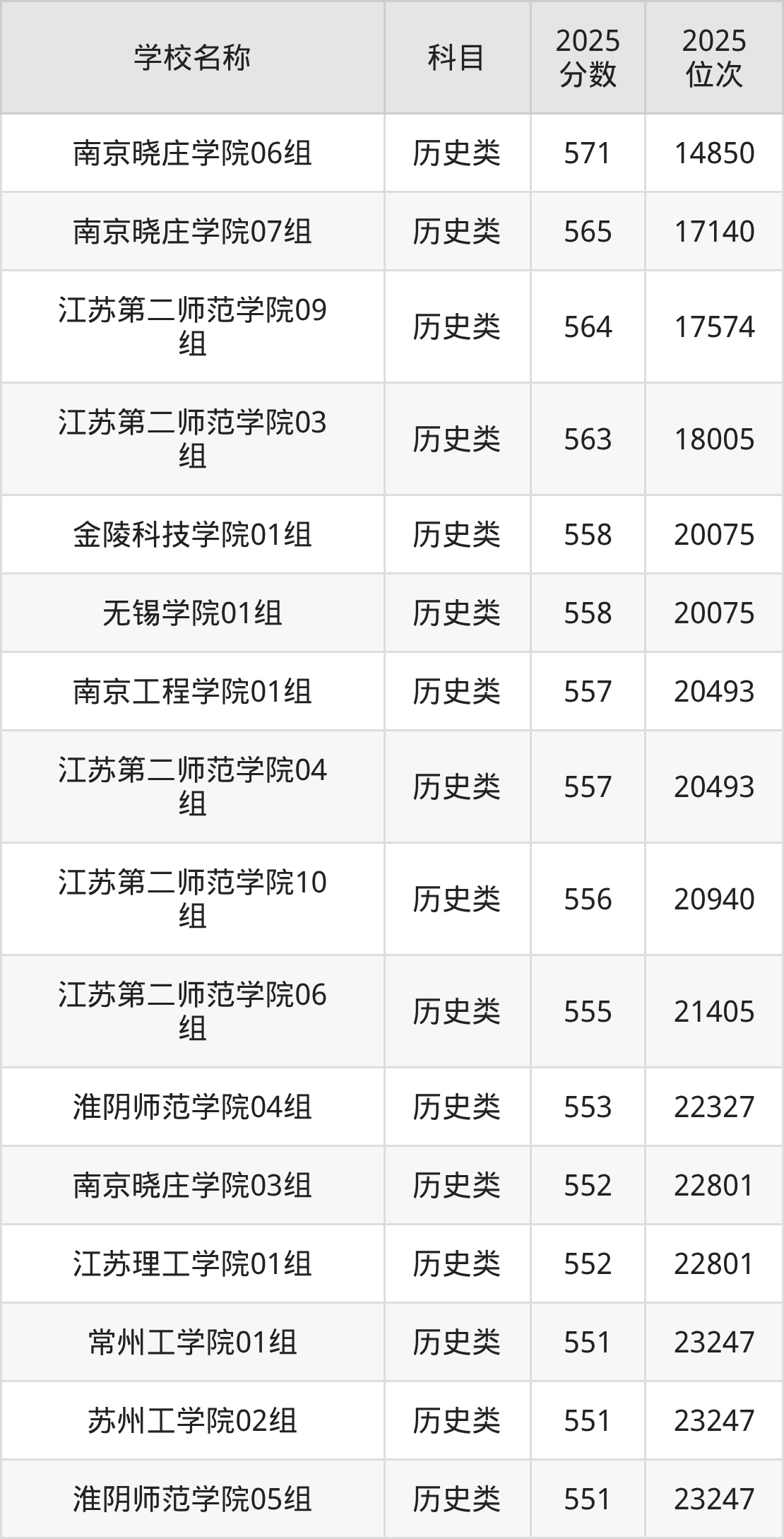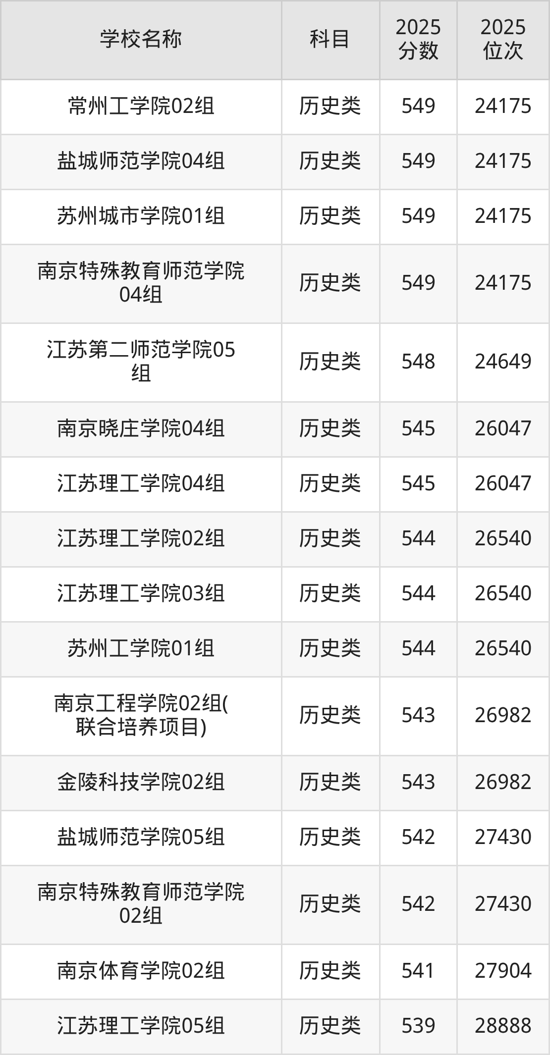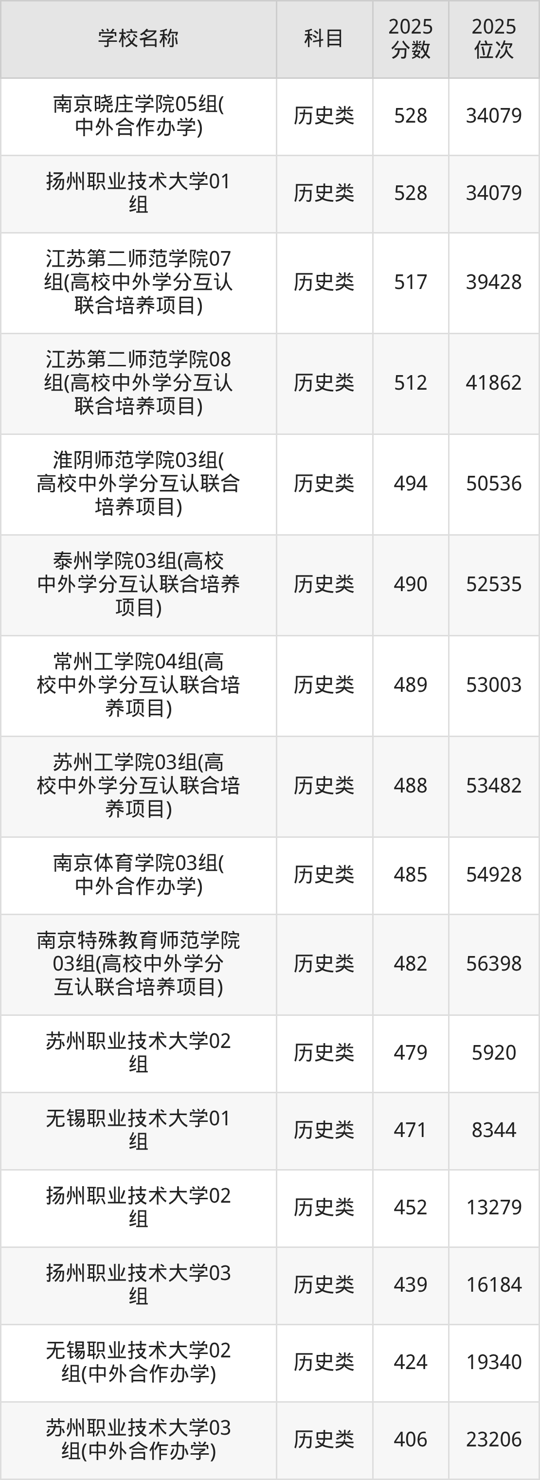 下文为2025年江苏省公办二本大学在江苏历史类录取分数线和位次排名表,供大家参考: