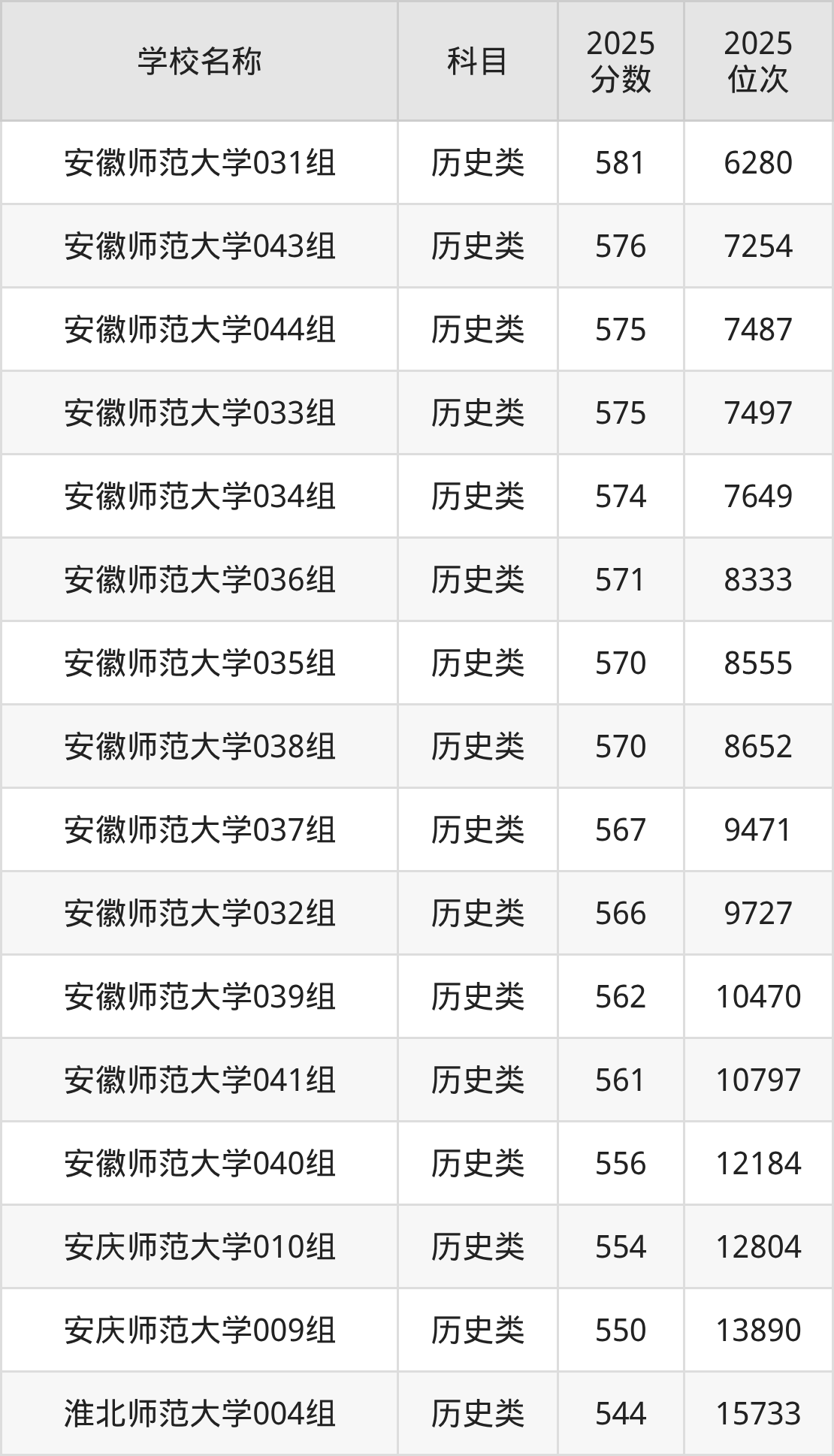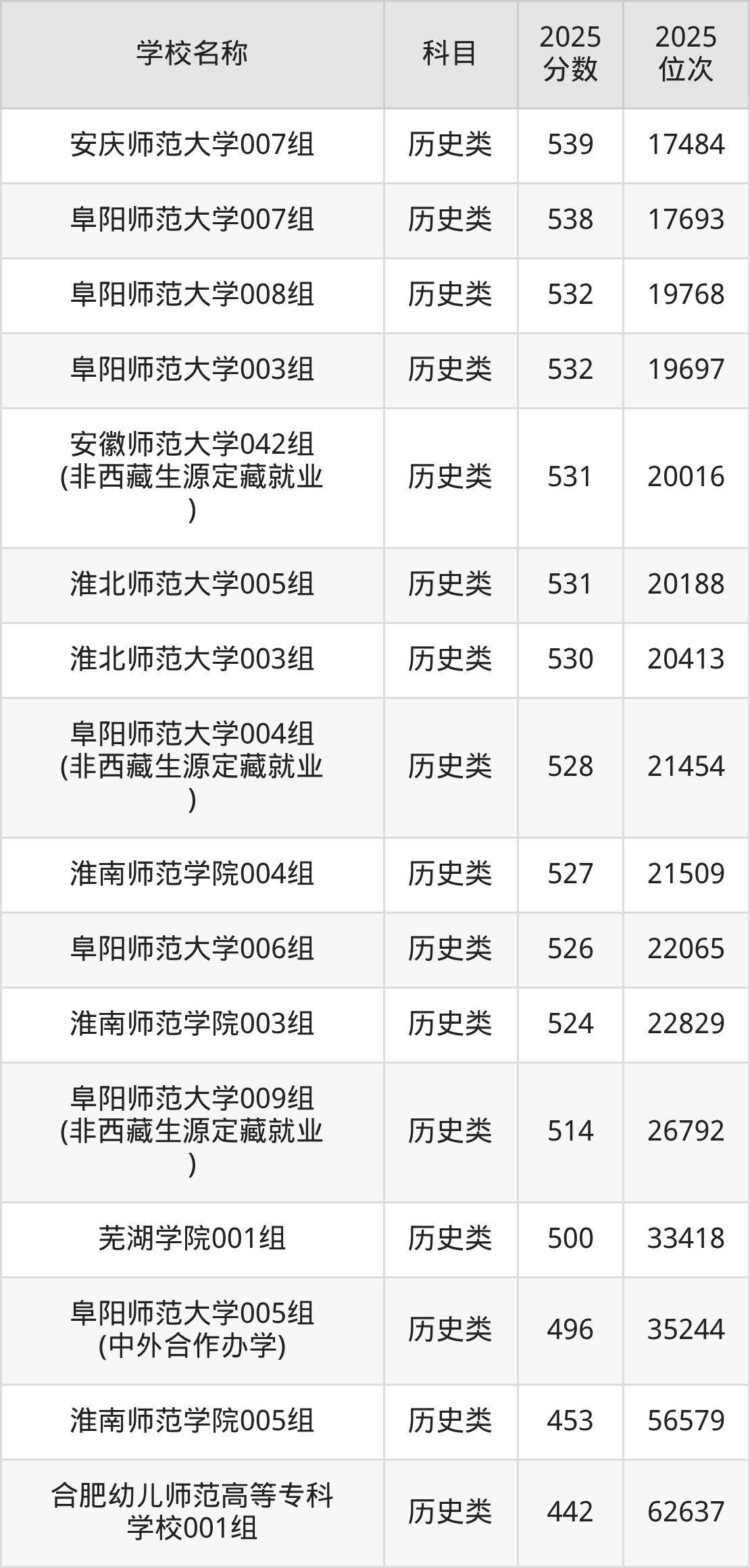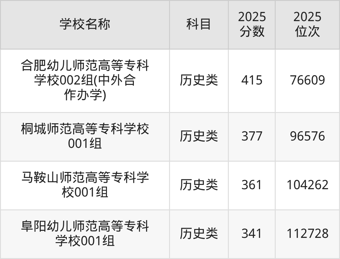 下文为2025年安徽省师范类大学在安徽历史类录取分数线和位次排名表,供大家参考: