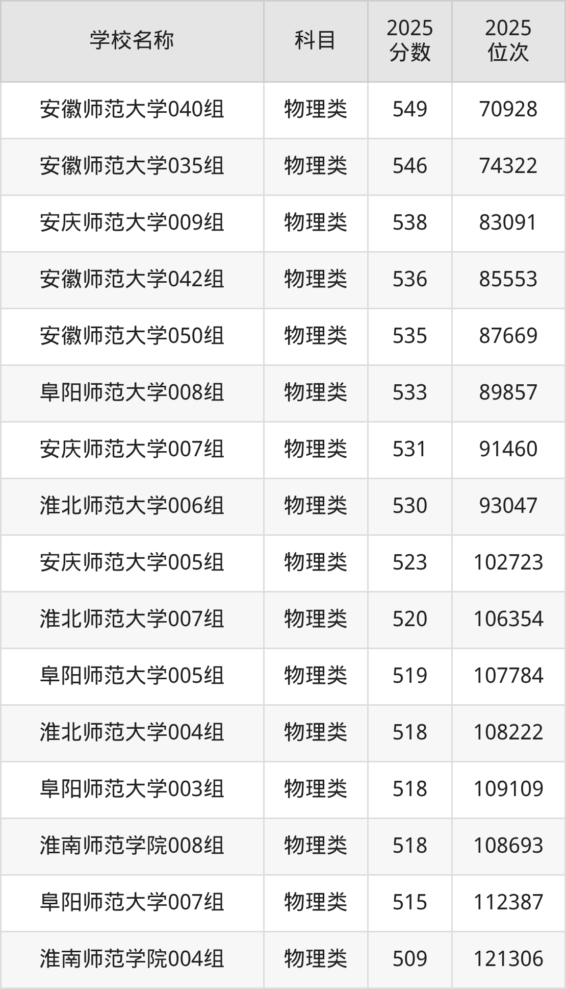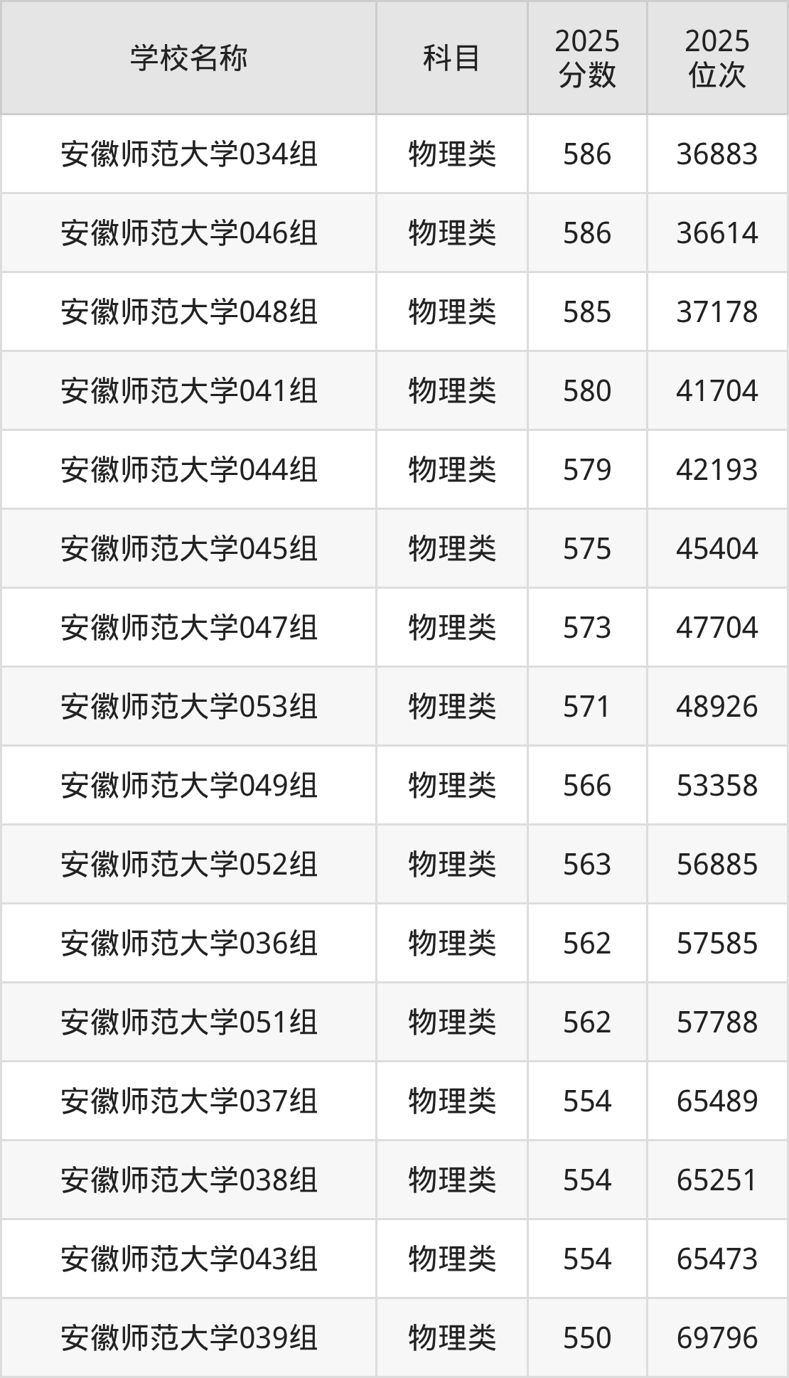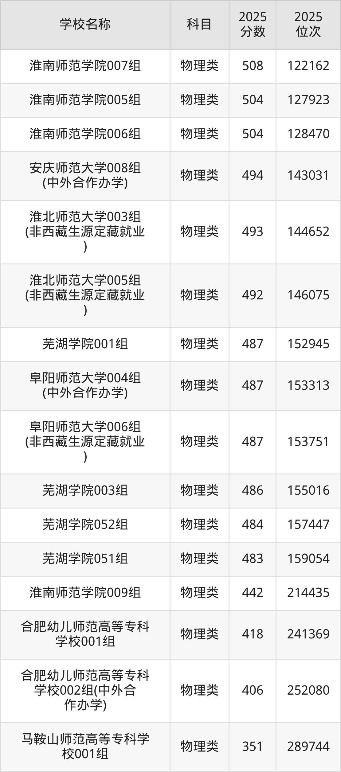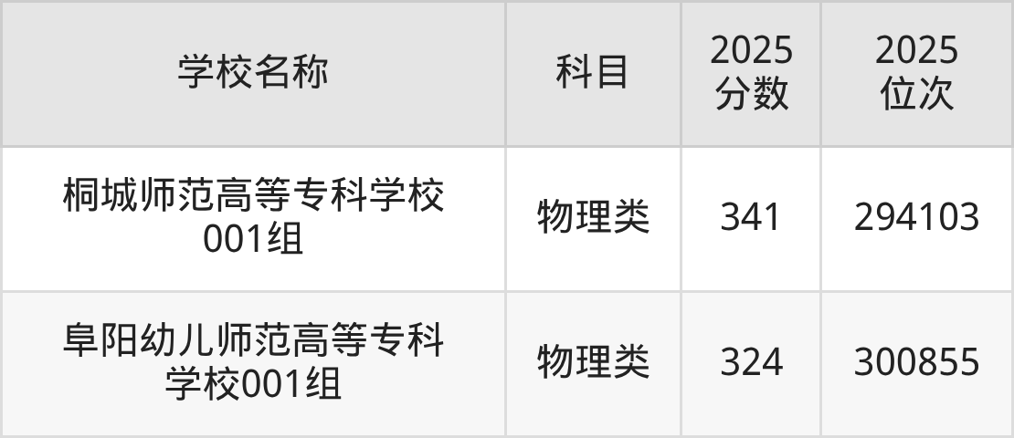 下文为2025年安徽省师范类大学在安徽物理类录取分数线和位次排名表,供大家参考:
