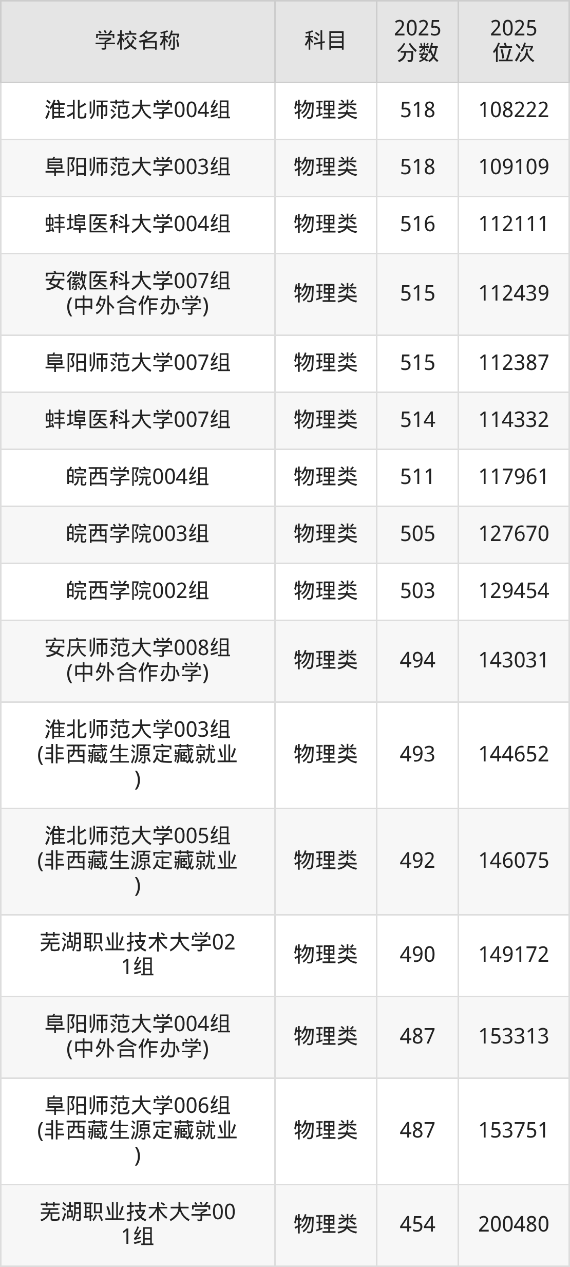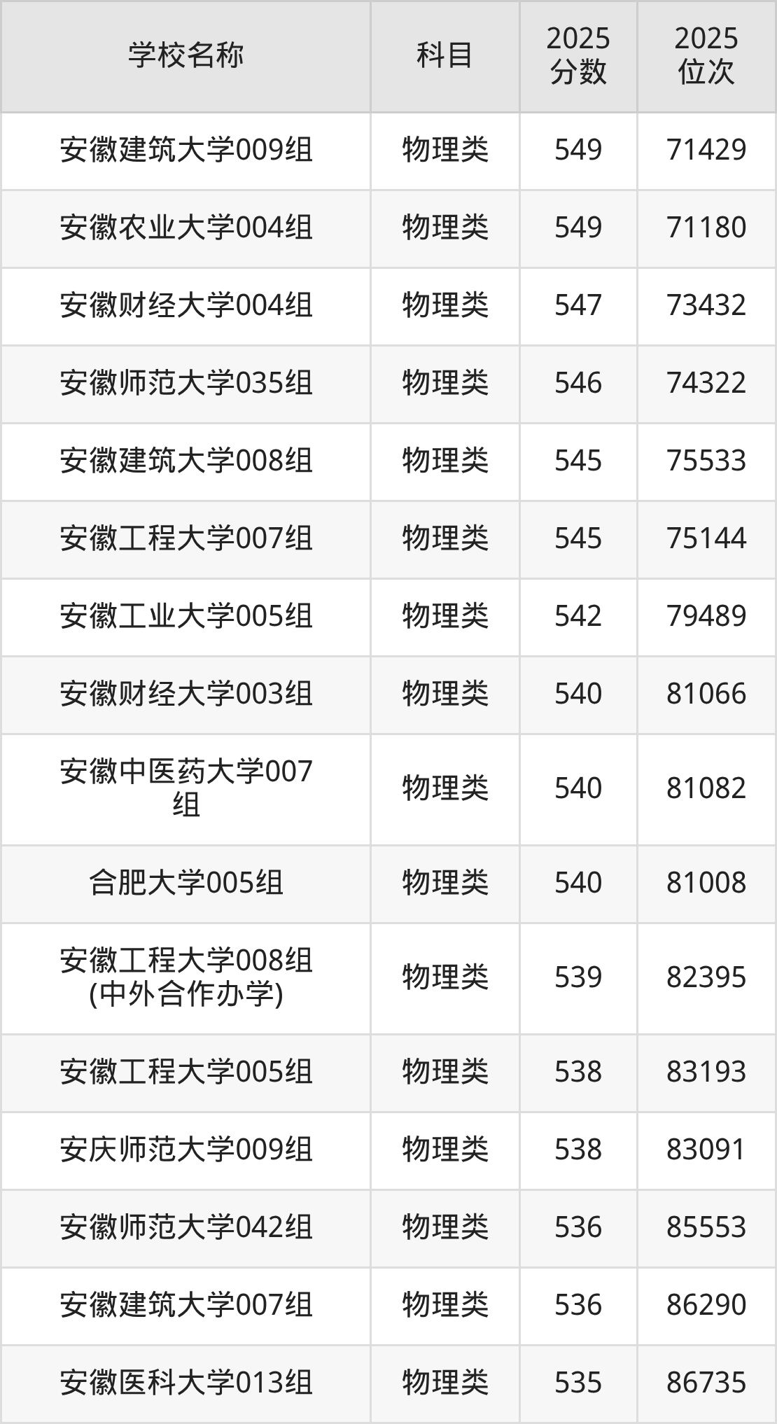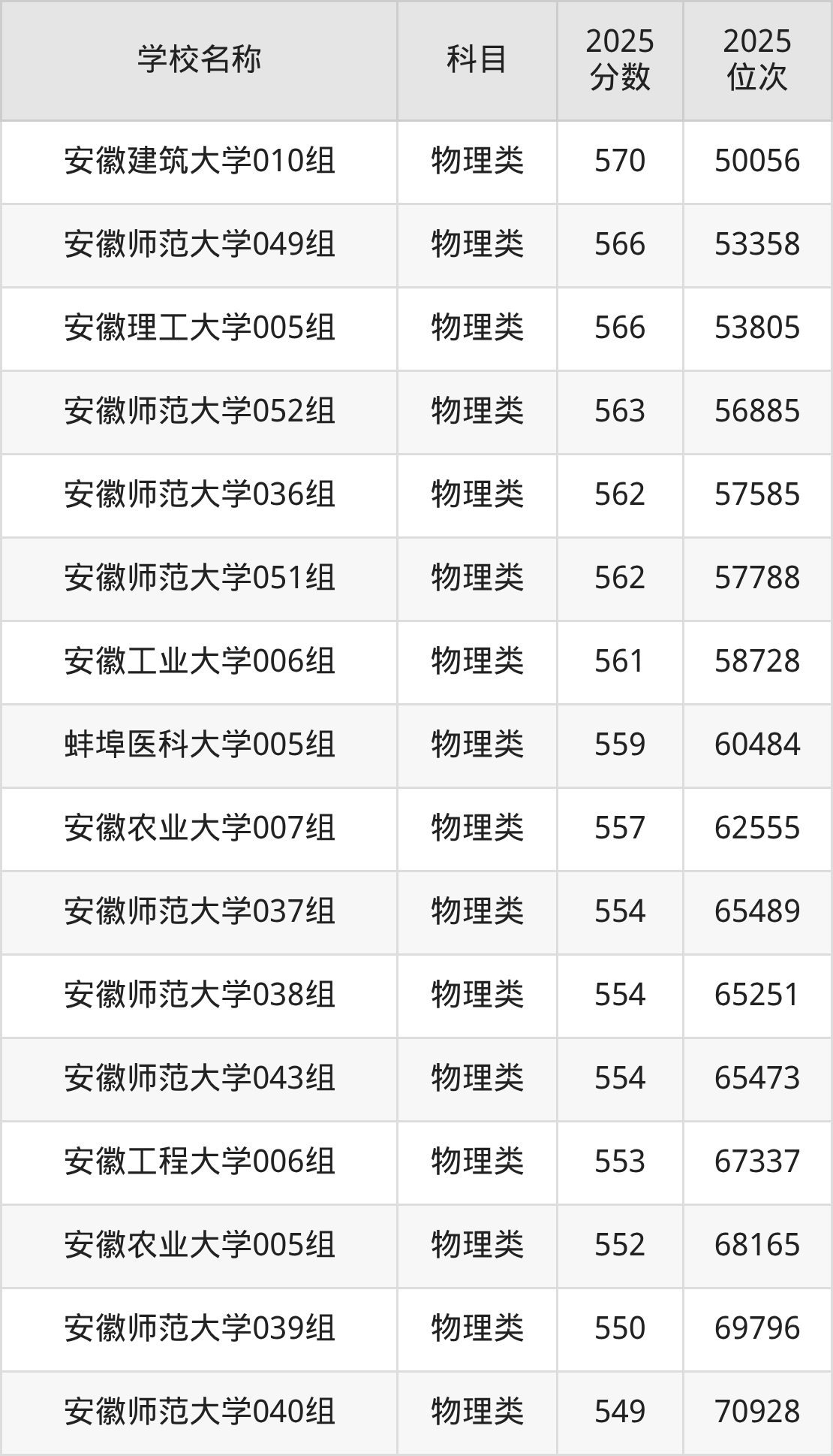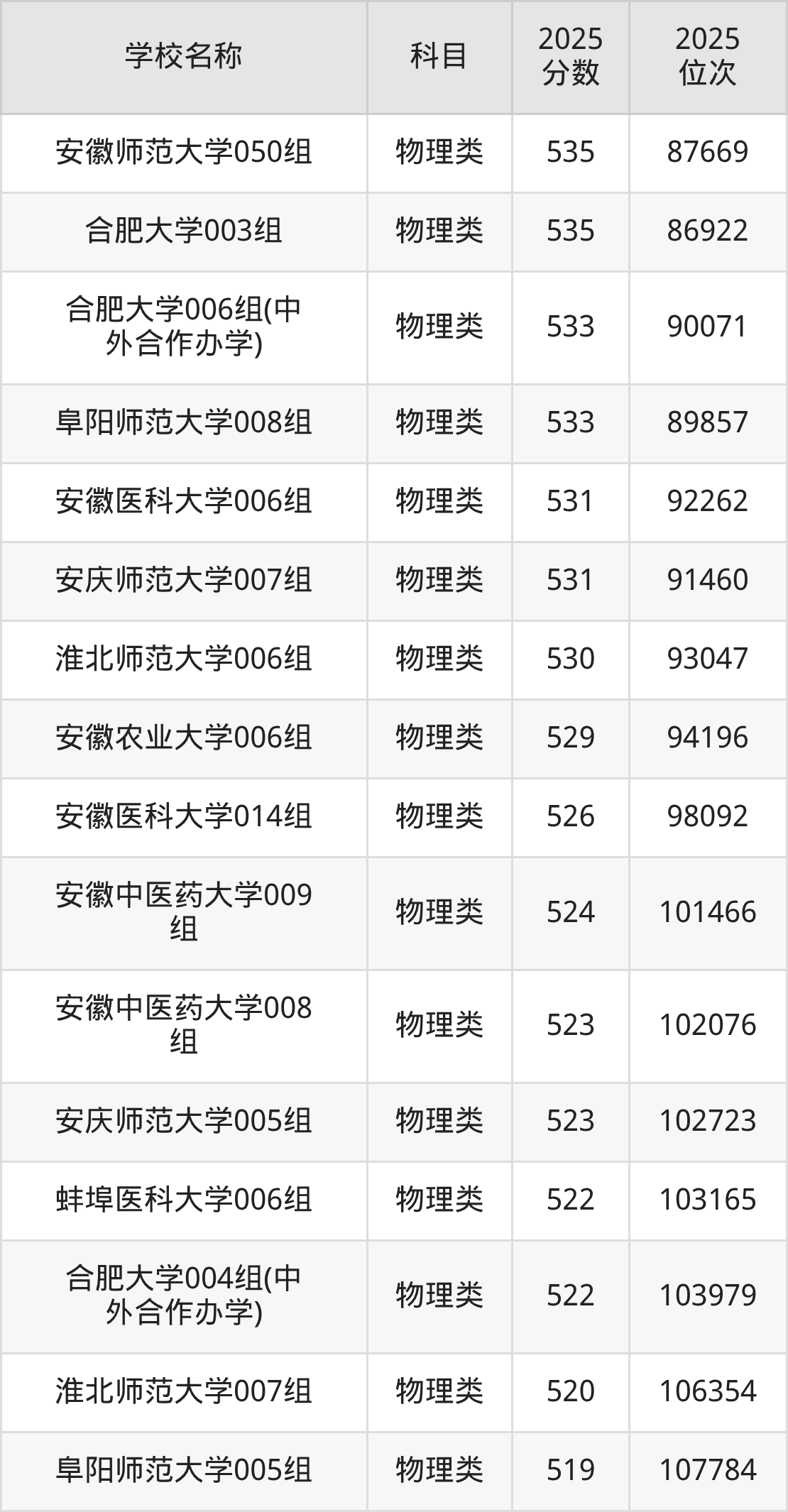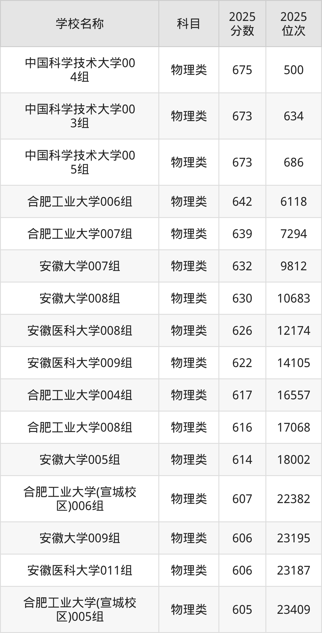下文为2025年安徽省一本大学在安徽物理类录取分数线和位次排名表,供大家参考: