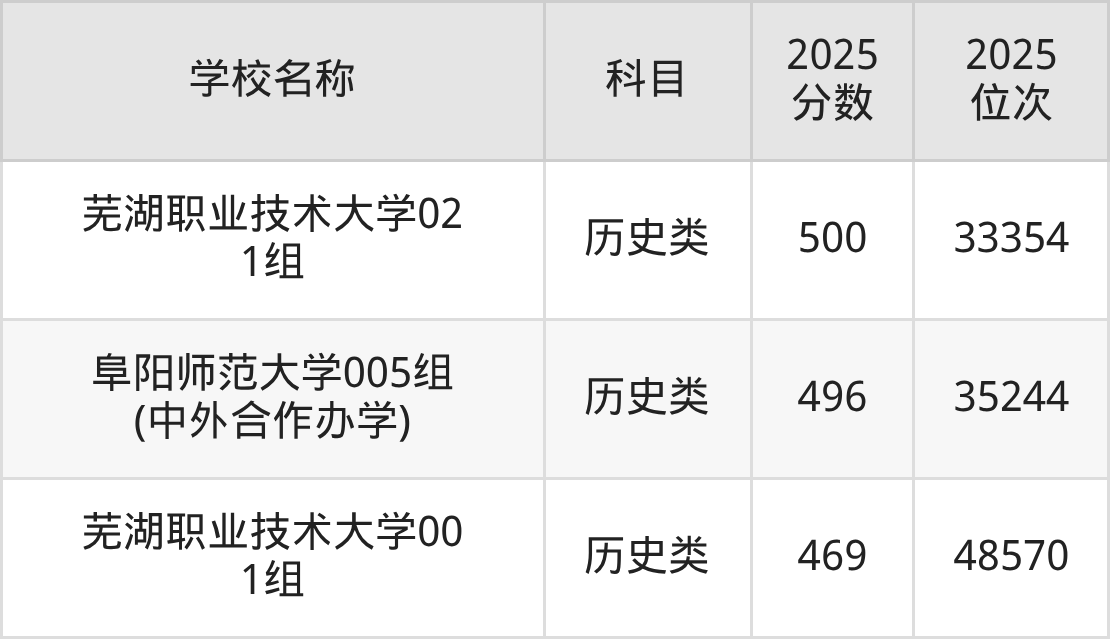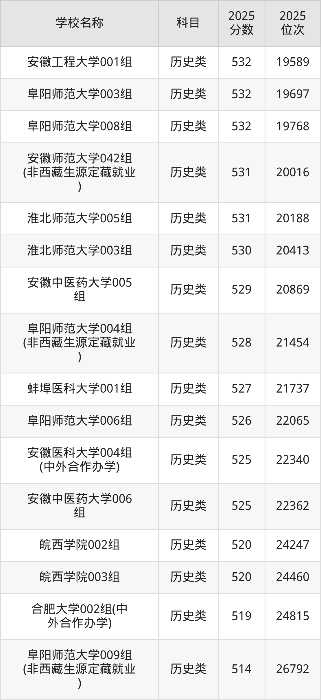 下文为2025年安徽省一本大学在安徽历史类录取分数线和位次排名表,供大家参考: