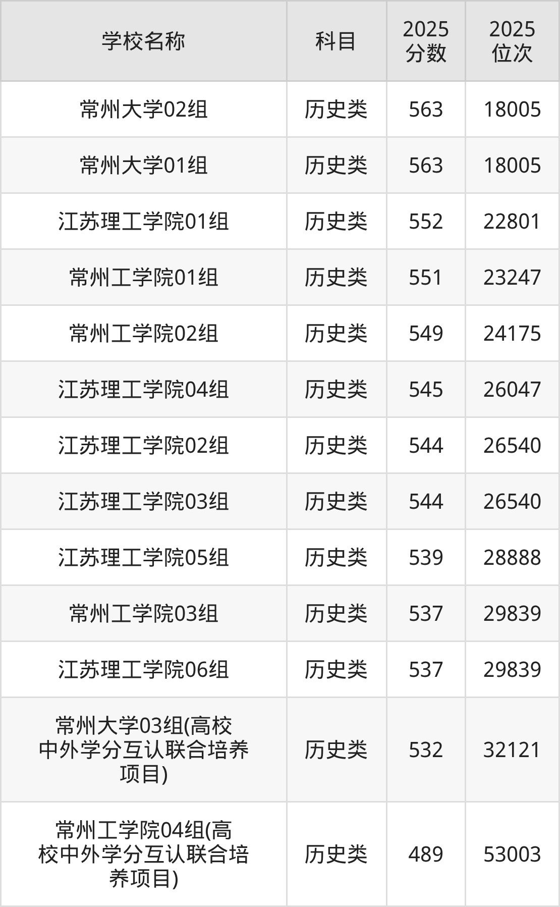下文为2025年常州市本科大学在江苏历史类录取分数线和位次排名表,供大家参考: