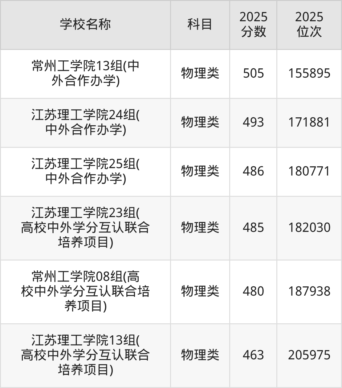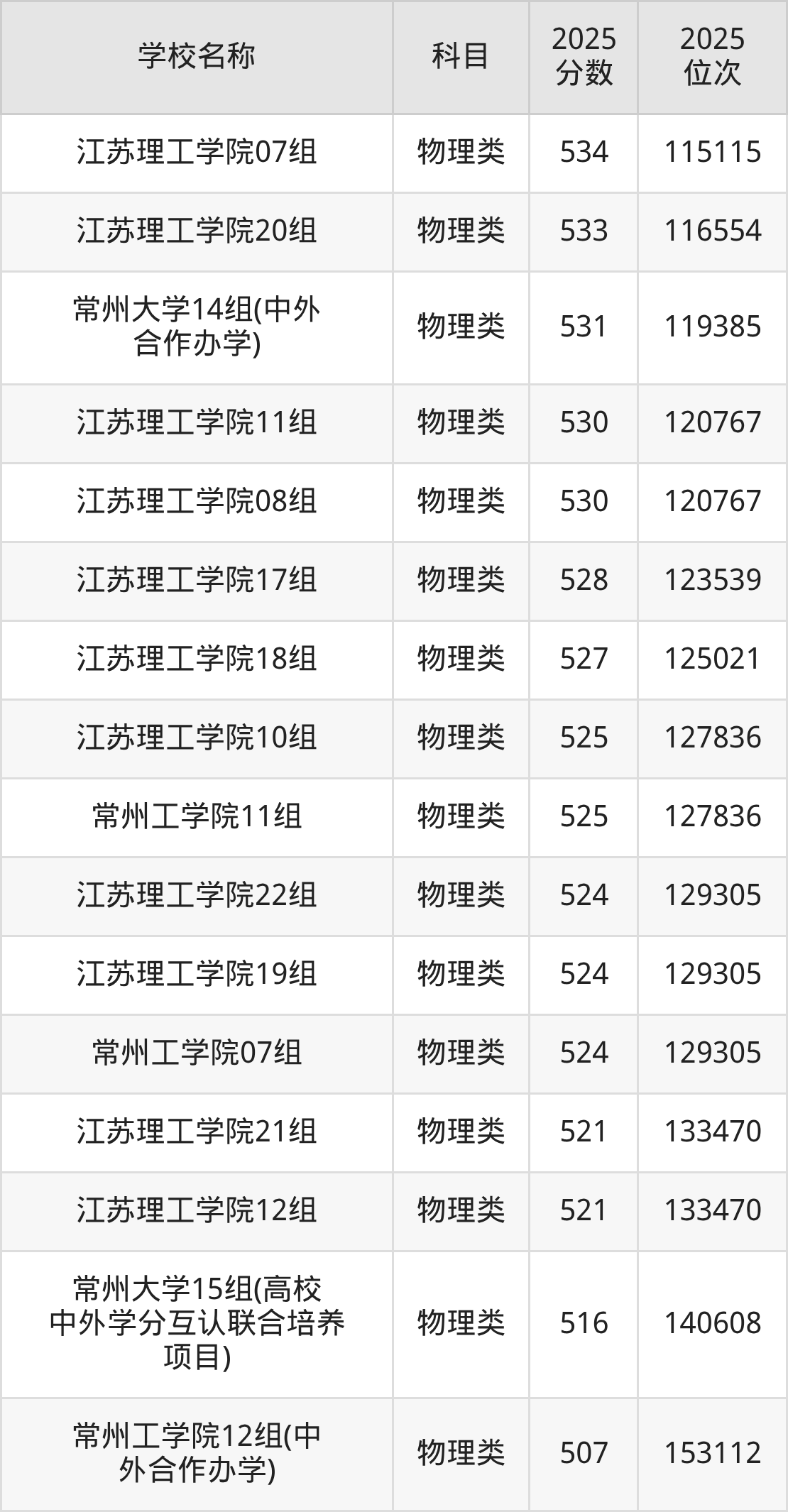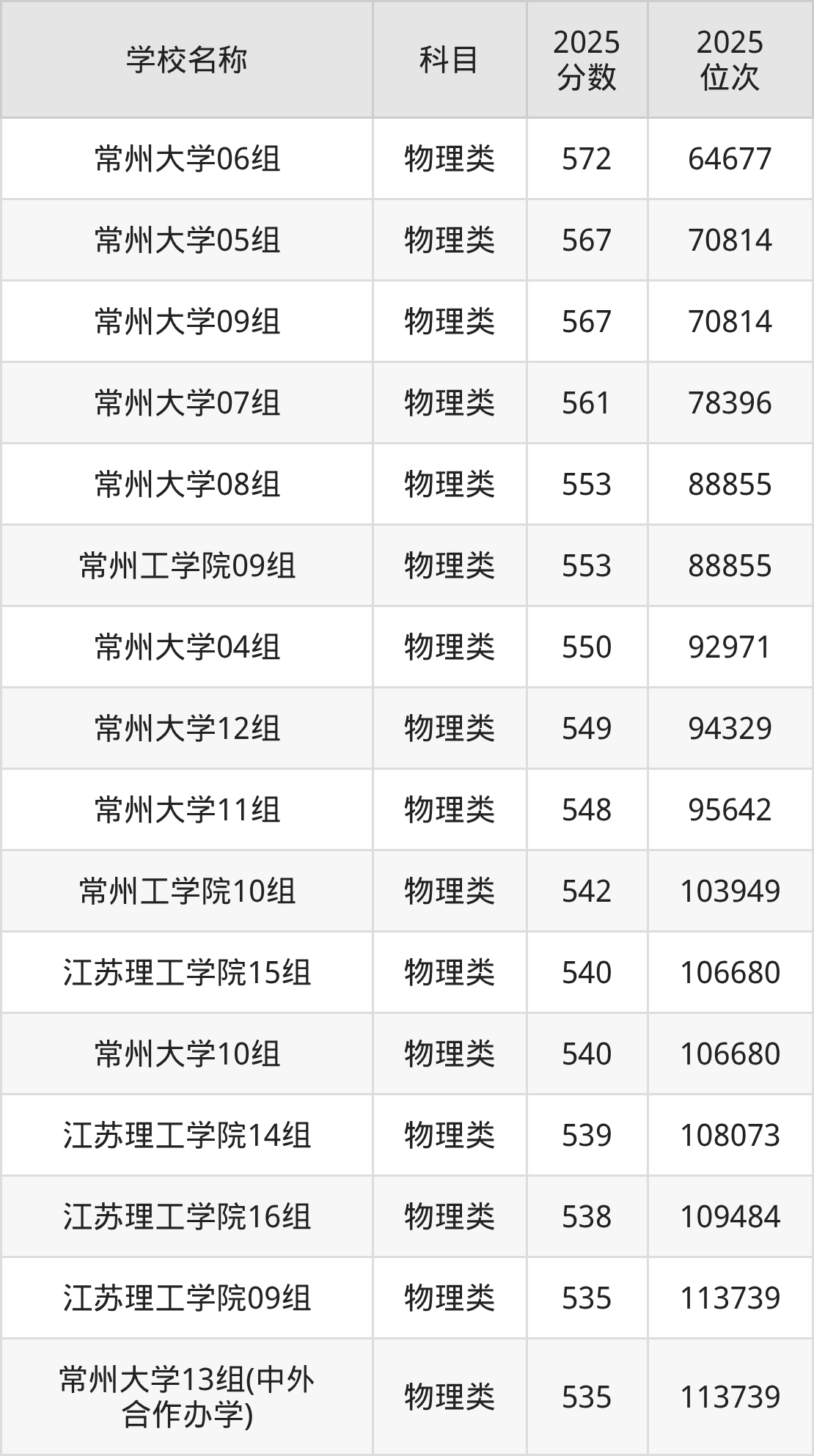 下文为2025年常州市本科大学在江苏物理类录取分数线和位次排名表,供大家参考: