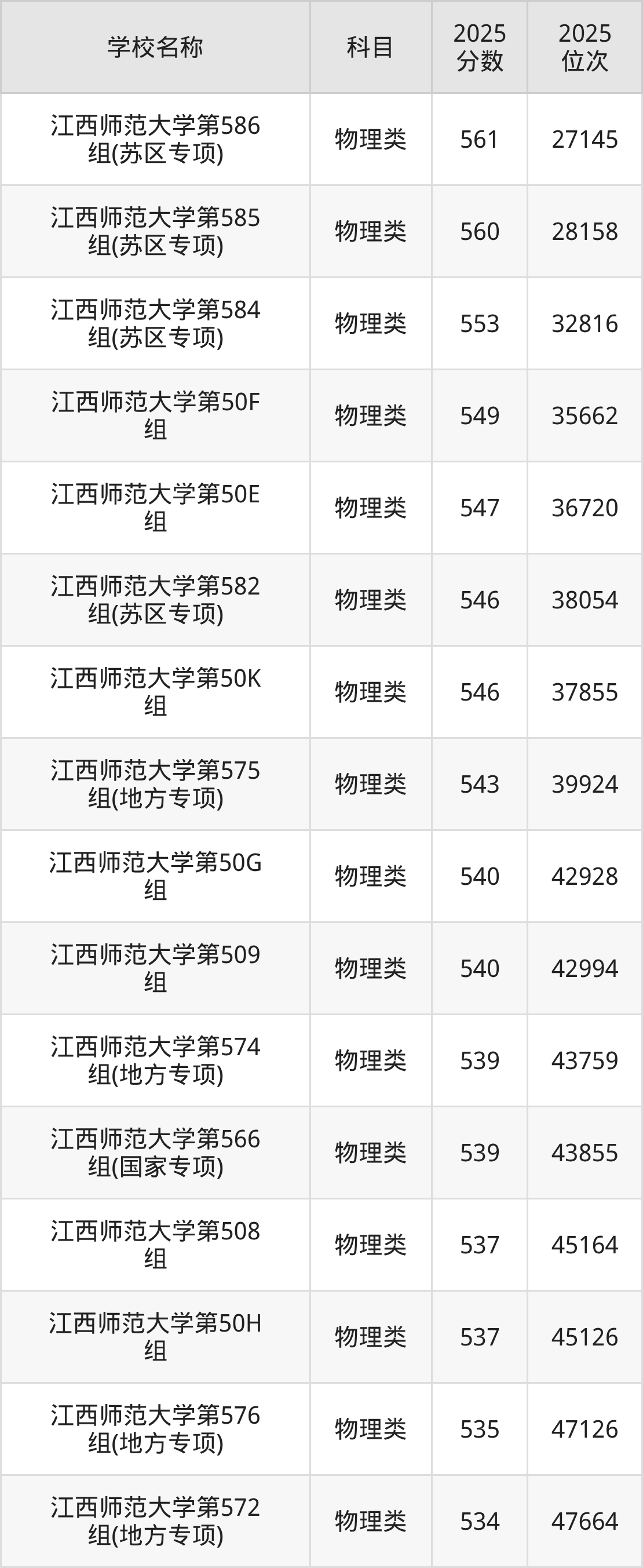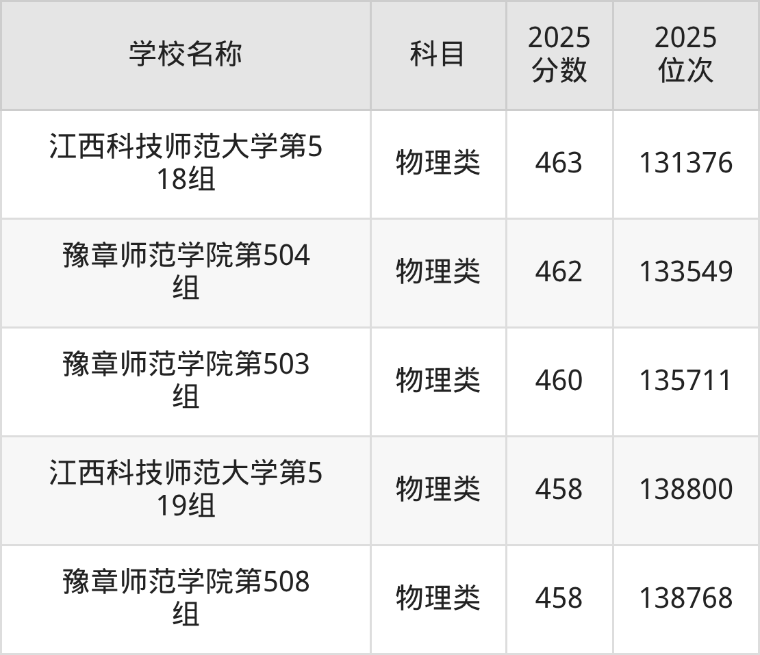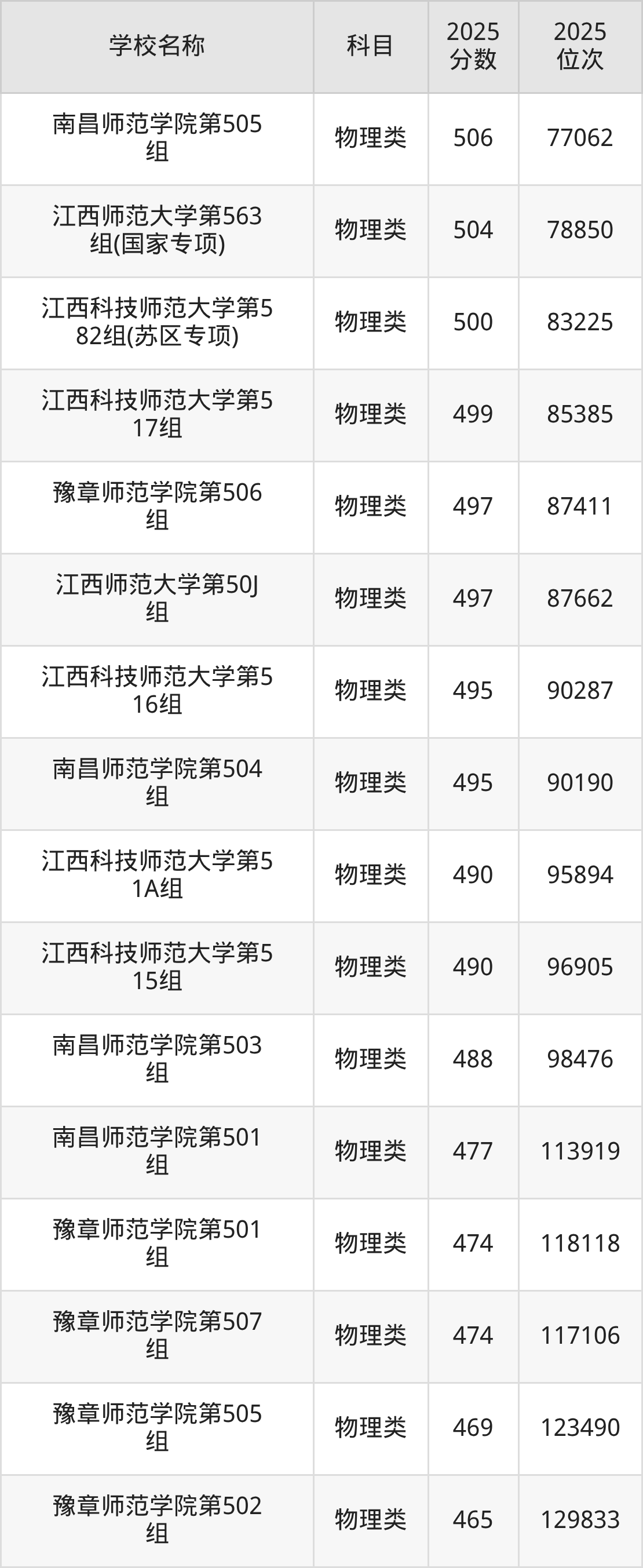 下文为2025年南昌市师范类大学在江西物理类录取分数线和位次排名表,供大家参考: