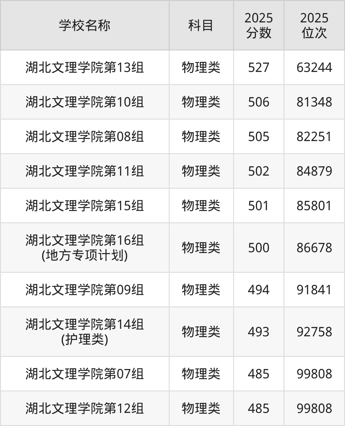 下文为2025年襄阳市二本综合大学在湖北物理类录取分数线和位次排名表,供大家参考: