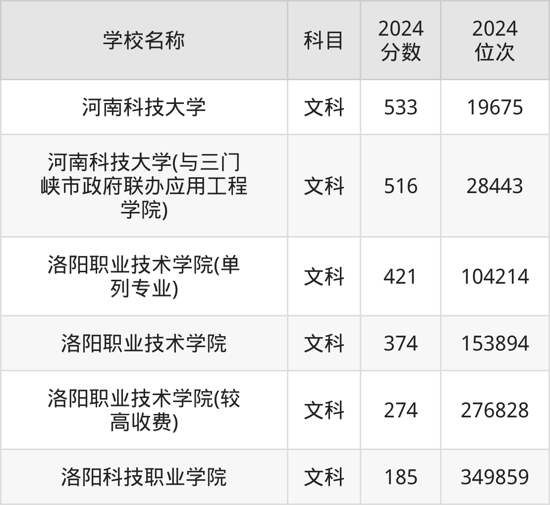 下文为2024年洛阳市综合类大学在河南文科录取分数线和位次排名表,供大家参考: