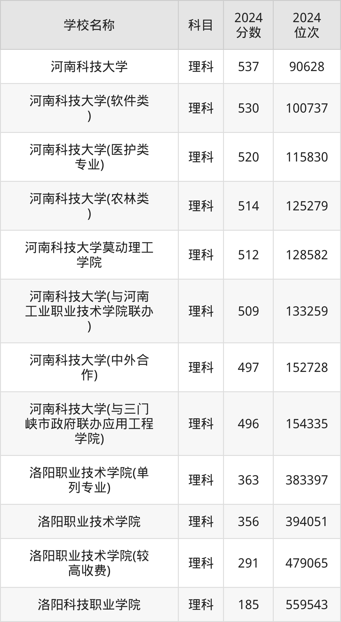 下文为2024年洛阳市综合类大学在河南理科录取分数线和位次排名表,供大家参考: