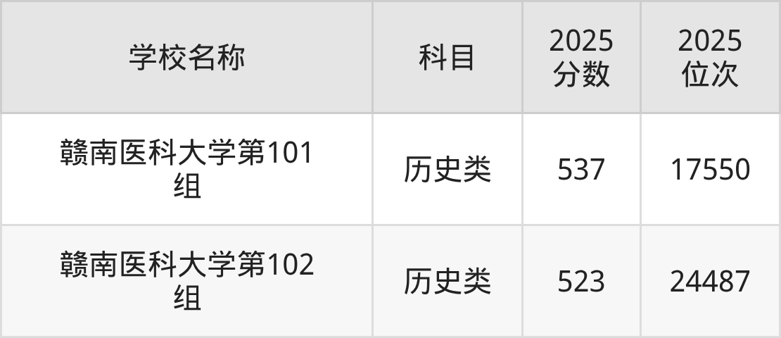 下文为2025年赣州市医科大学在江西历史类录取分数线和位次排名表,供大家参考: