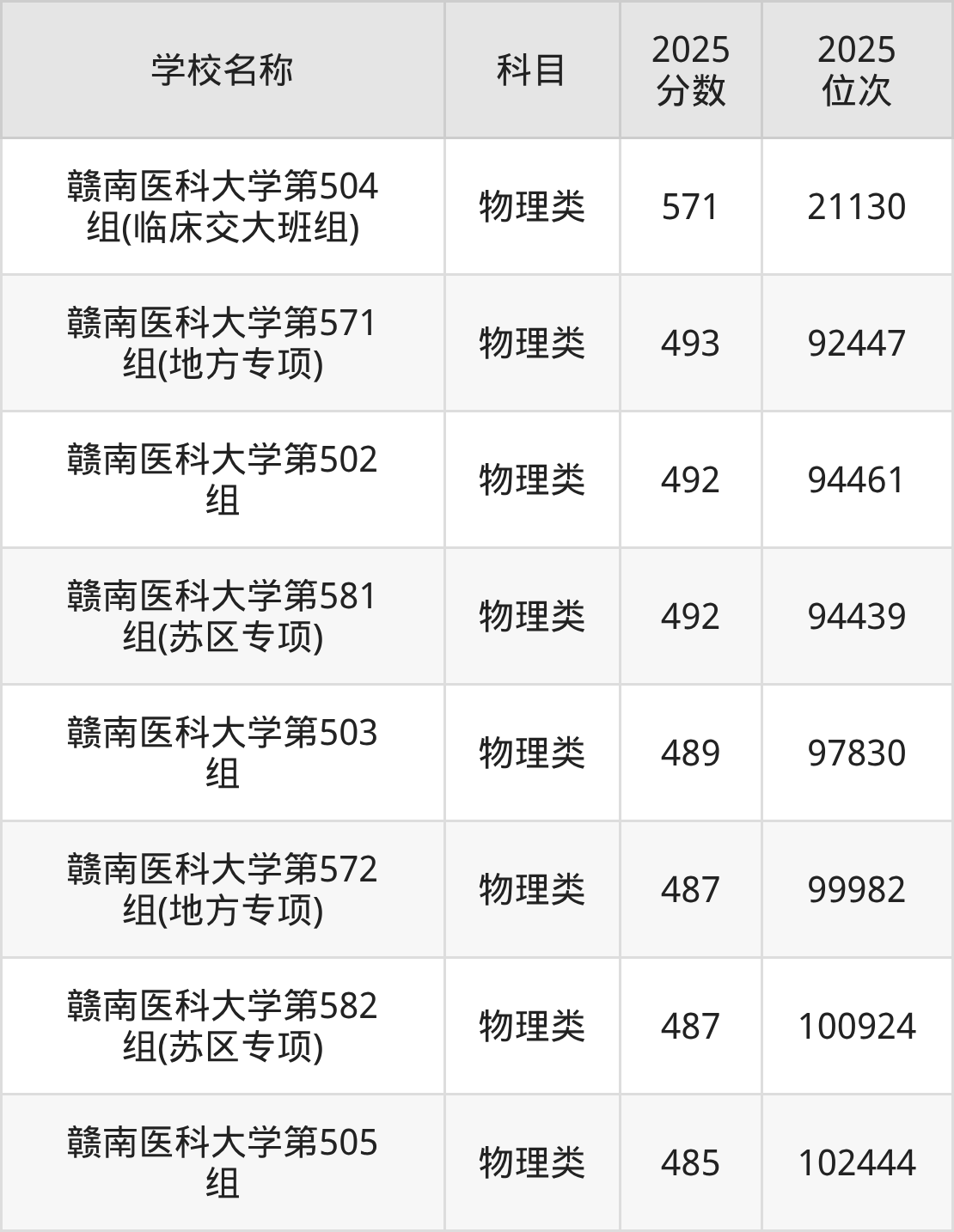 下文为2025年赣州市医科大学在江西物理类录取分数线和位次排名表,供大家参考: