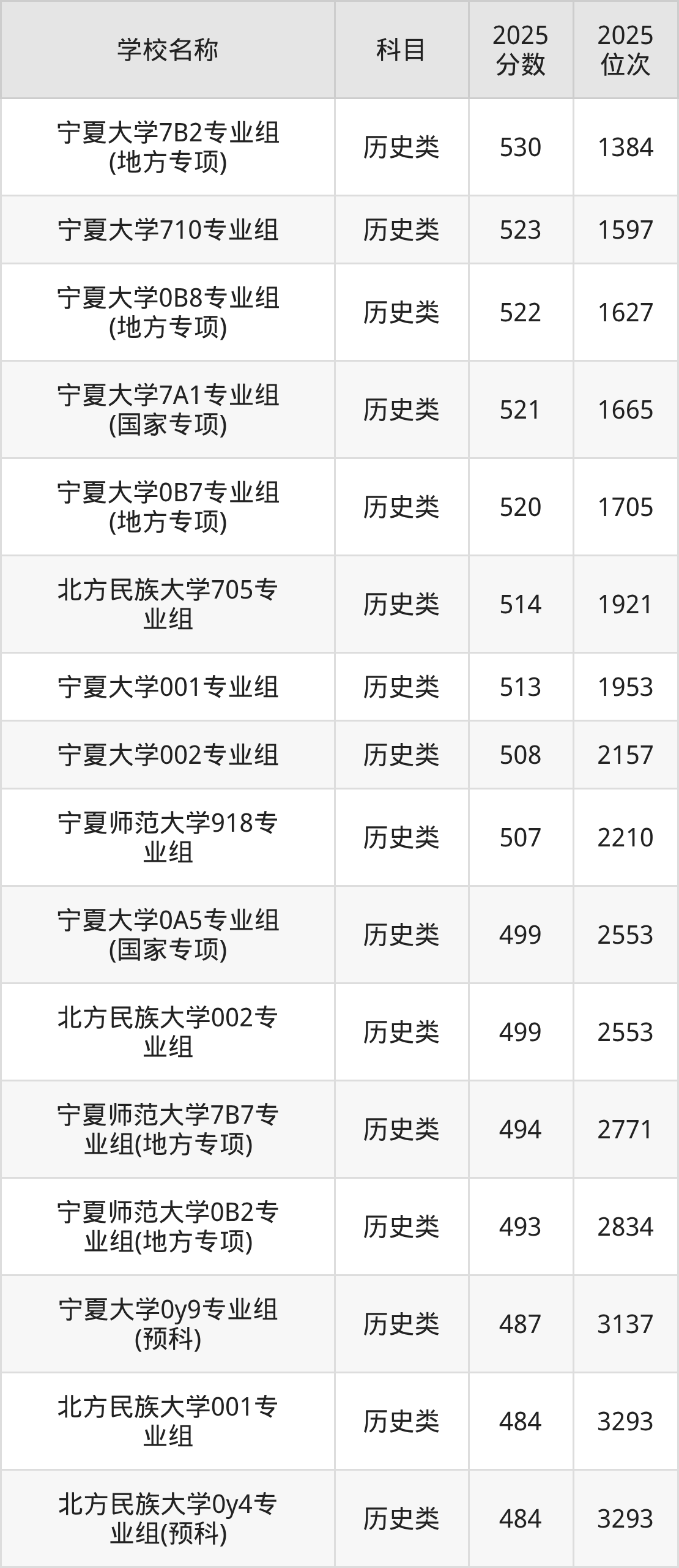 下文为2025年宁夏回族自治区一本大学在宁夏历史类录取分数线和位次排名表,供大家参考: