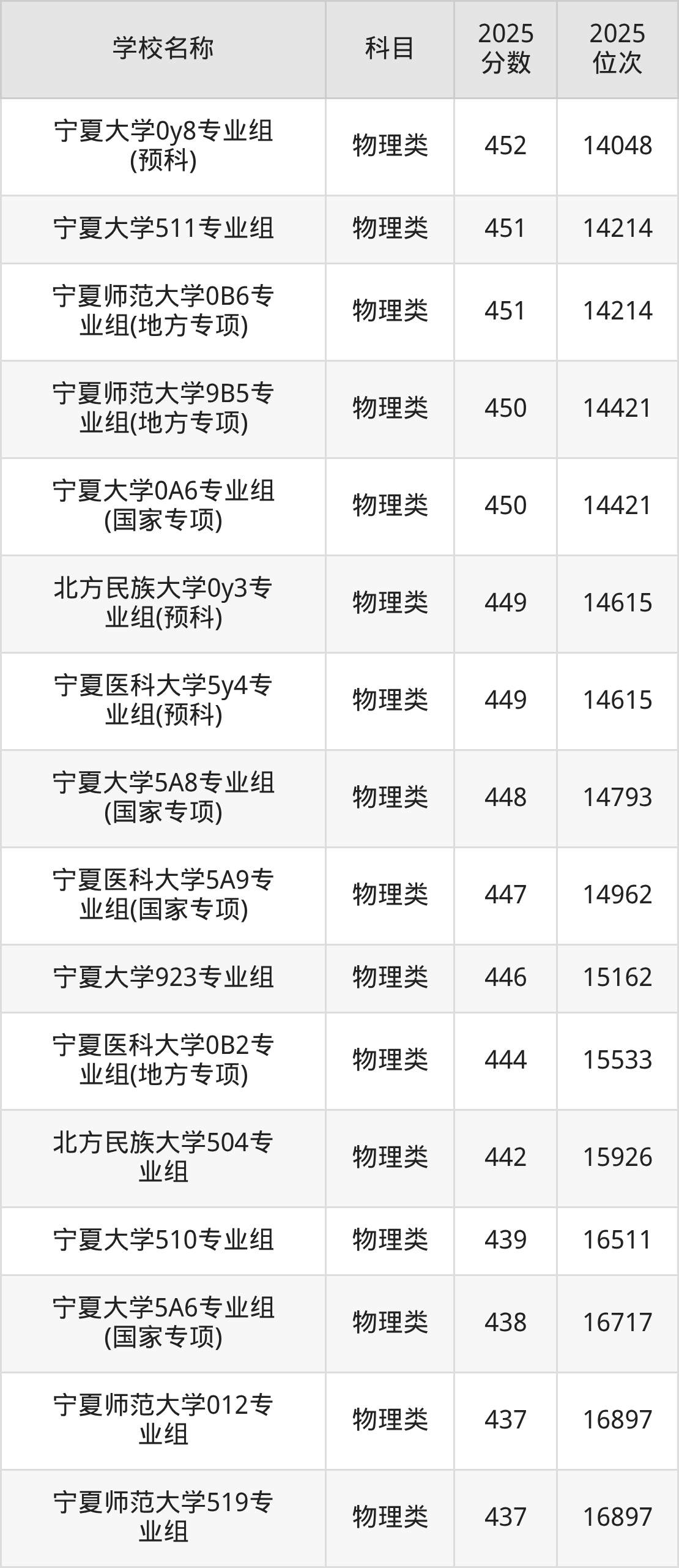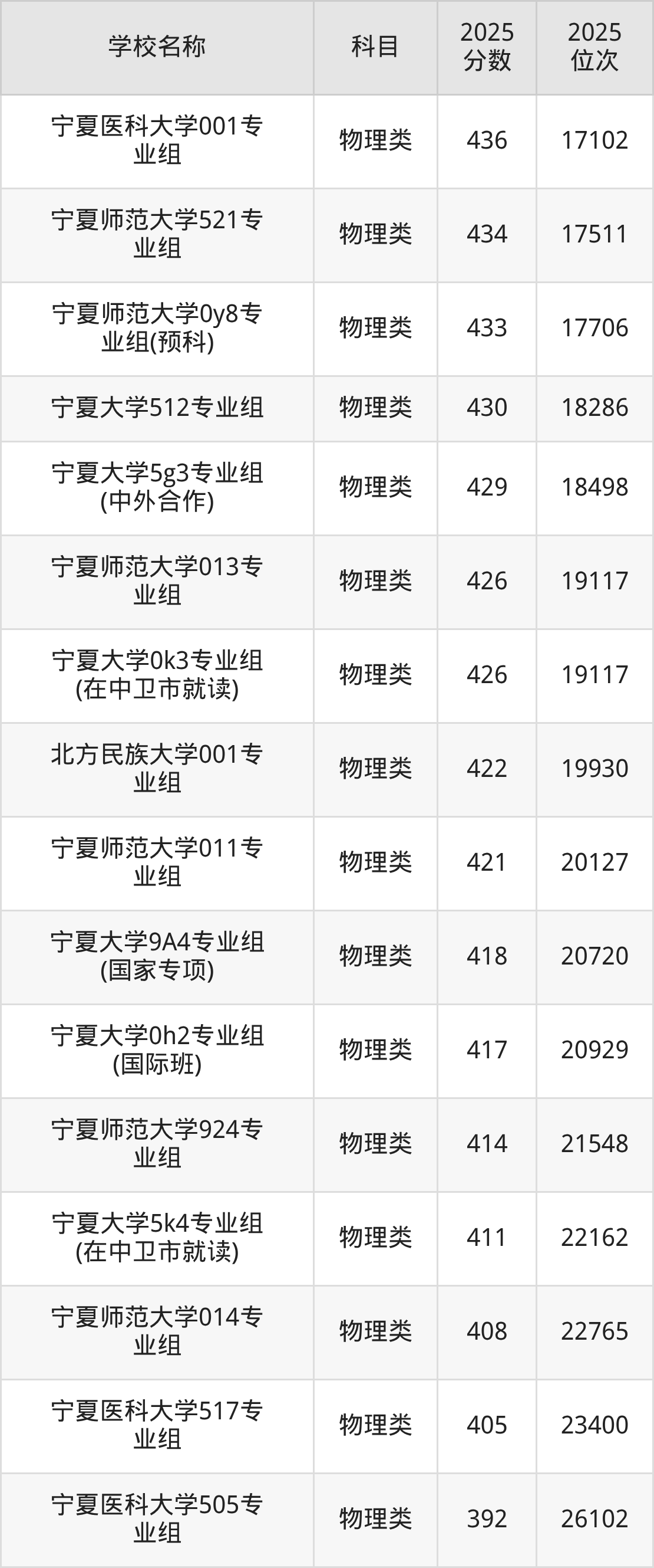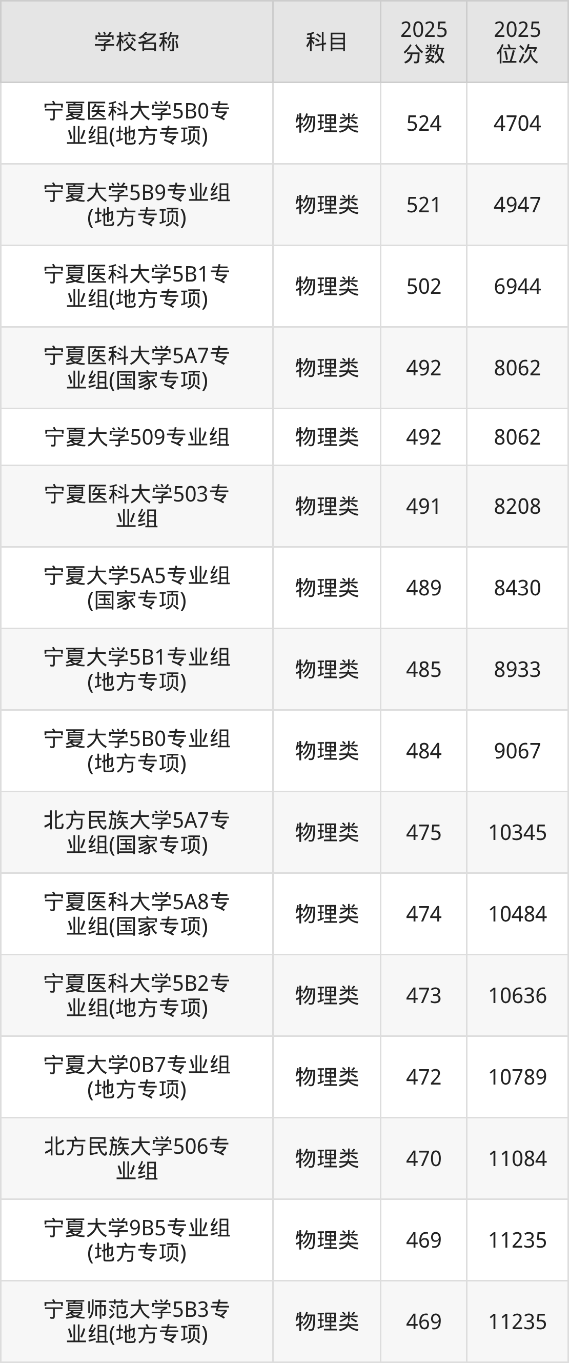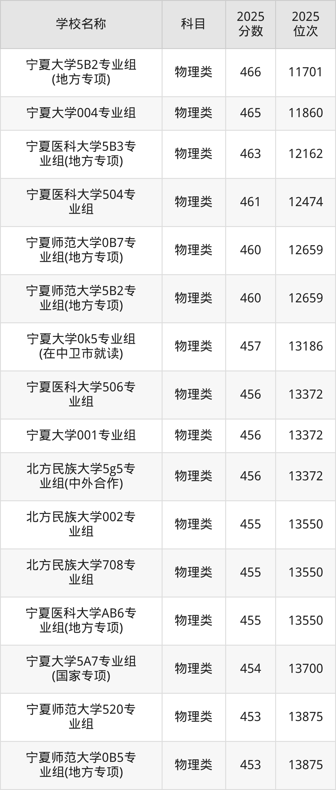 下文为2025年宁夏回族自治区一本大学在宁夏物理类录取分数线和位次排名表,供大家参考: