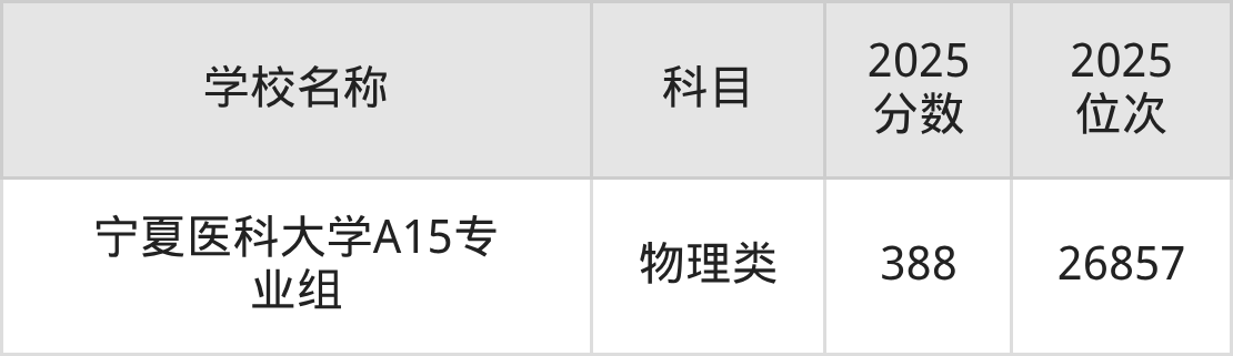 根据2025年宁夏一本大学在宁夏回族自治区物理类招生录取分数线来看,宁夏物理类收分最低的一本大学为宁夏医科大学,录取分数线为388分。