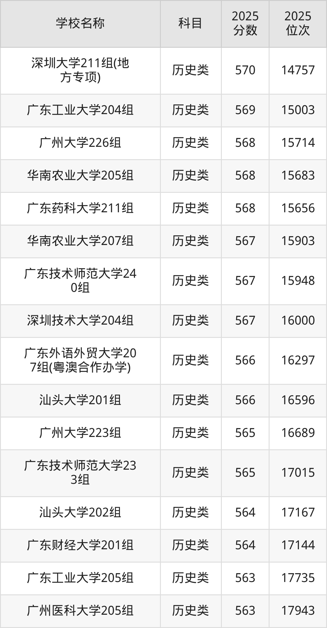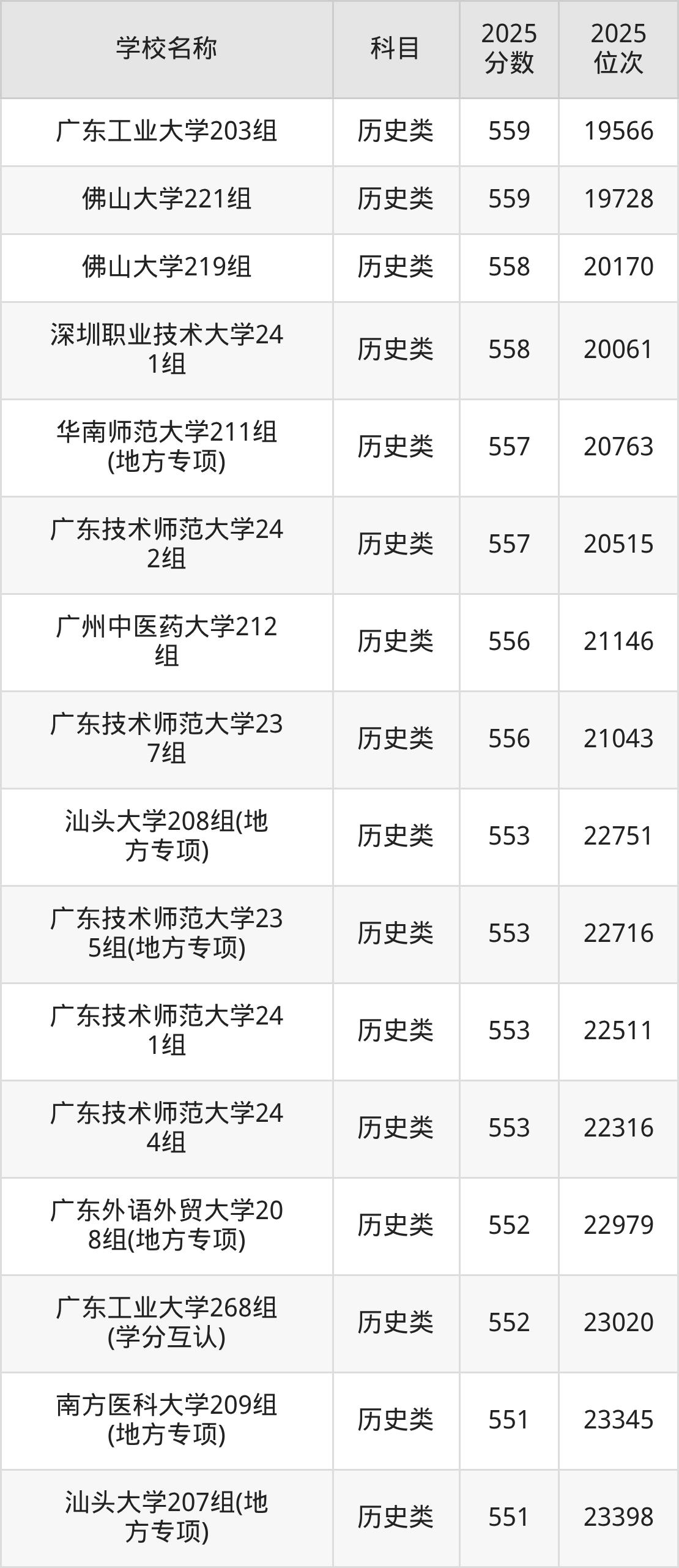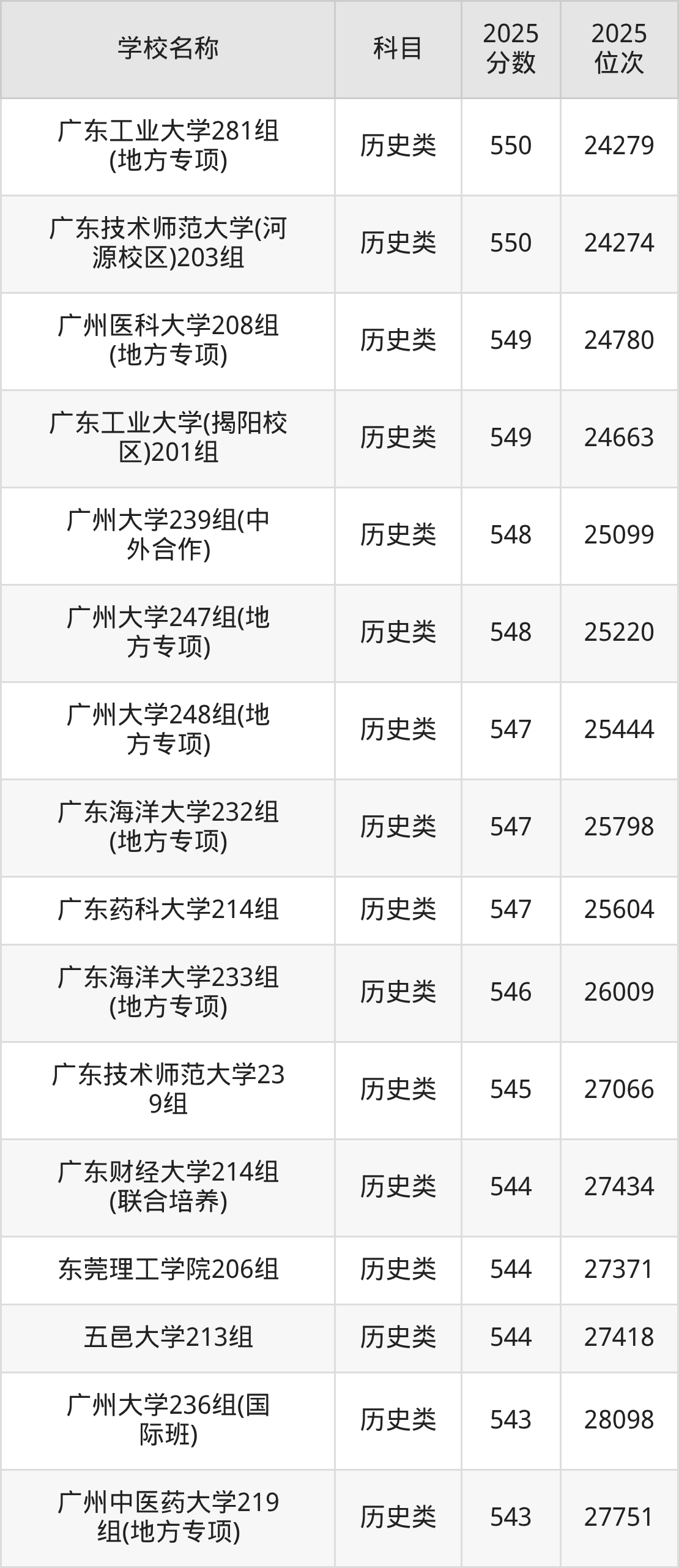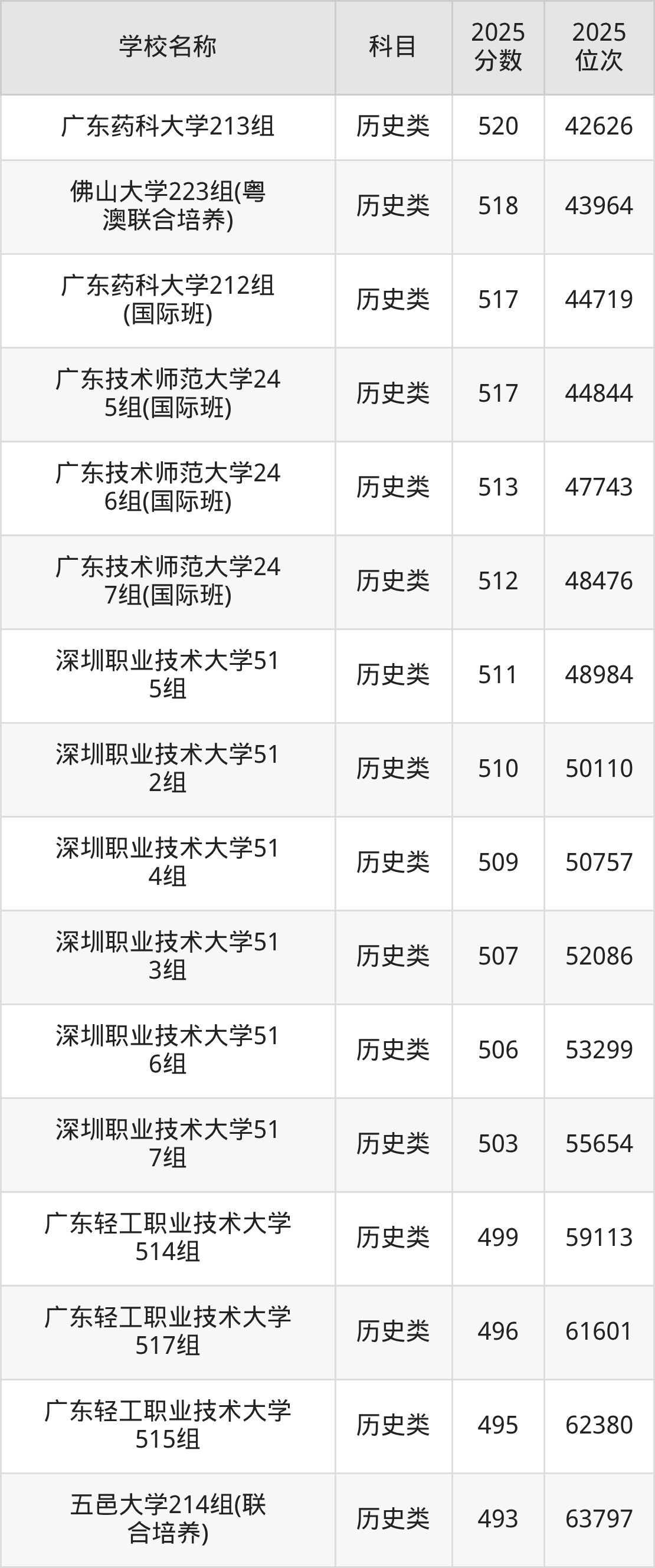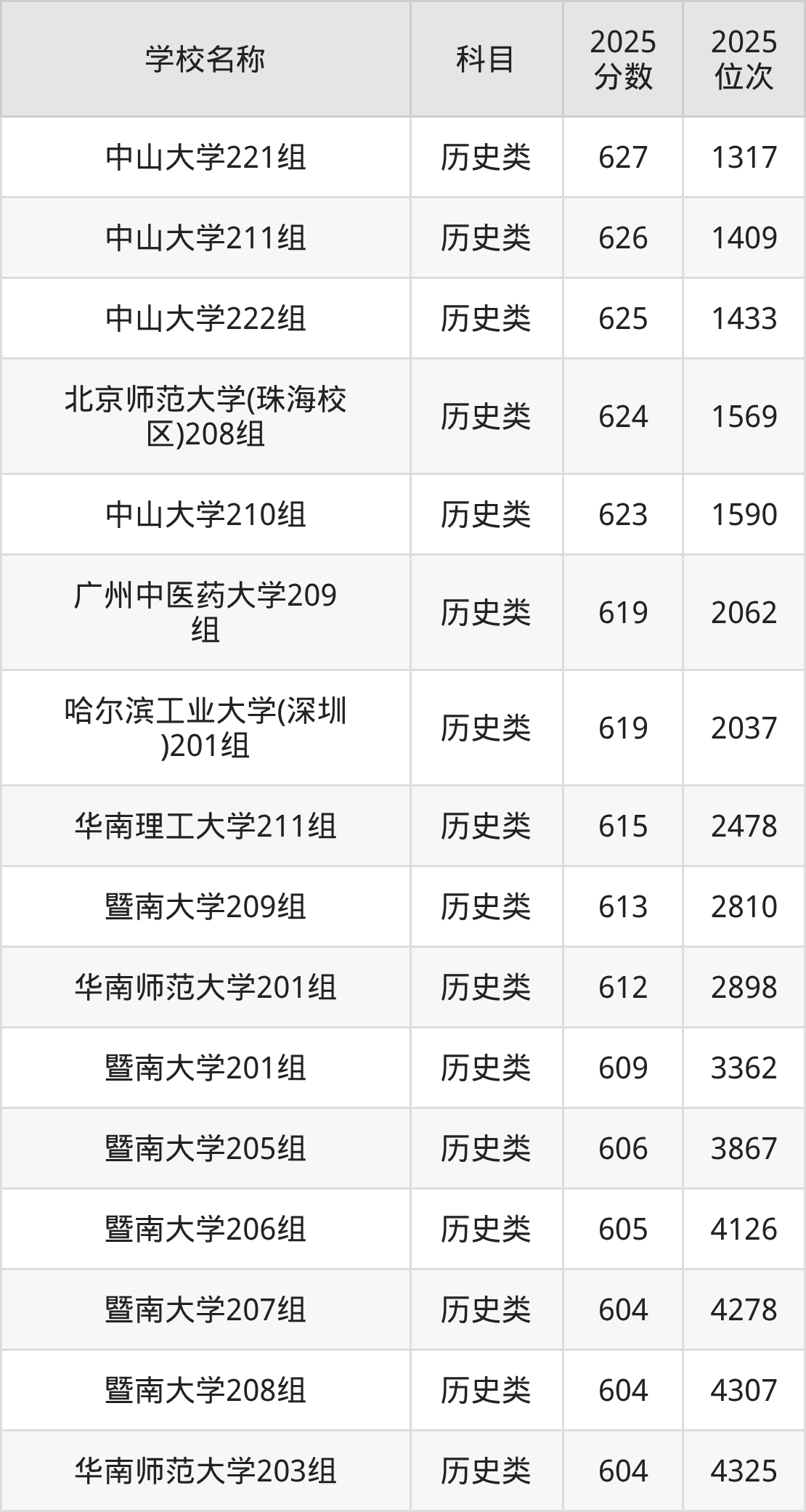 下文为2025年广东省一本大学在广东历史类录取分数线和位次排名表,供大家参考: