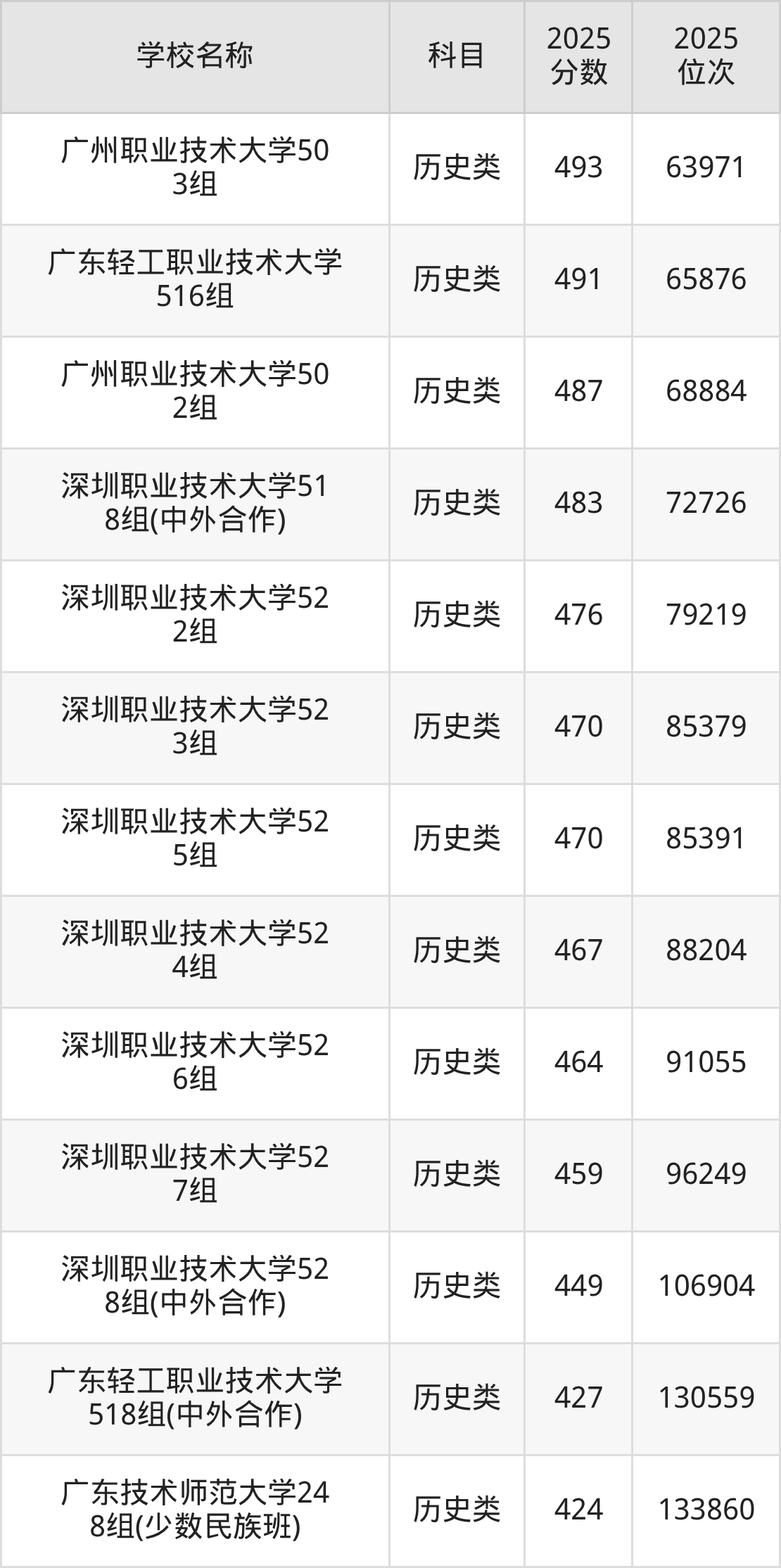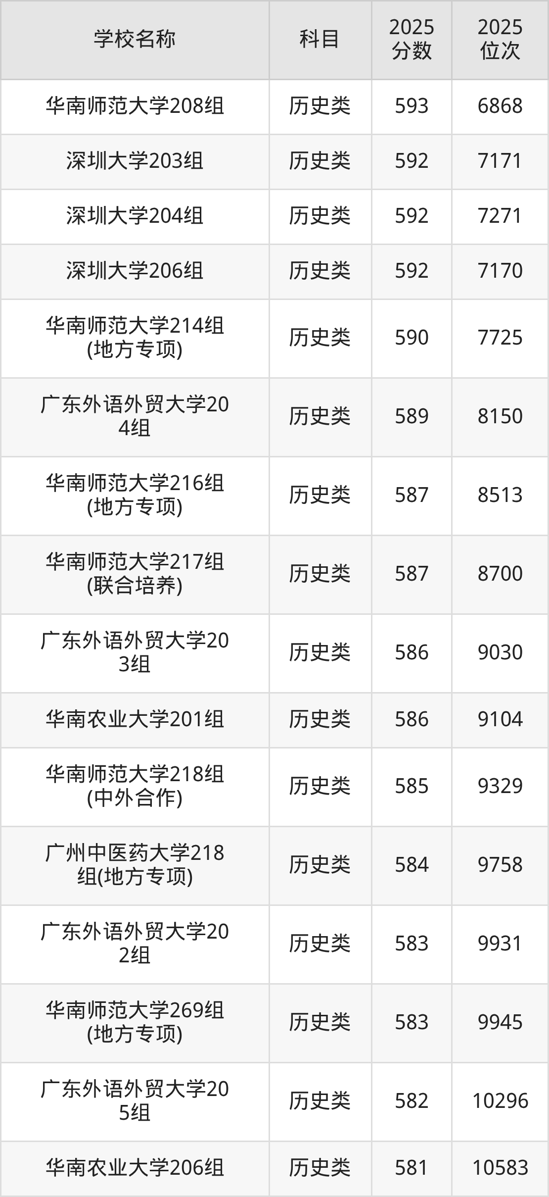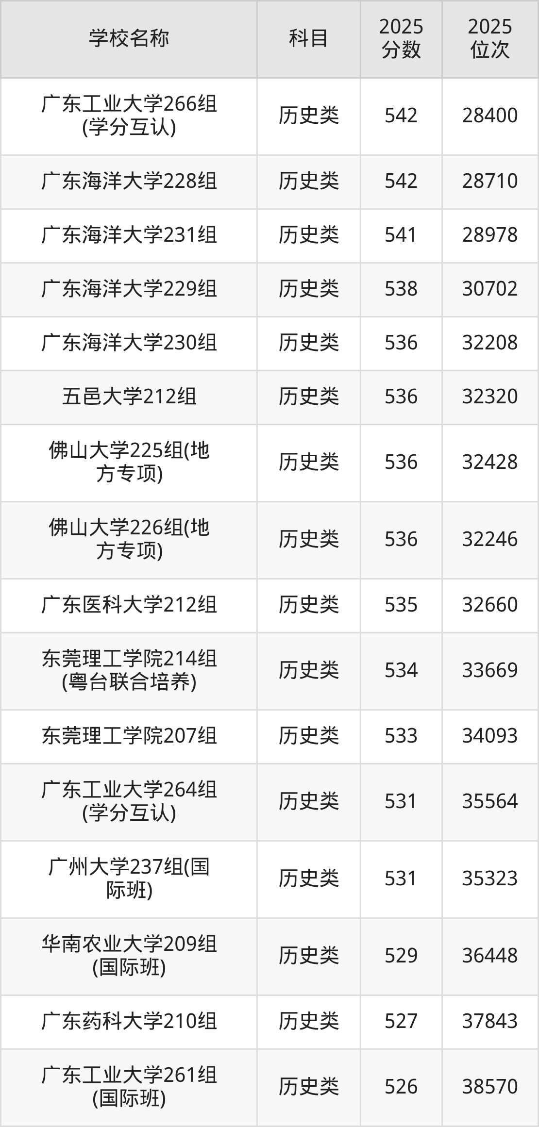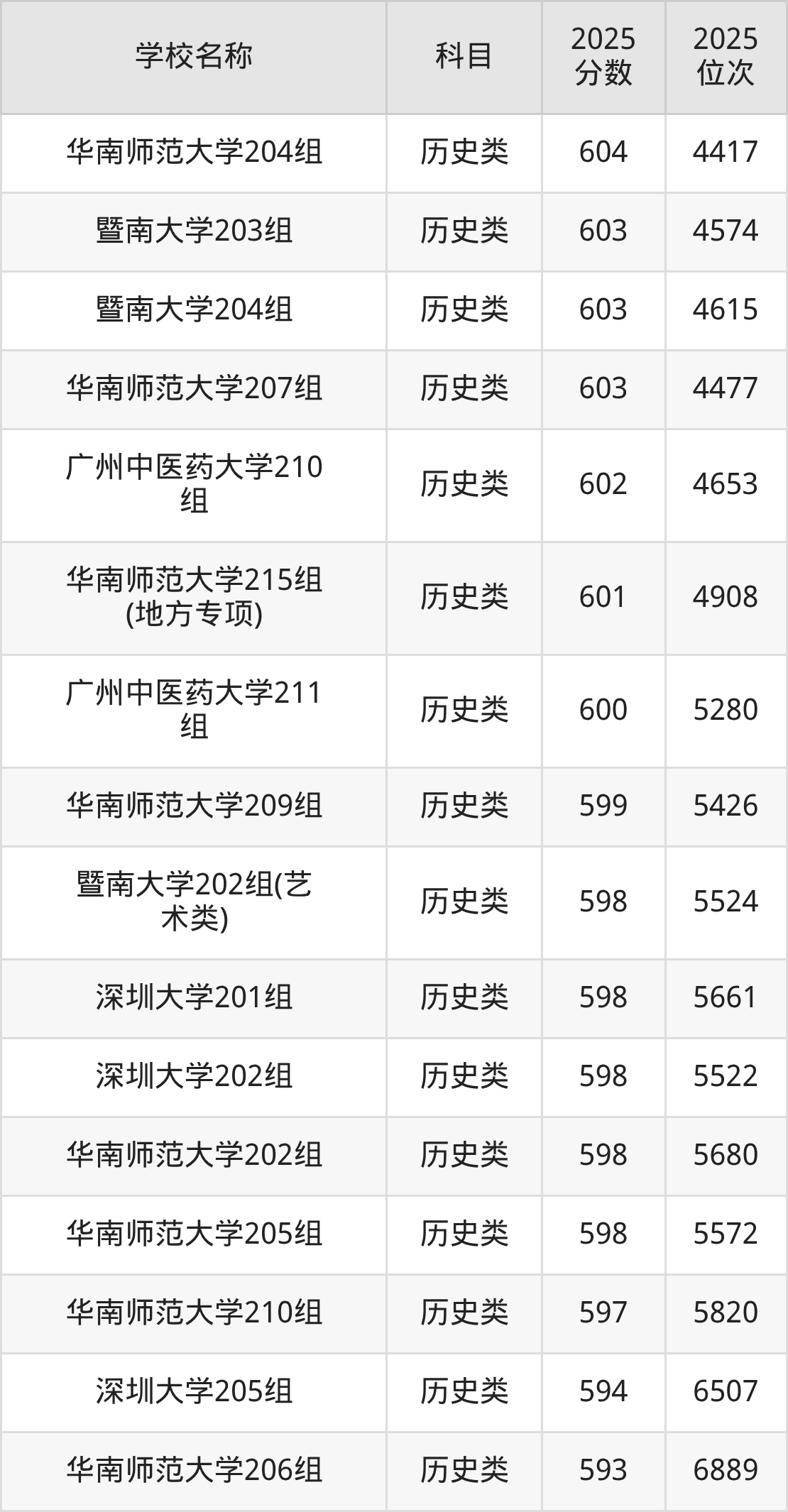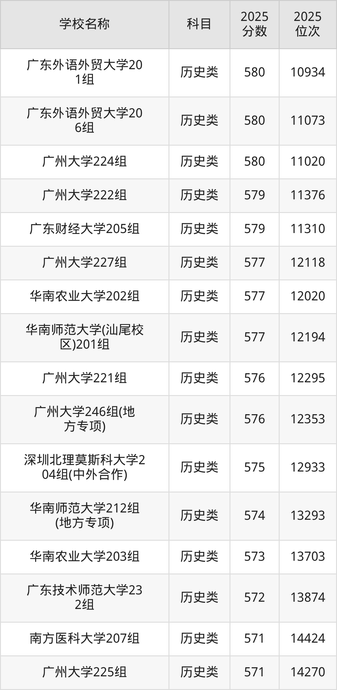 下文为2025年广东省一本大学在广东历史类录取分数线和位次排名表,供大家参考: