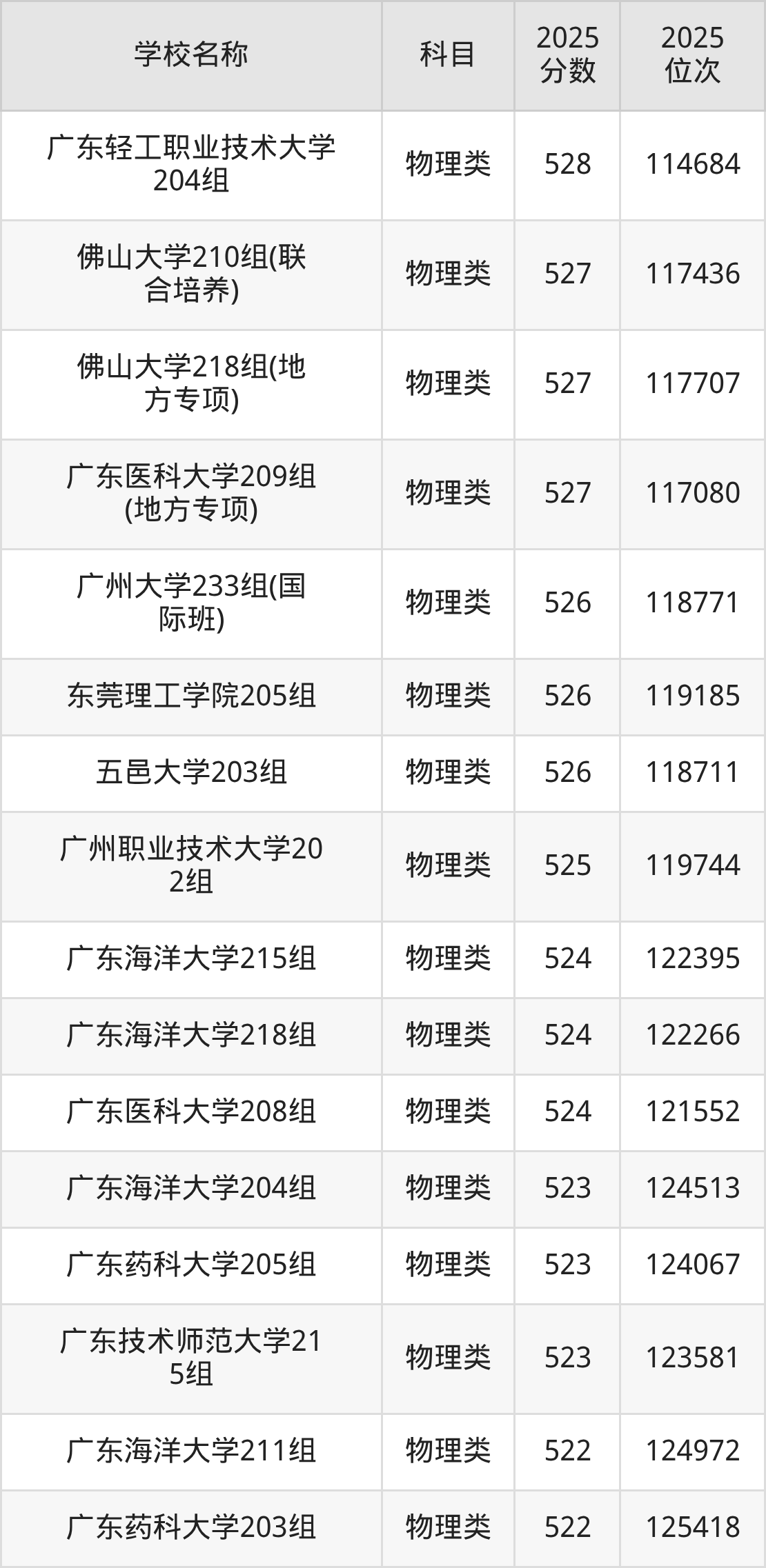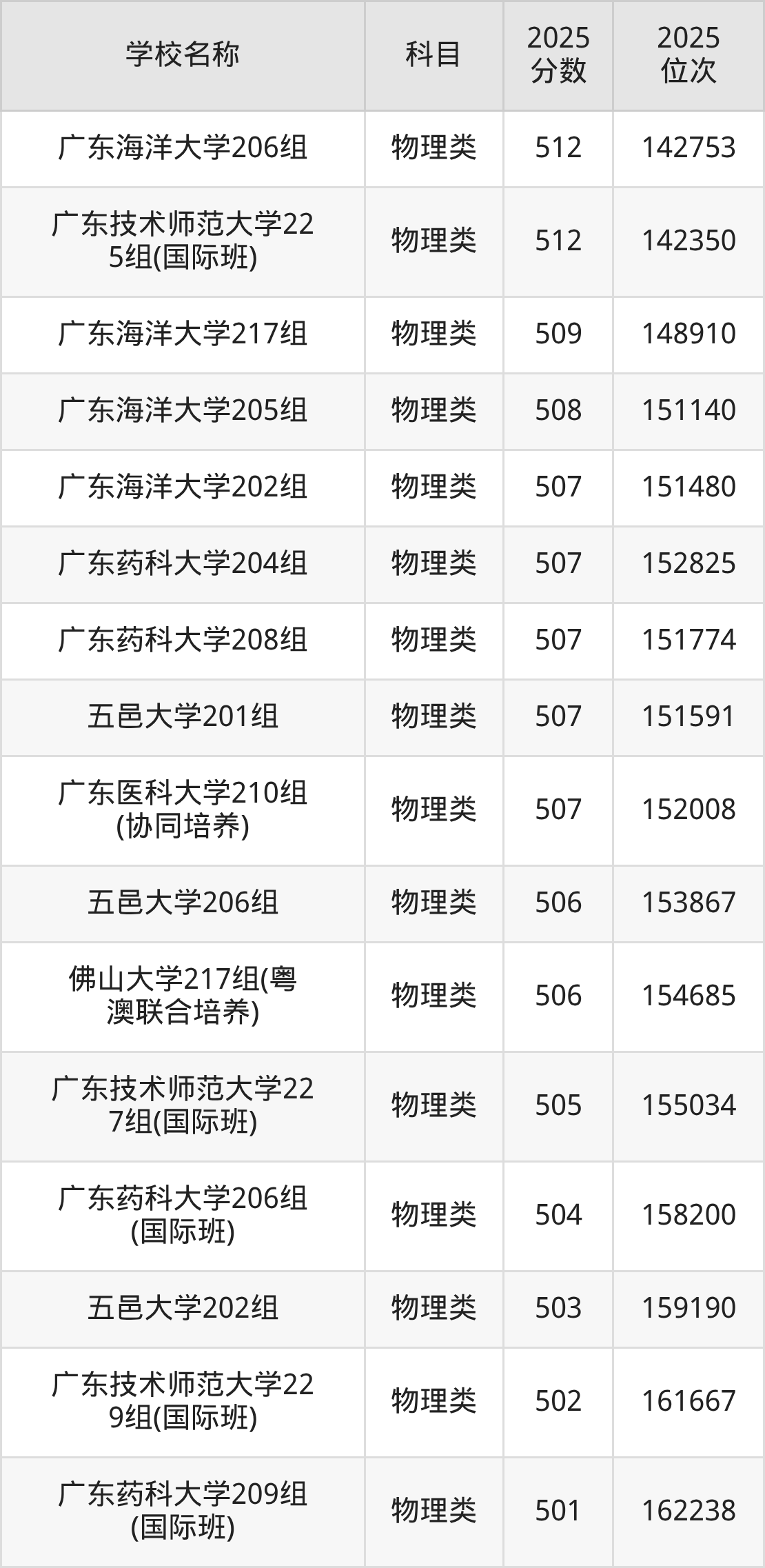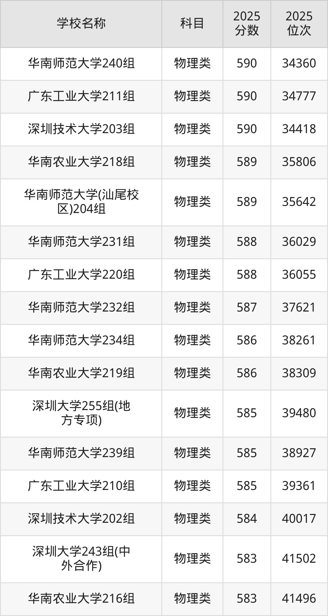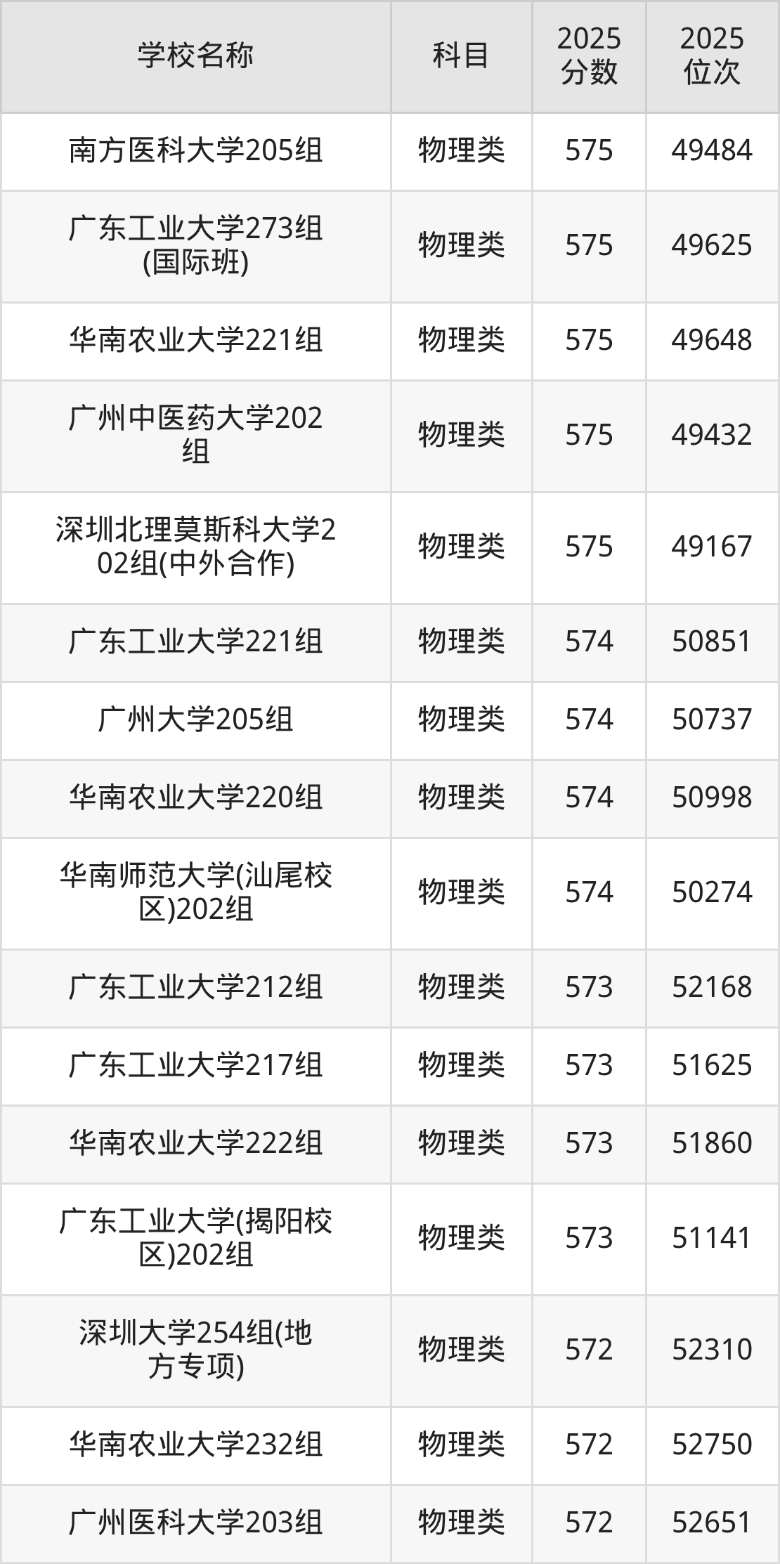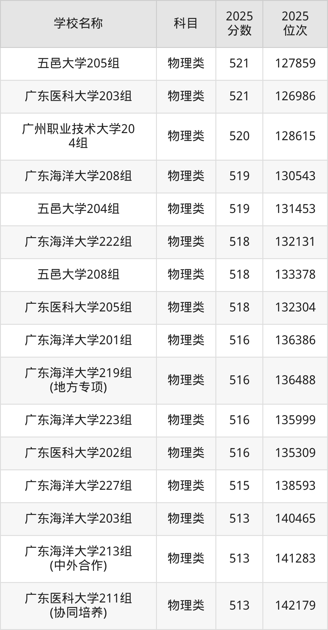 下文为2025年广东省一本大学在广东物理类录取分数线和位次排名表,供大家参考:
