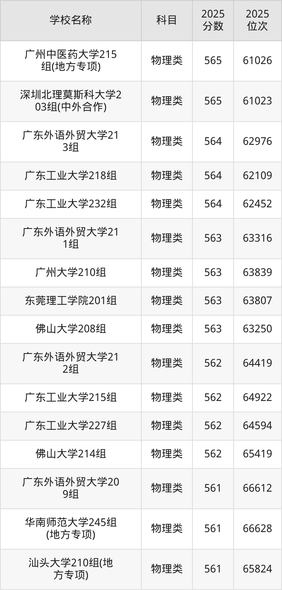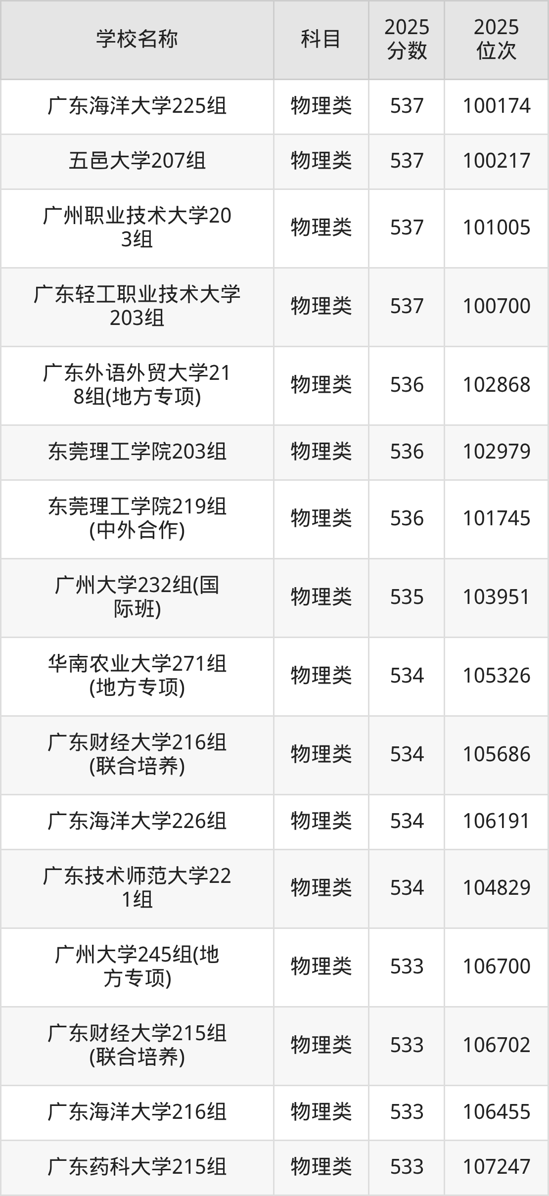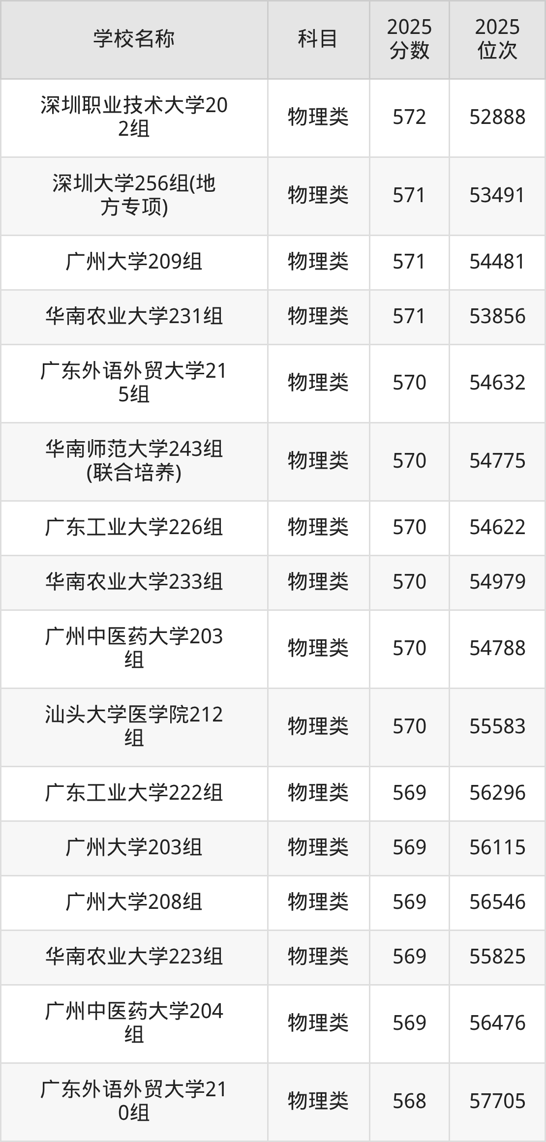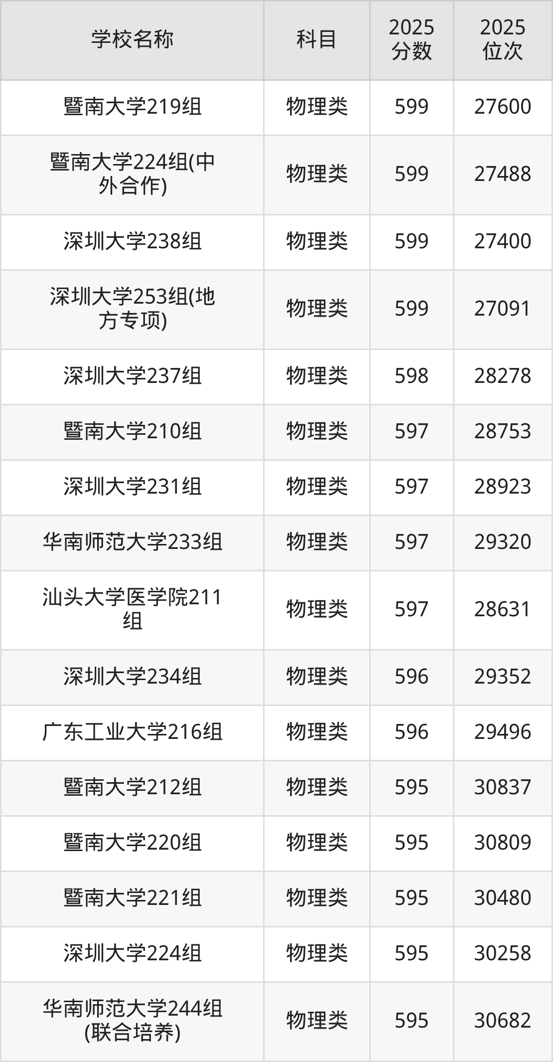 下文为2025年广东省一本大学在广东物理类录取分数线和位次排名表,供大家参考: