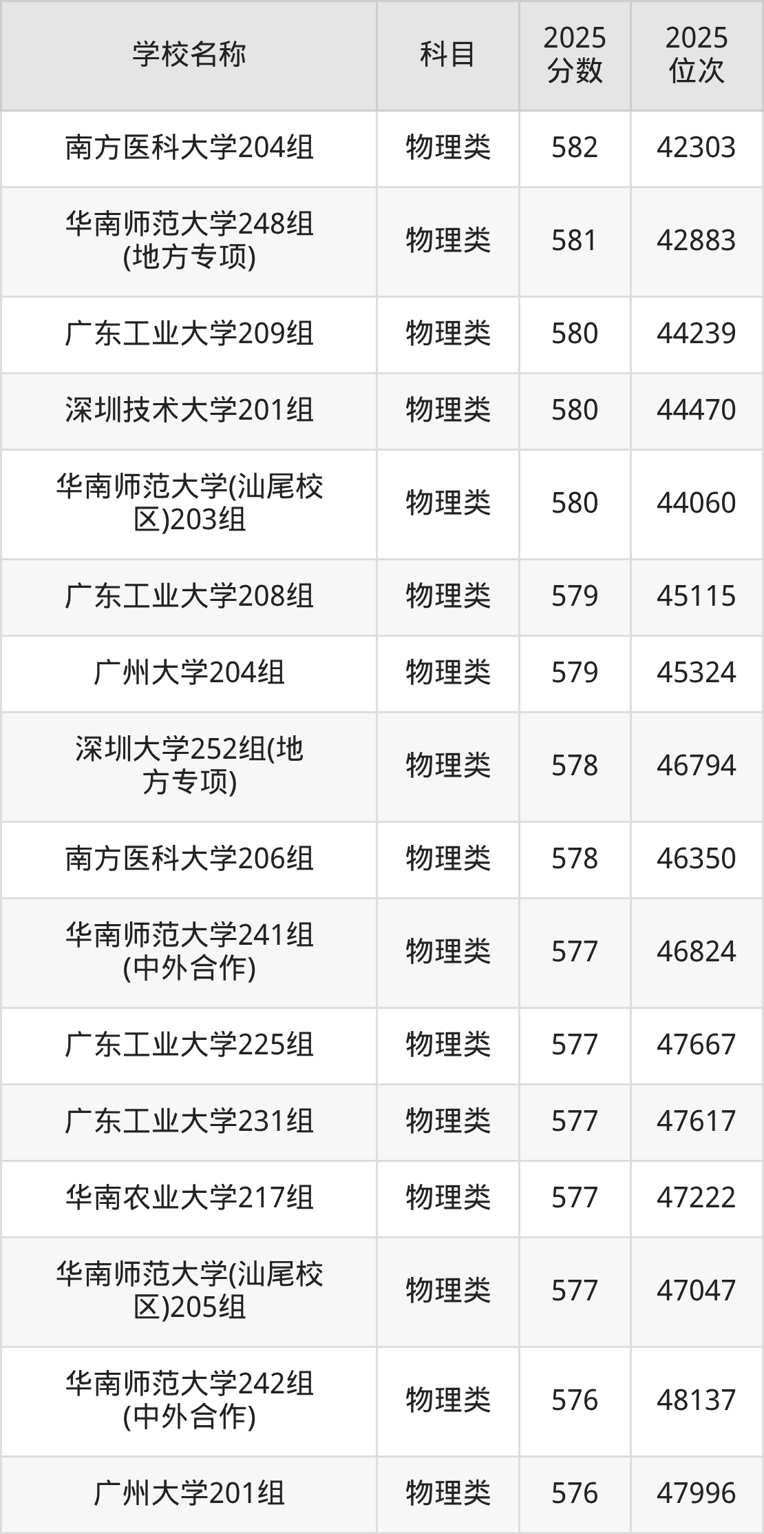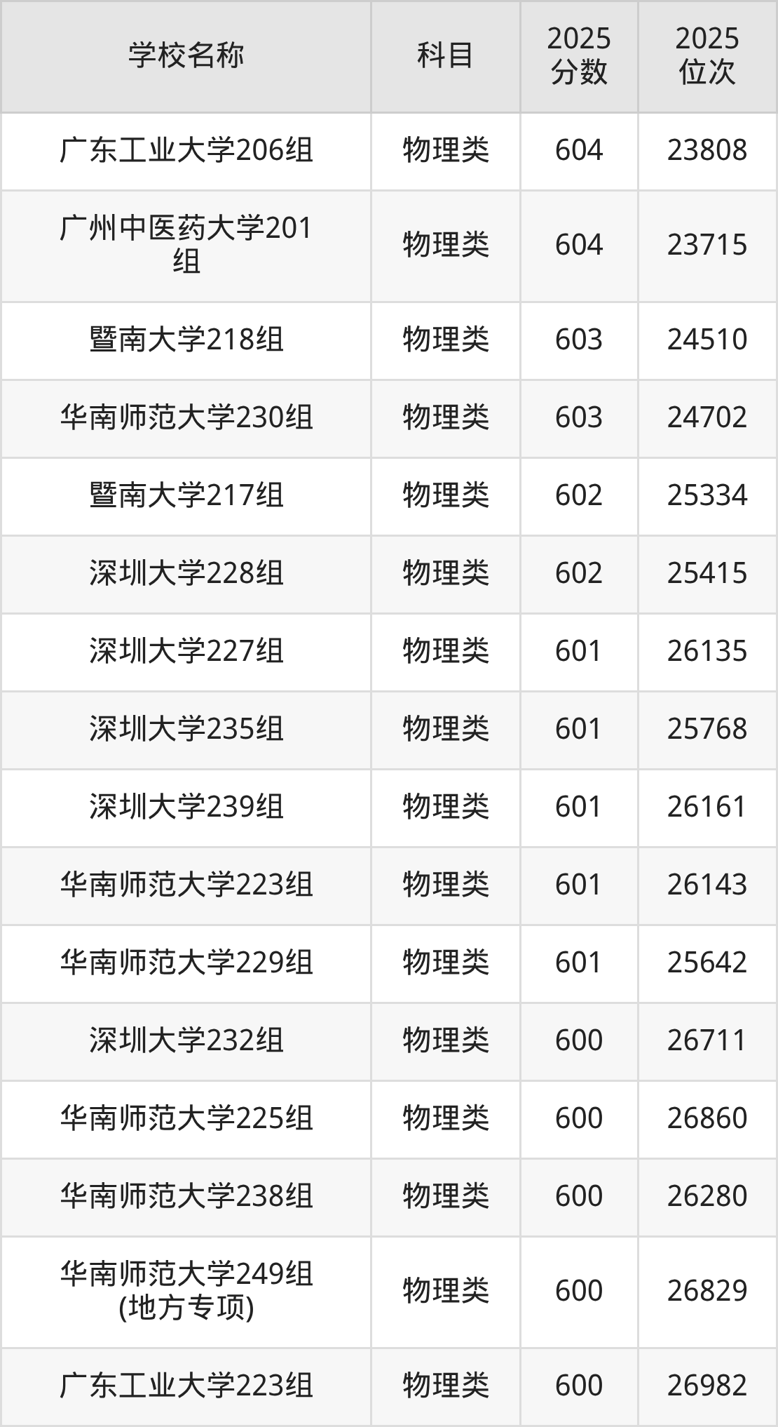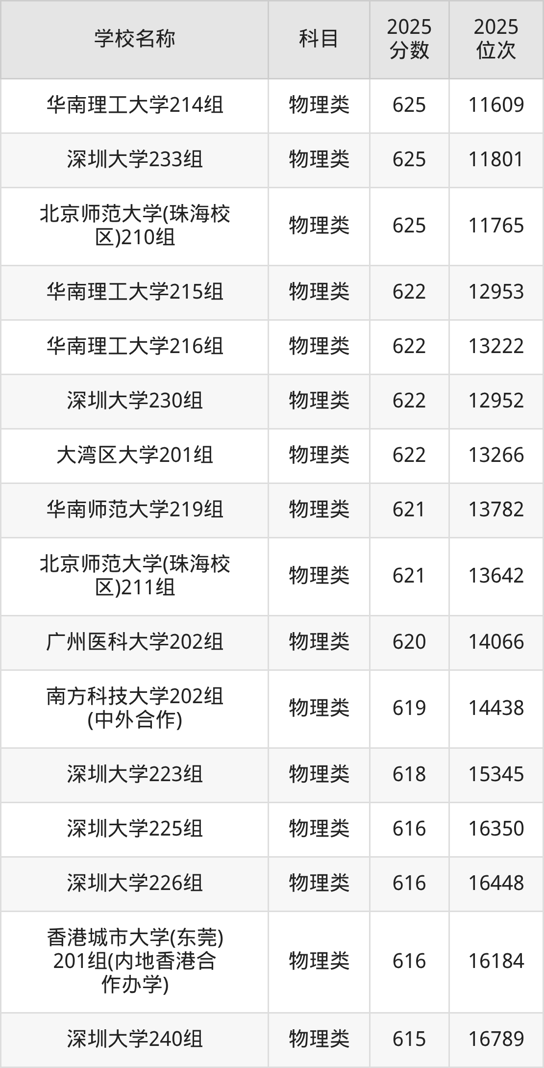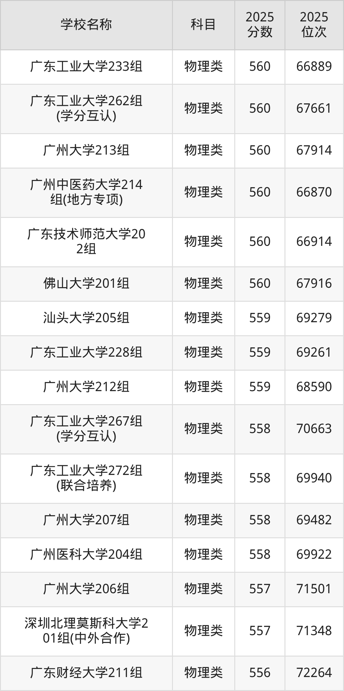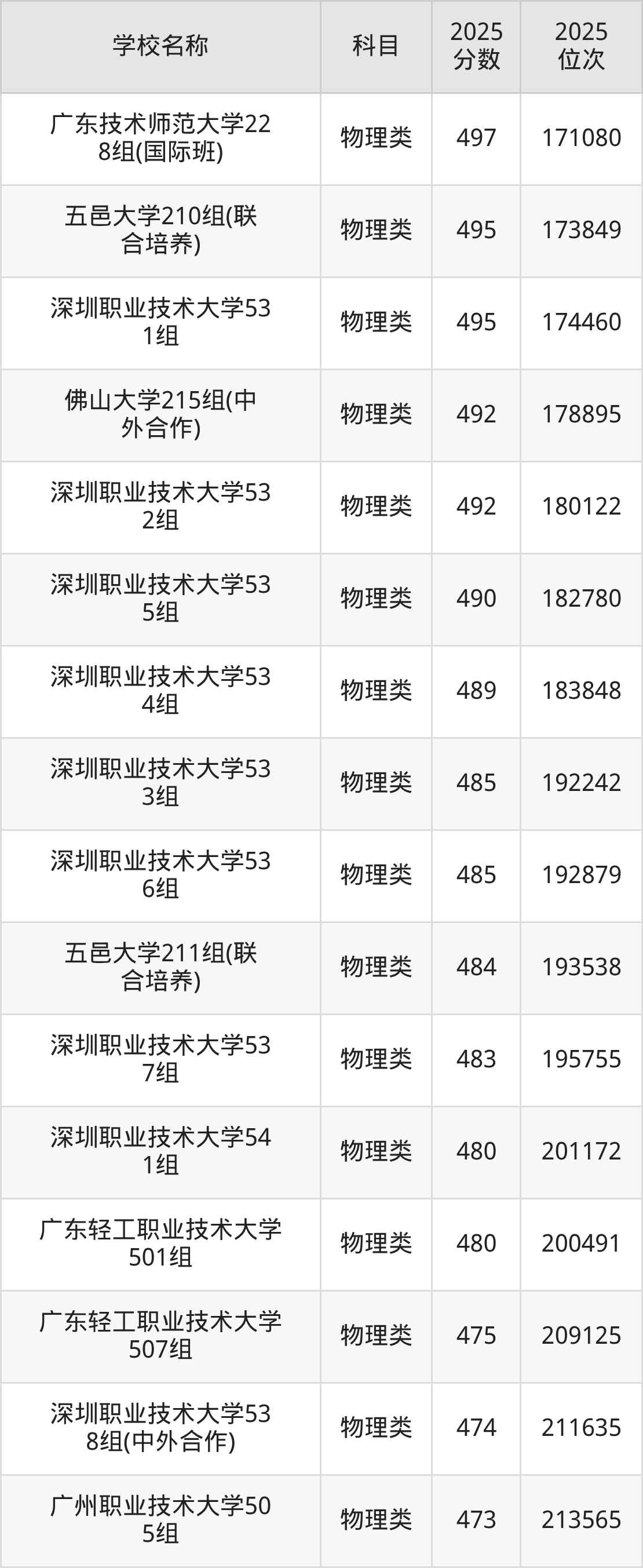 下文为2025年广东省一本大学在广东物理类录取分数线和位次排名表,供大家参考: