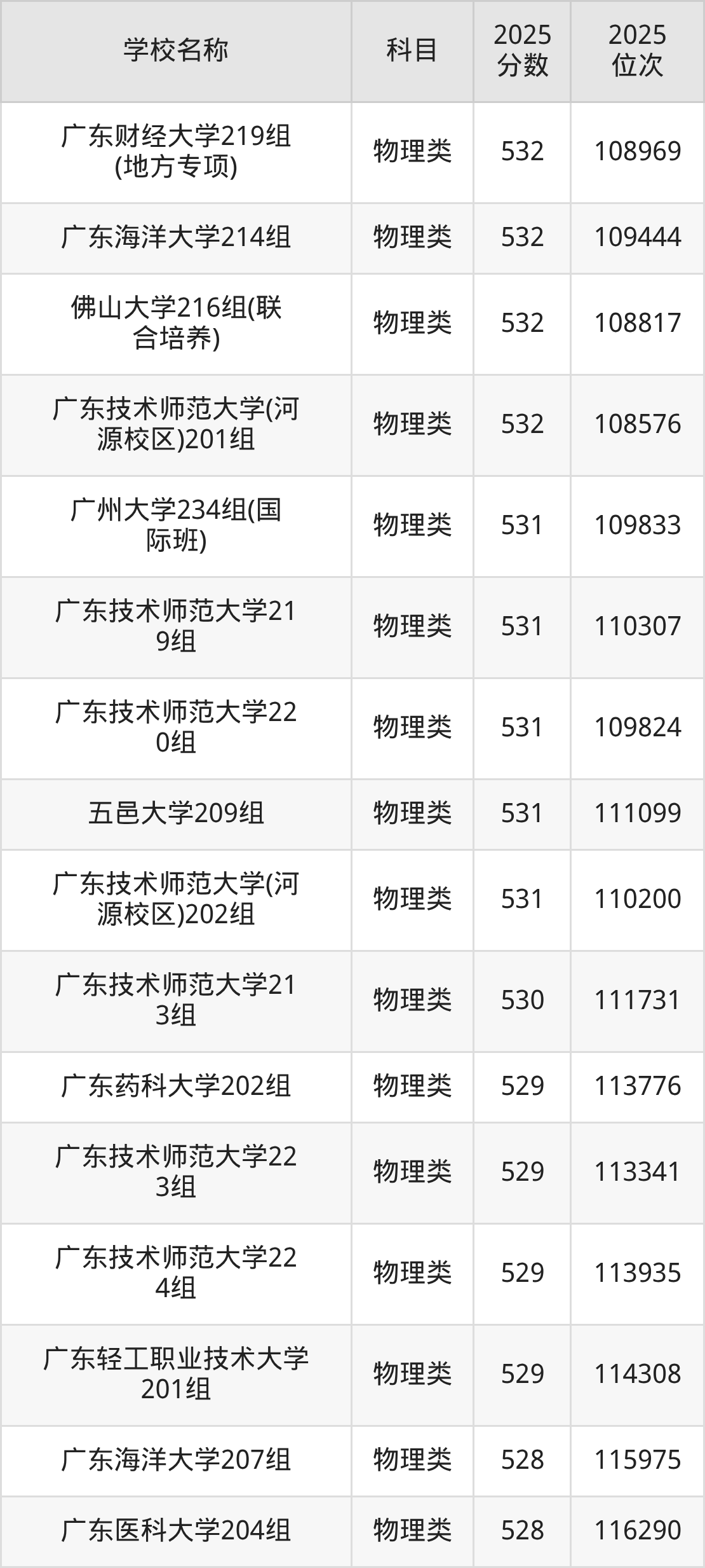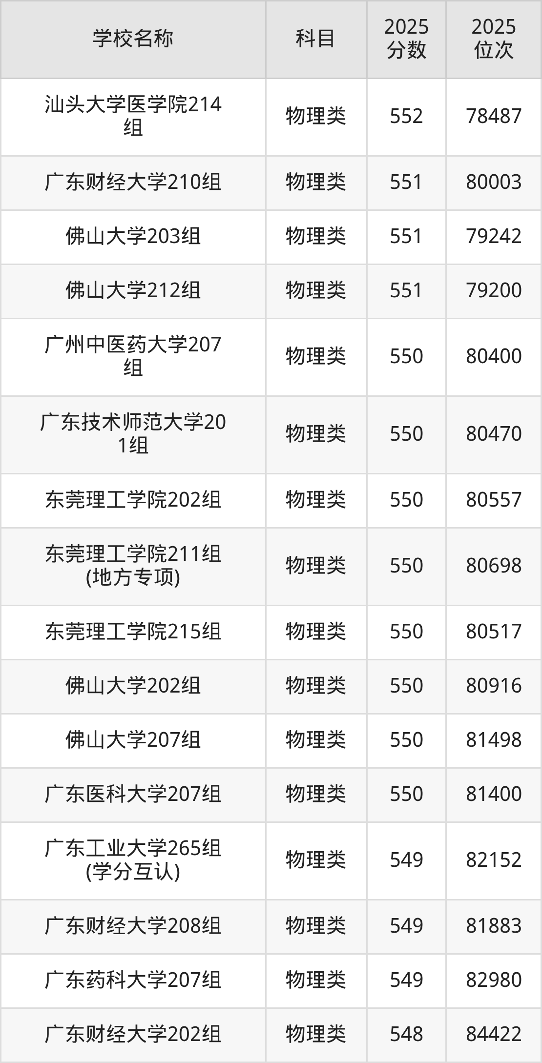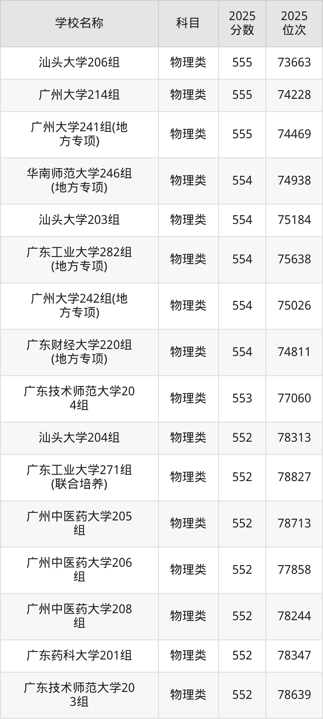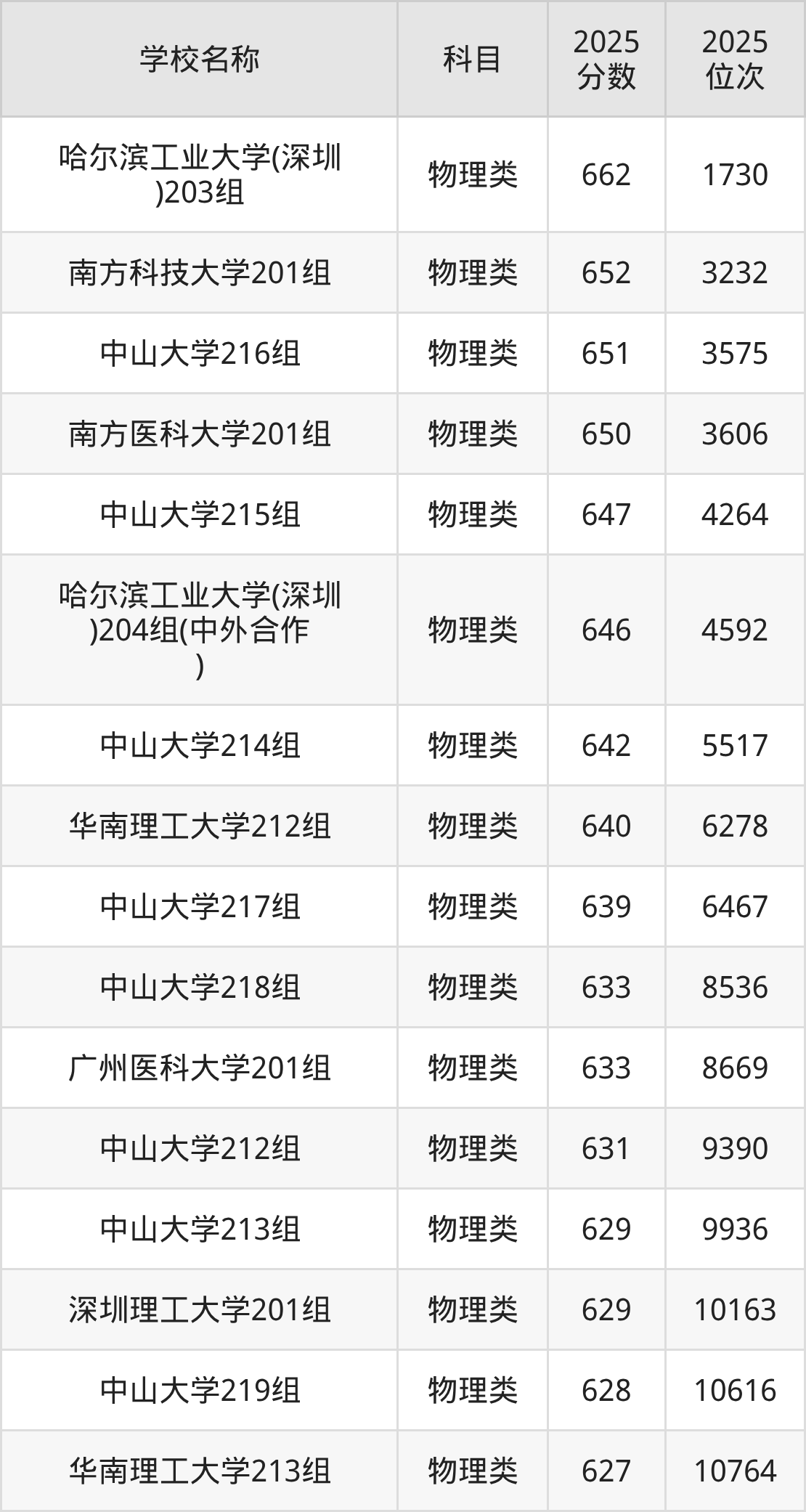 下文为2025年广东省一本大学在广东物理类录取分数线和位次排名表,供大家参考: