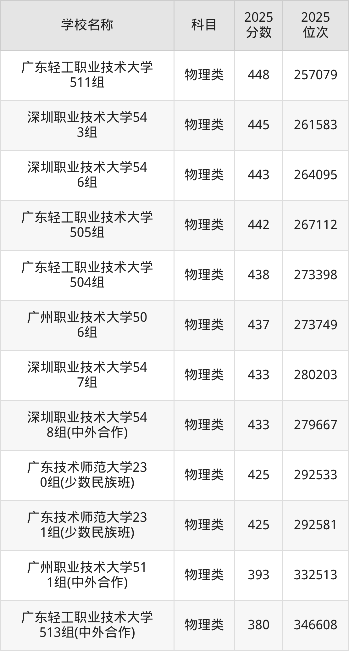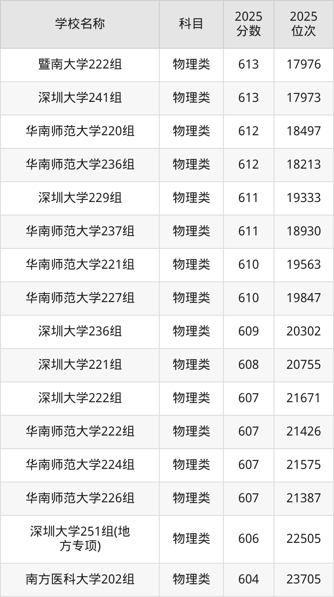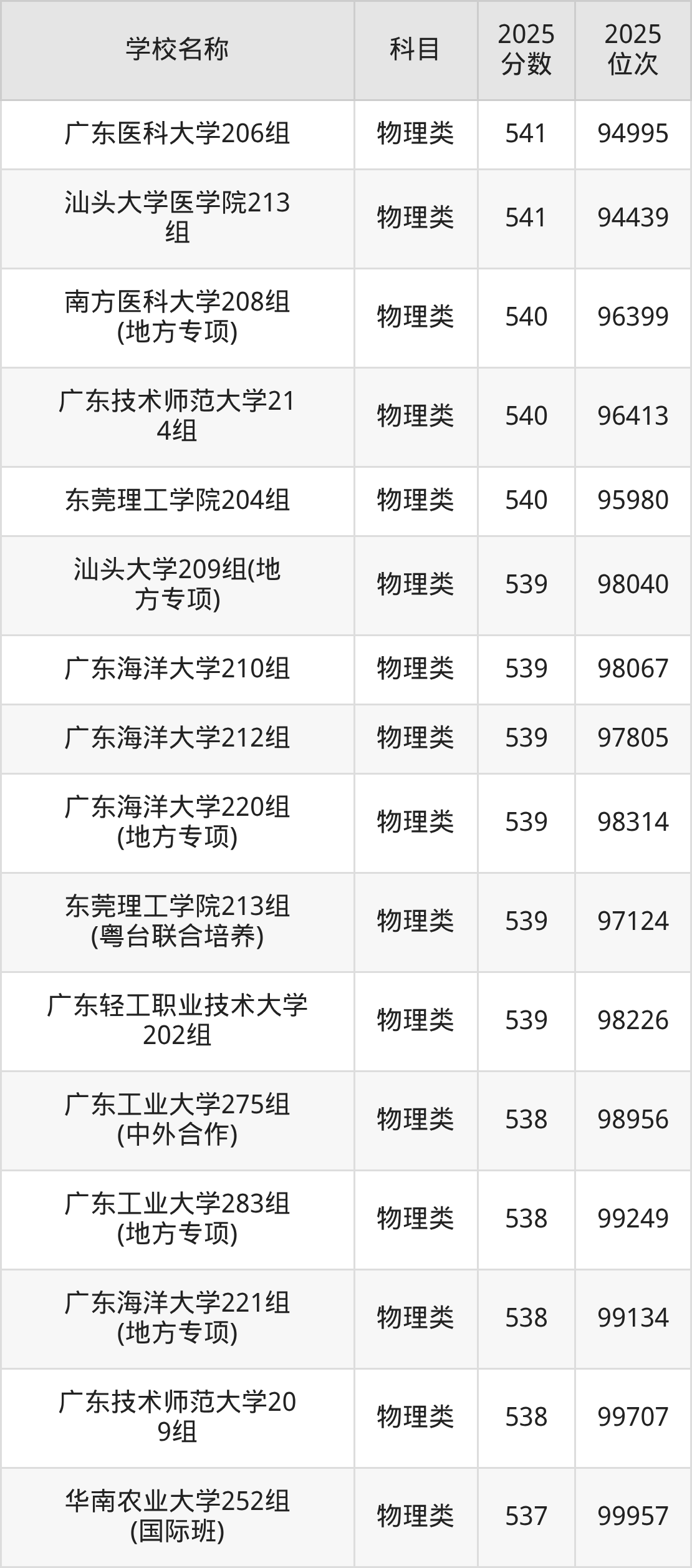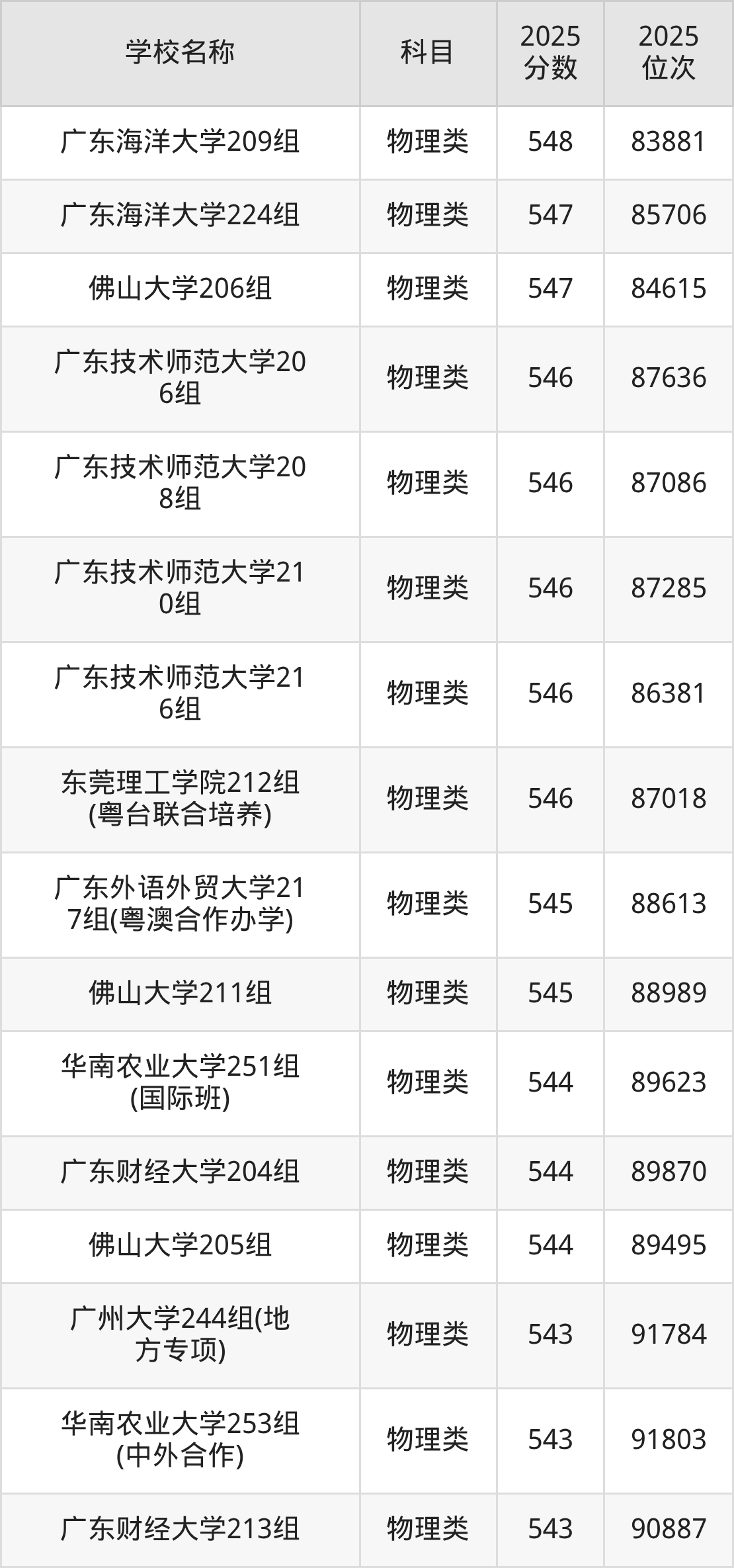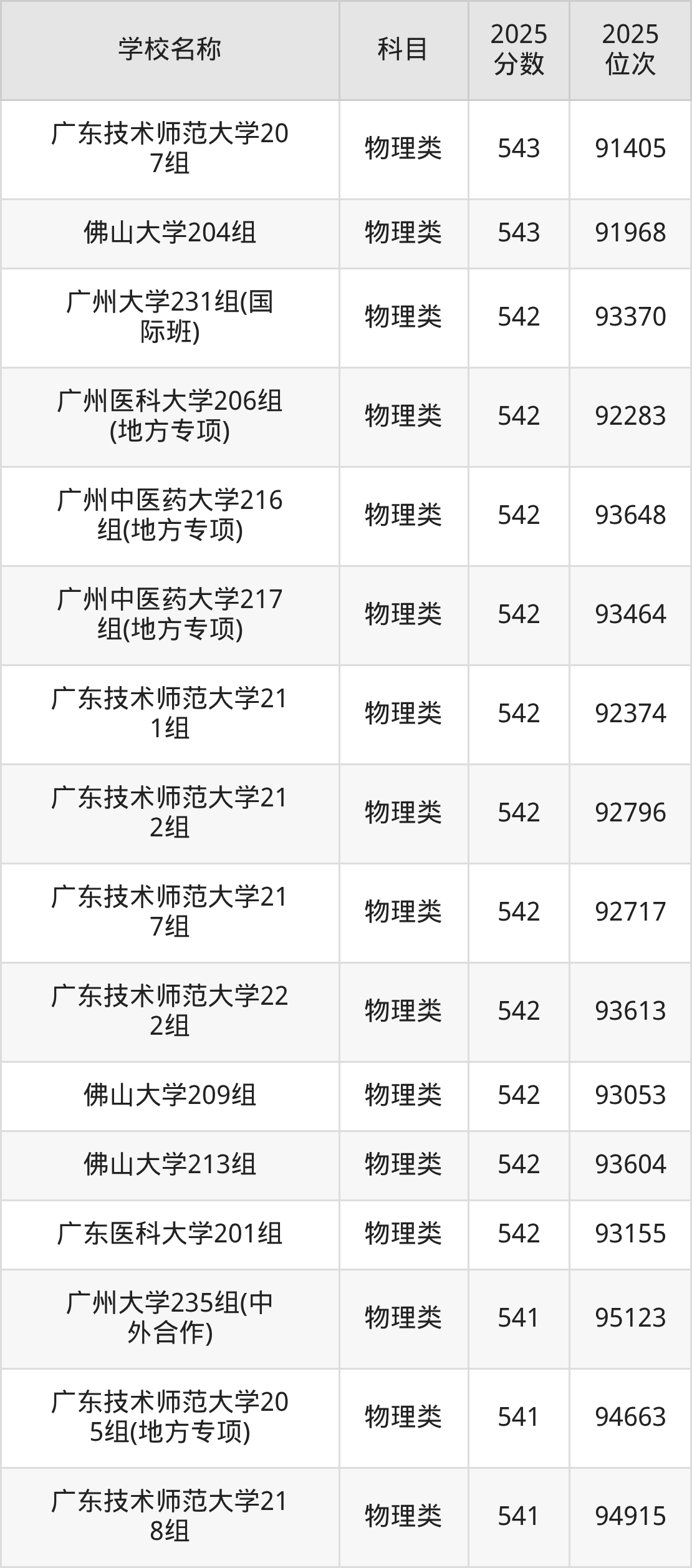 下文为2025年广东省一本大学在广东物理类录取分数线和位次排名表,供大家参考: