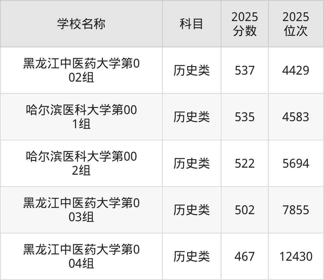 下文为2025年哈尔滨市医科大学在黑龙江历史类录取分数线和位次排名表,供大家参考: