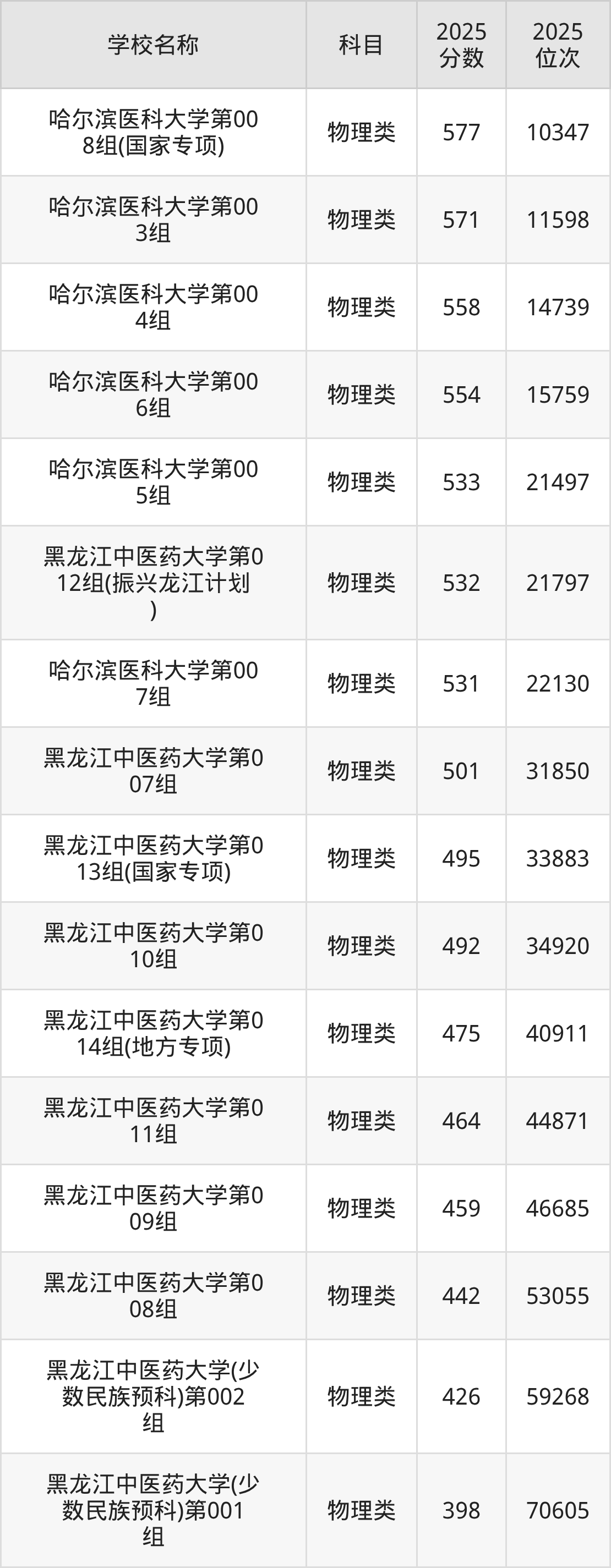 下文为2025年哈尔滨市医科大学在黑龙江物理类录取分数线和位次排名表,供大家参考: