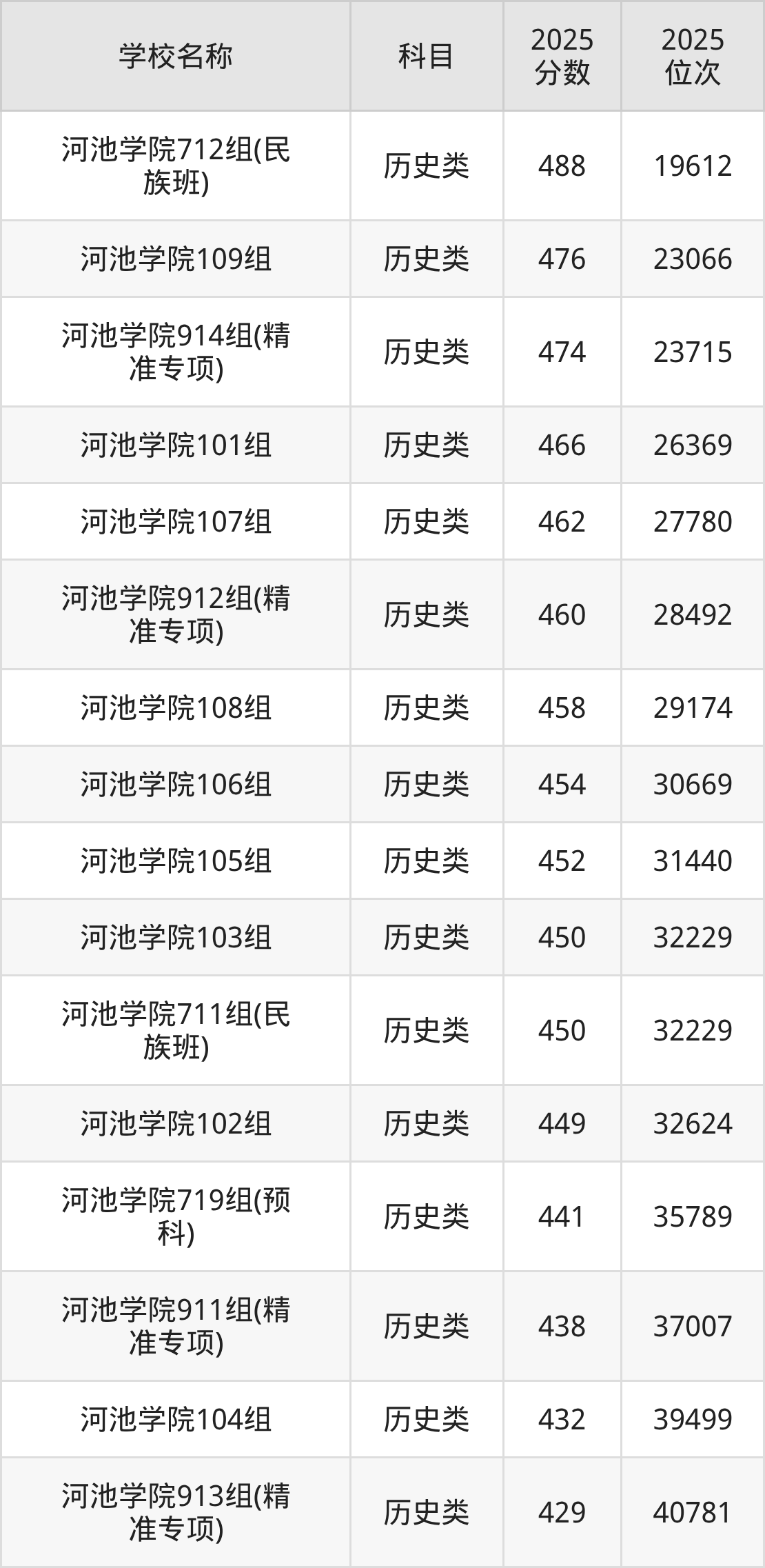 下文为2025年河池市本科大学在广西历史类录取分数线和位次排名表,供大家参考: