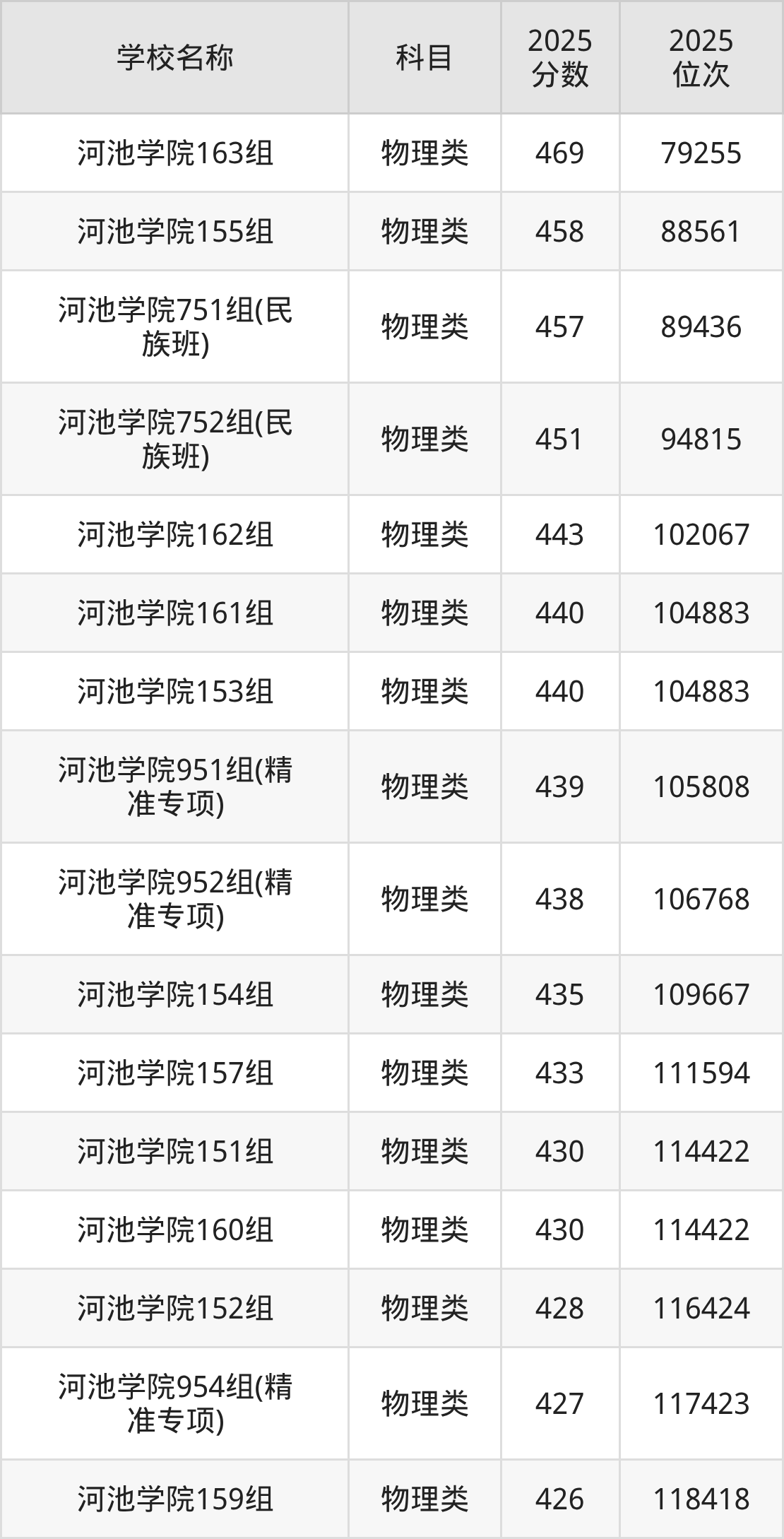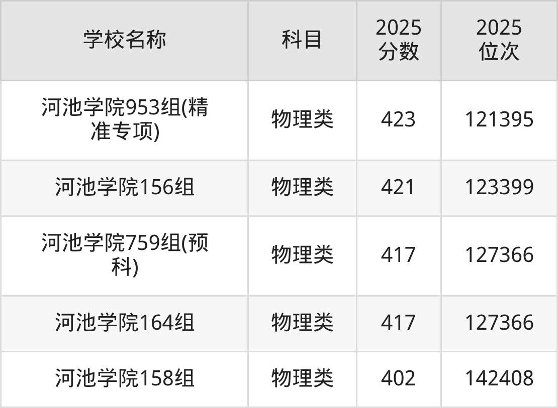 下文为2025年河池市本科大学在广西物理类录取分数线和位次排名表,供大家参考: