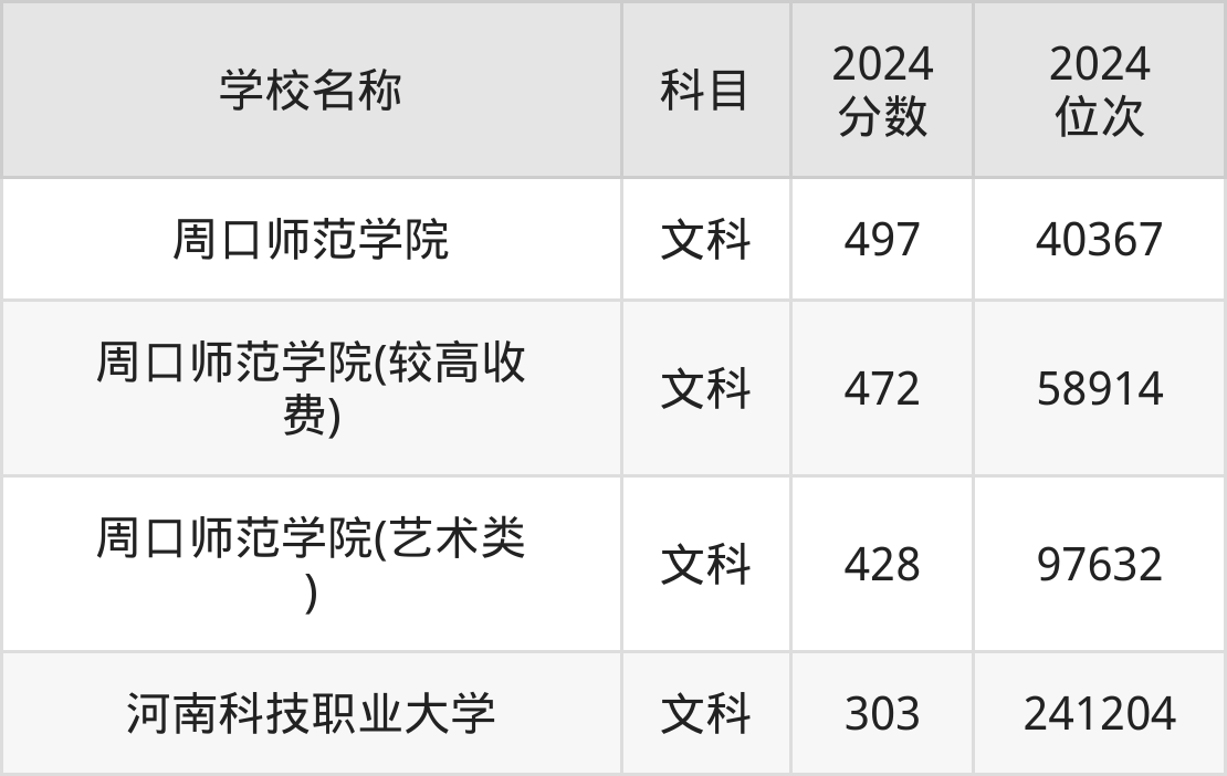 下文为2024年周口市本科大学在河南文科录取分数线和位次排名表,供大家参考: