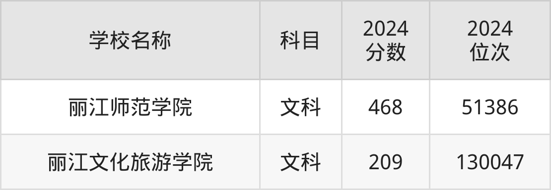 下文为2024年丽江市本科大学在云南文科录取分数线和位次排名表,供大家参考: