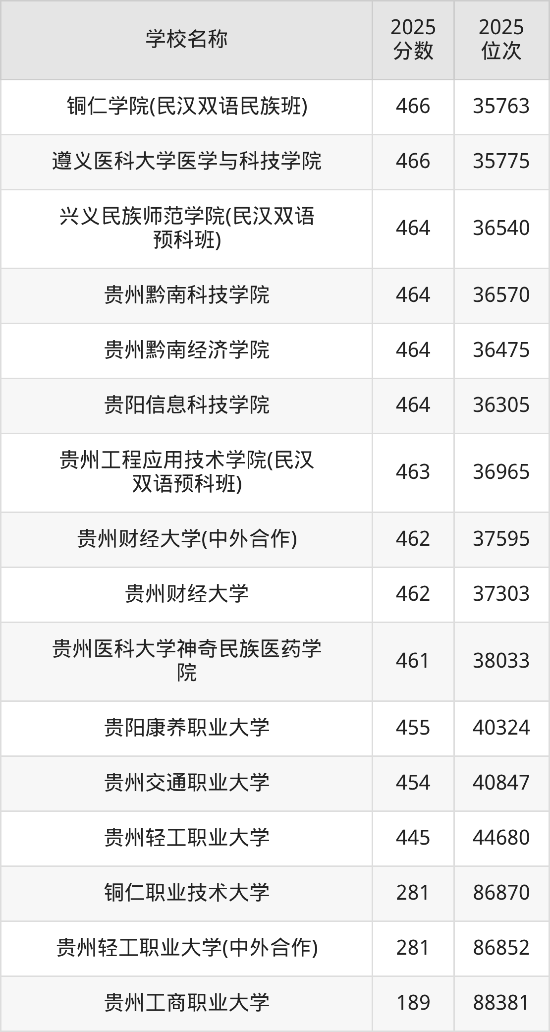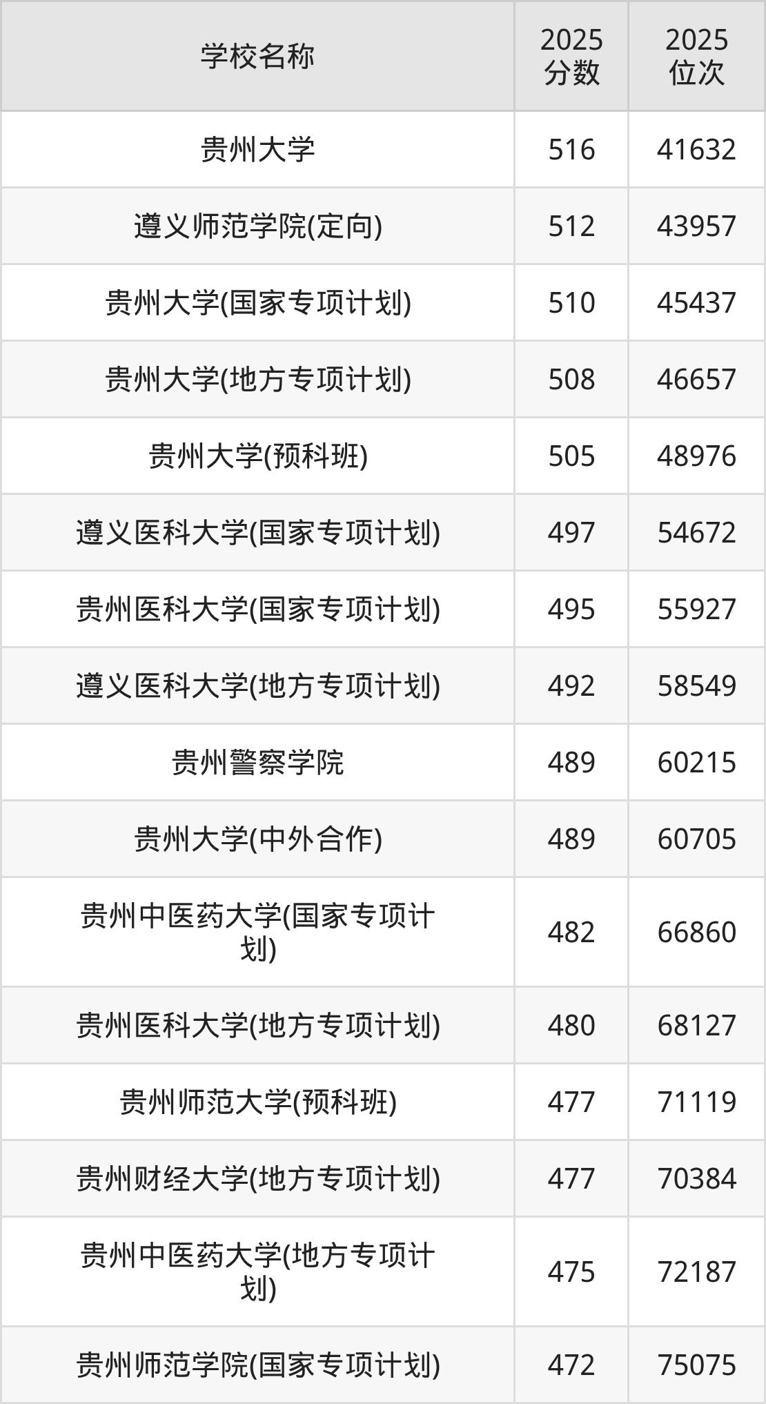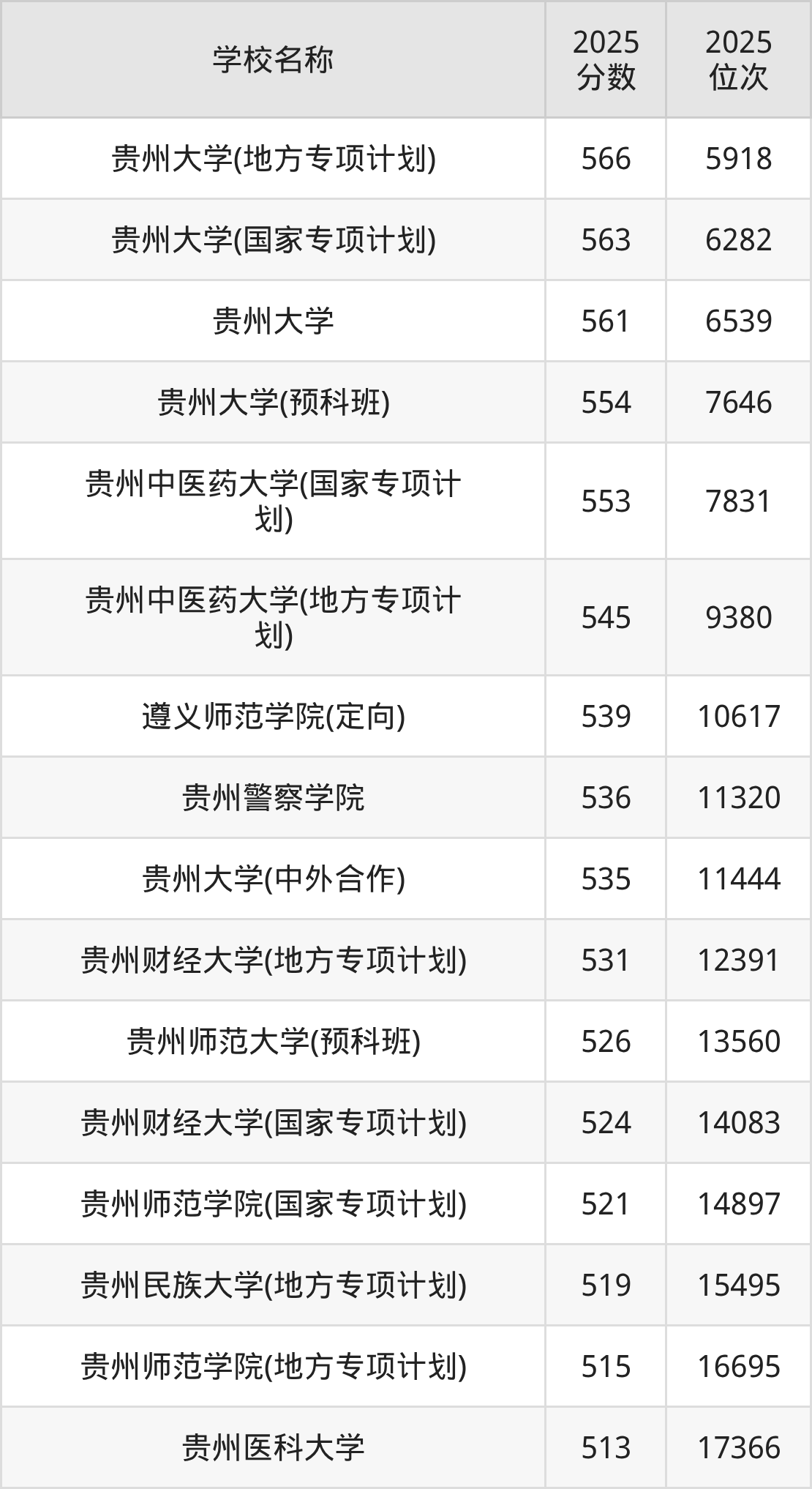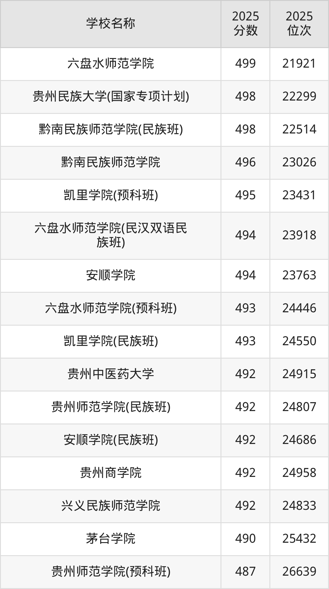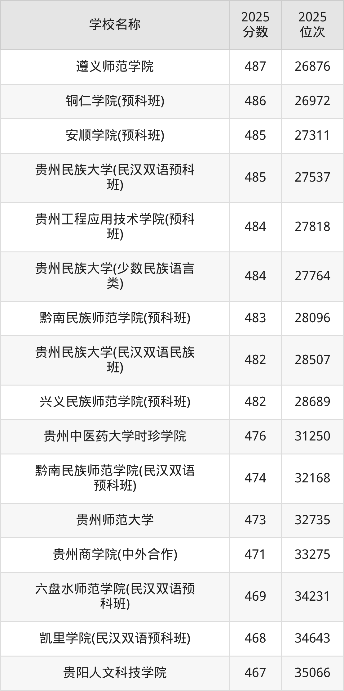 下文为2025年贵州省本科大学在贵州历史类录取分数线和位次排名表,供大家参考: