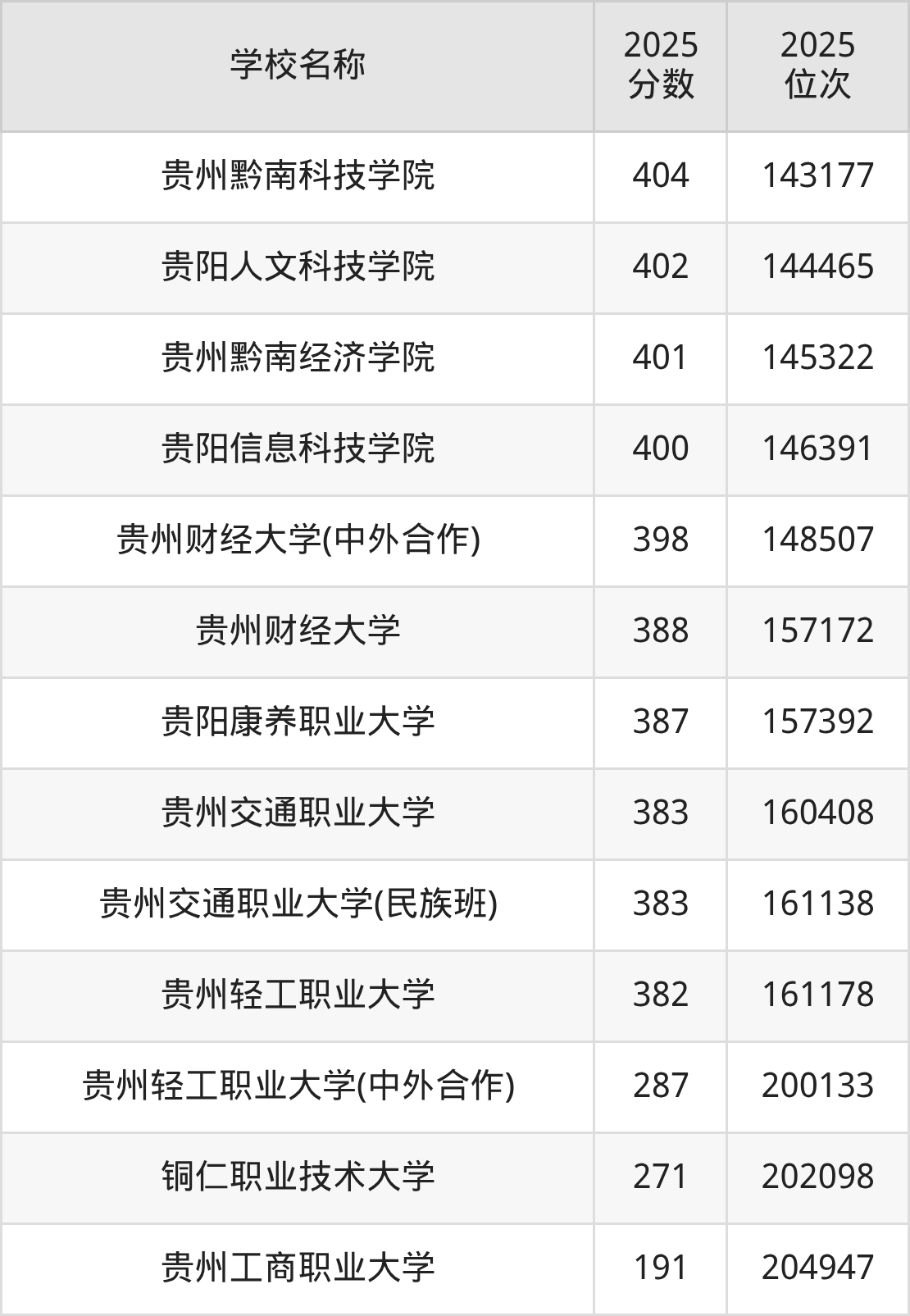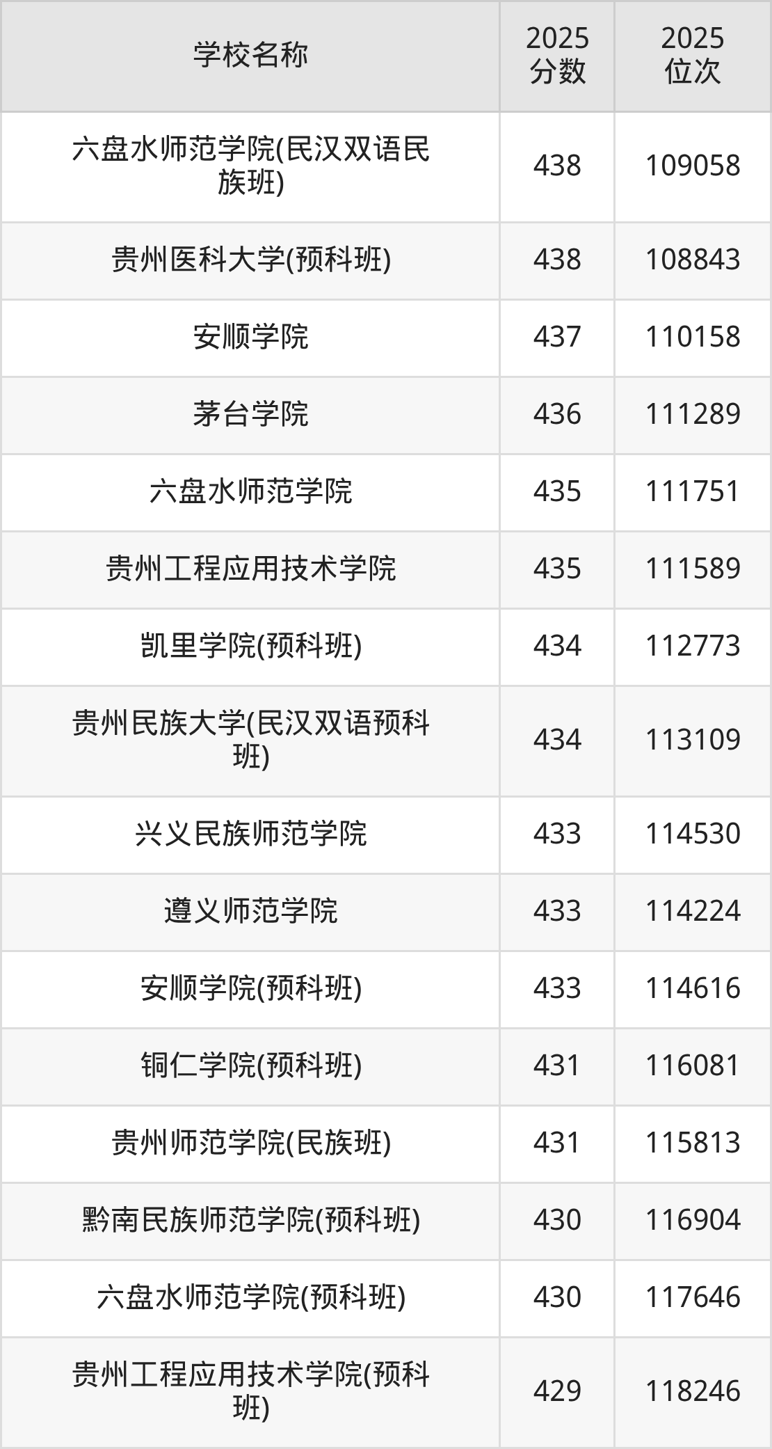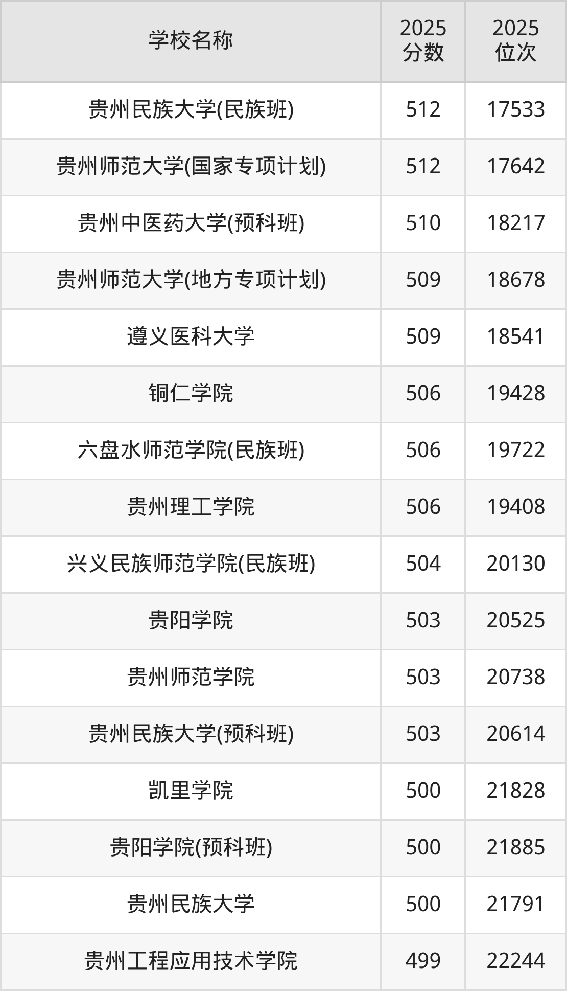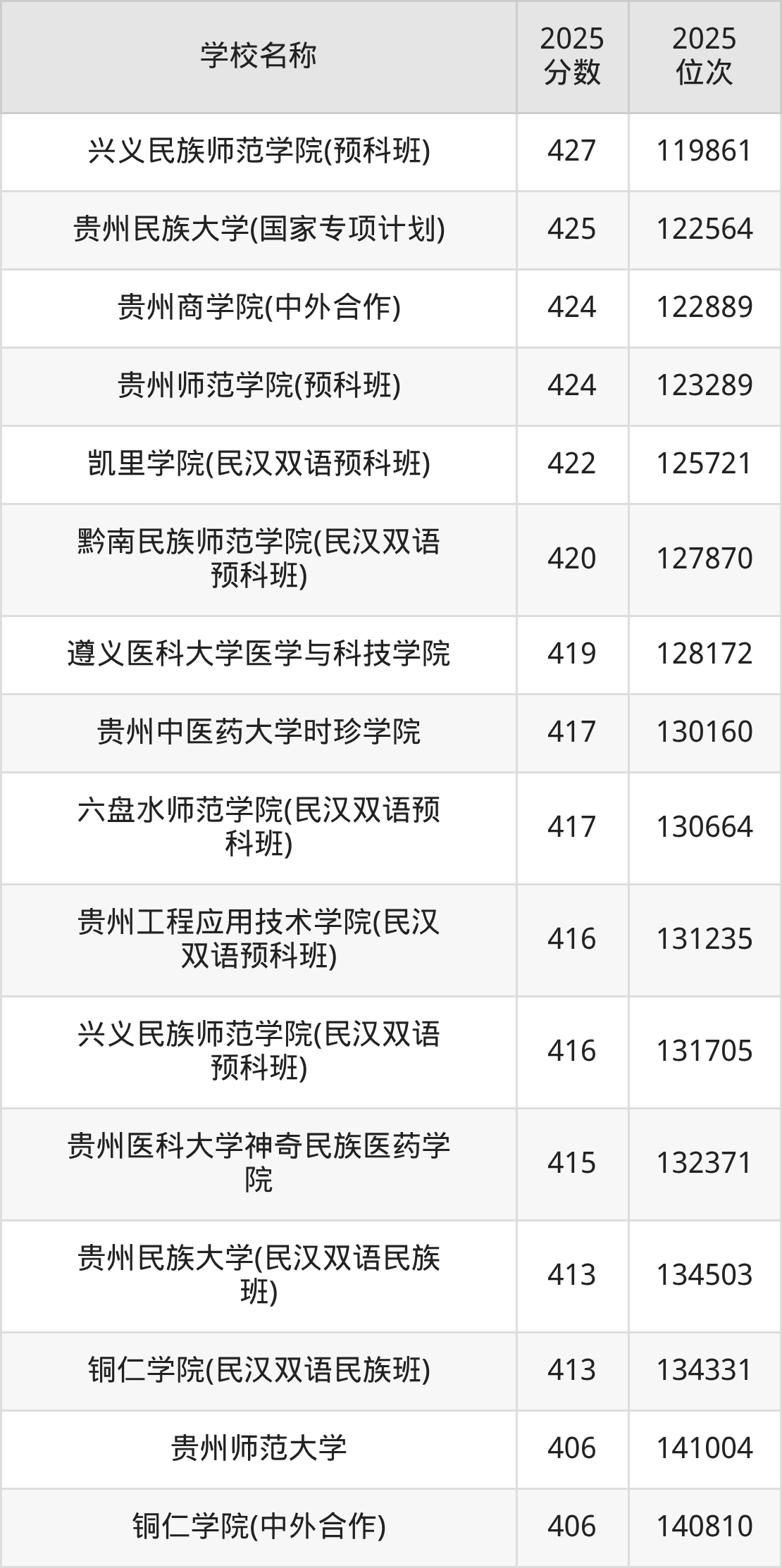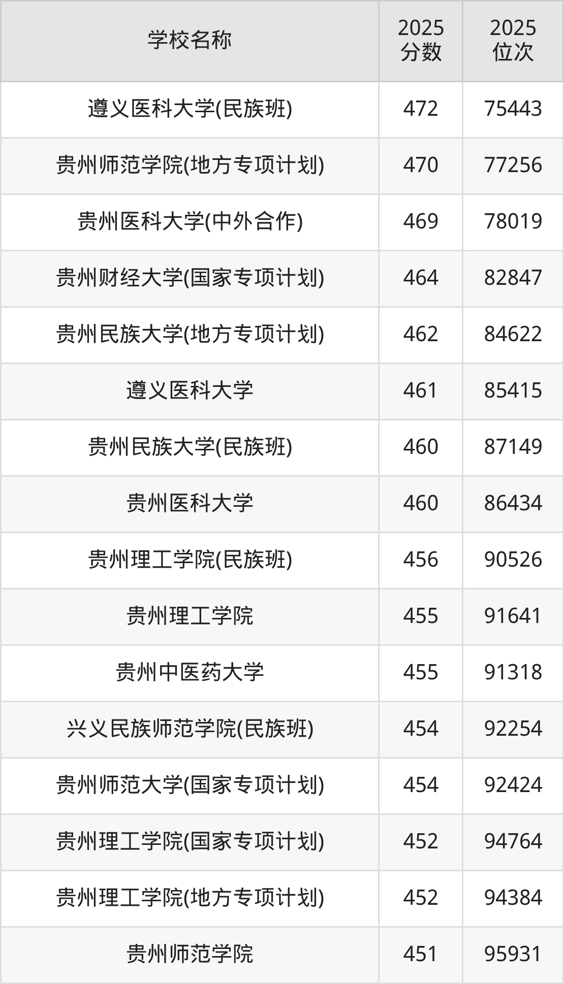 下文为2025年贵州省本科大学在贵州历史类录取分数线和位次排名表,供大家参考: