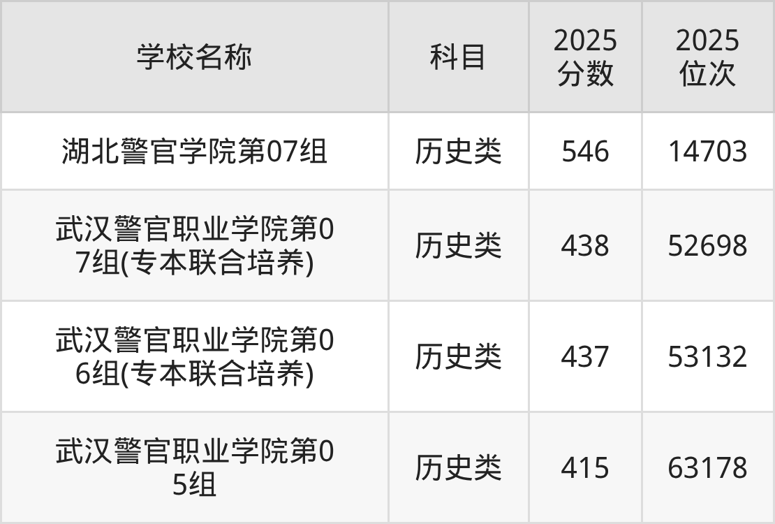 下文为2025年武汉市公安警察大学在湖北历史类录取分数线和位次排名表,供大家参考: