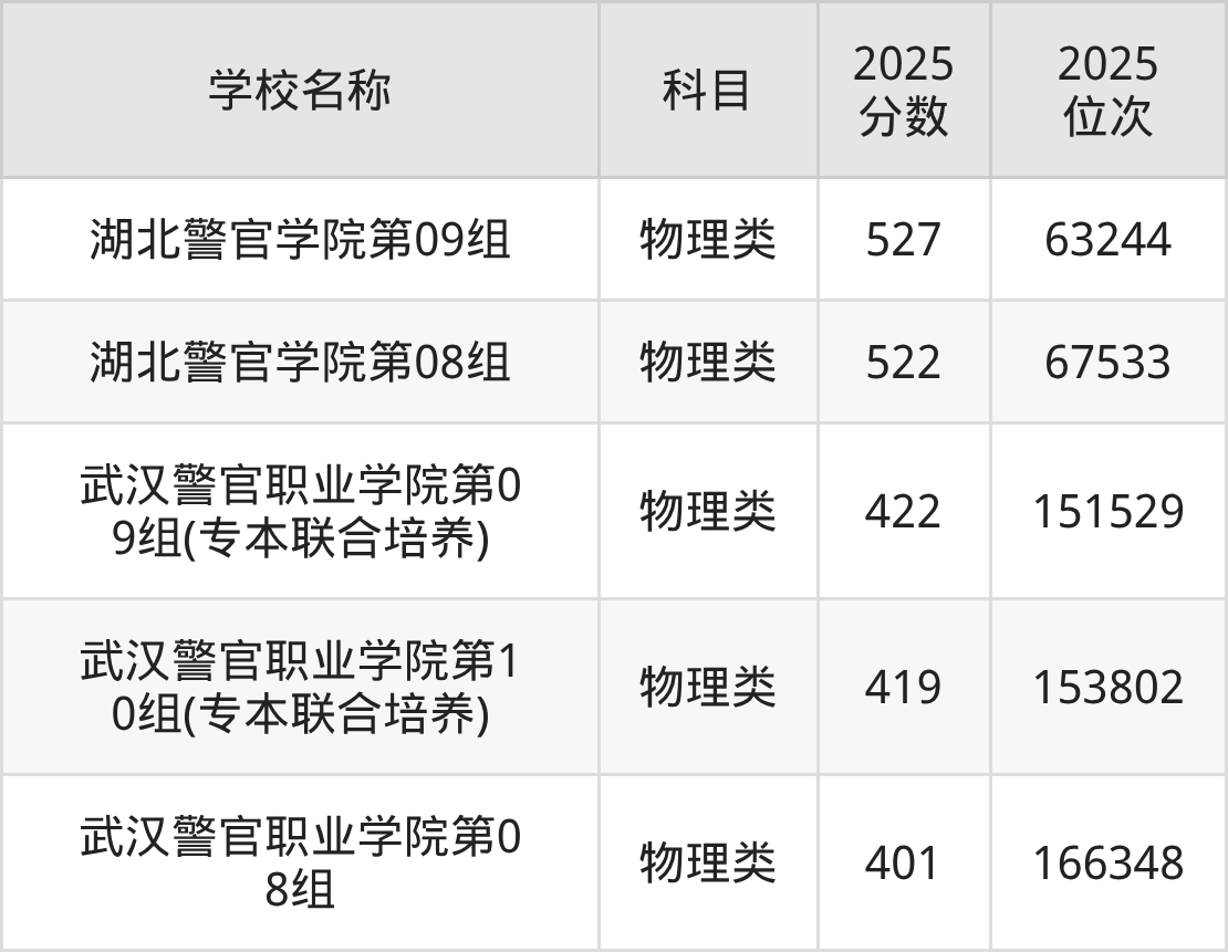 下文为2025年武汉市公安警察大学在湖北物理类录取分数线和位次排名表,供大家参考: