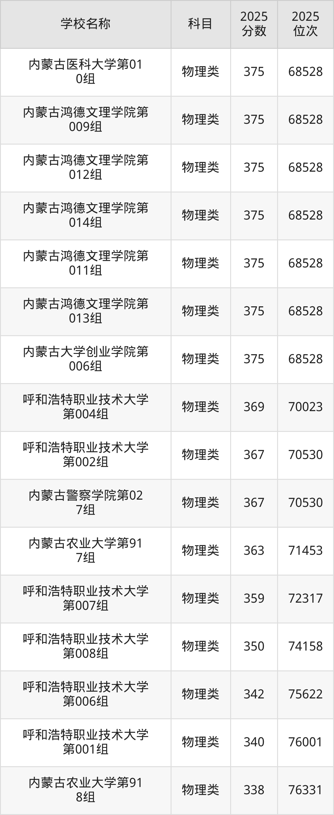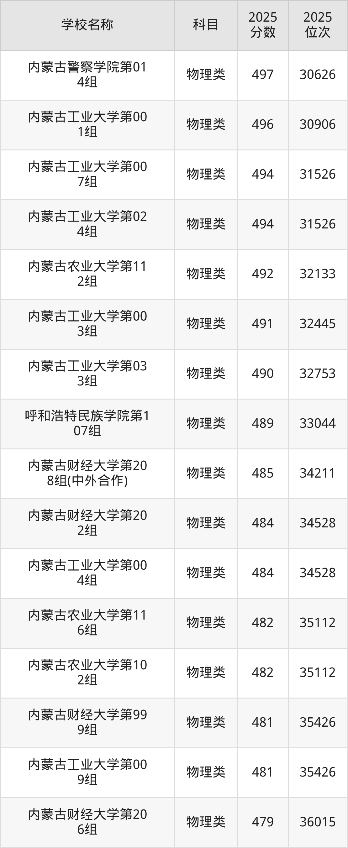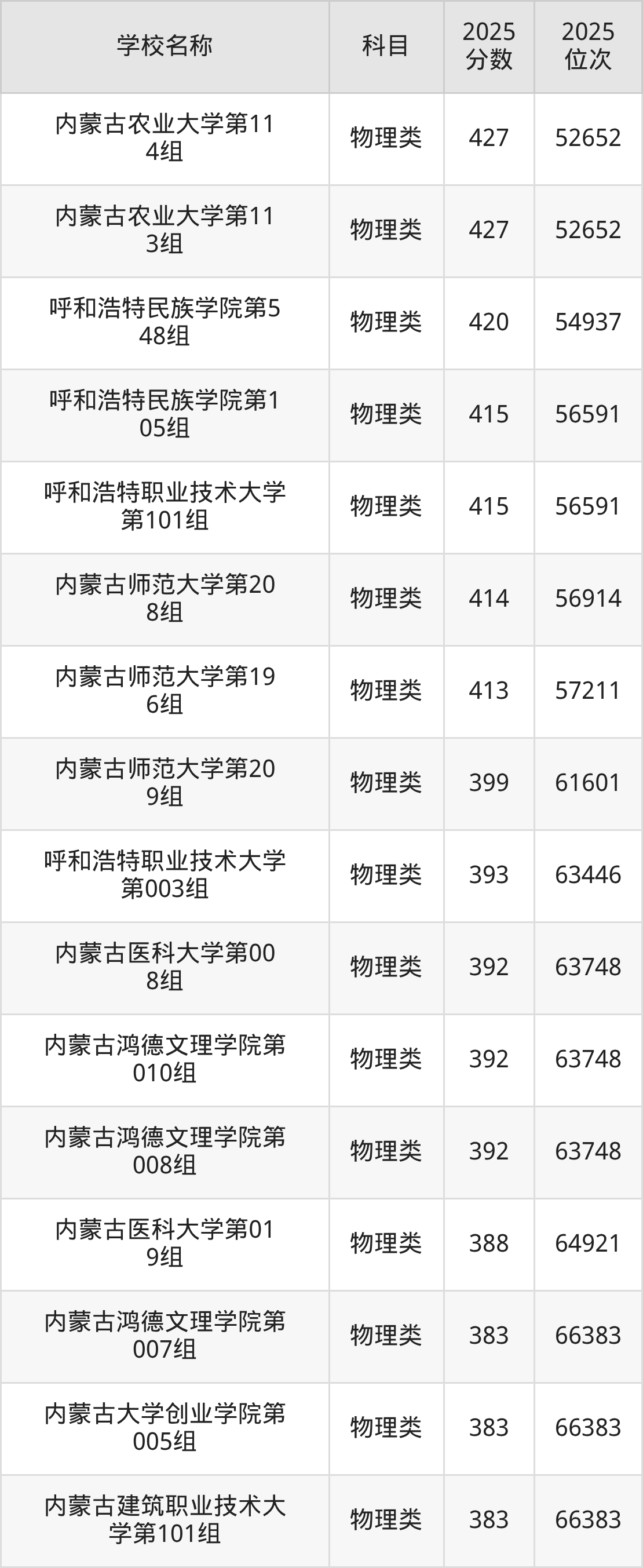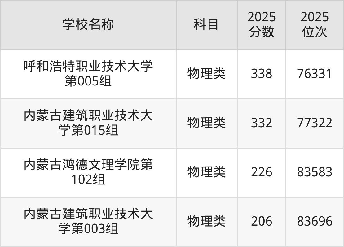 下文为2025年呼和浩特市本科大学在内蒙古物理类录取分数线和位次排名表,供大家参考: