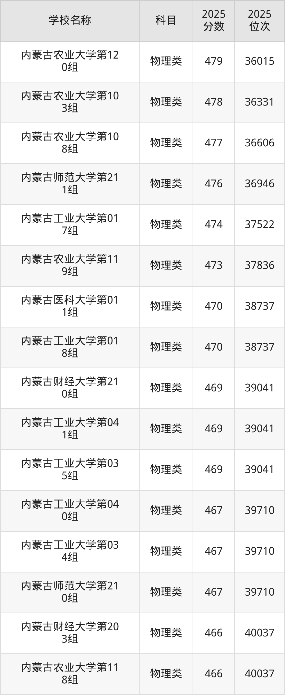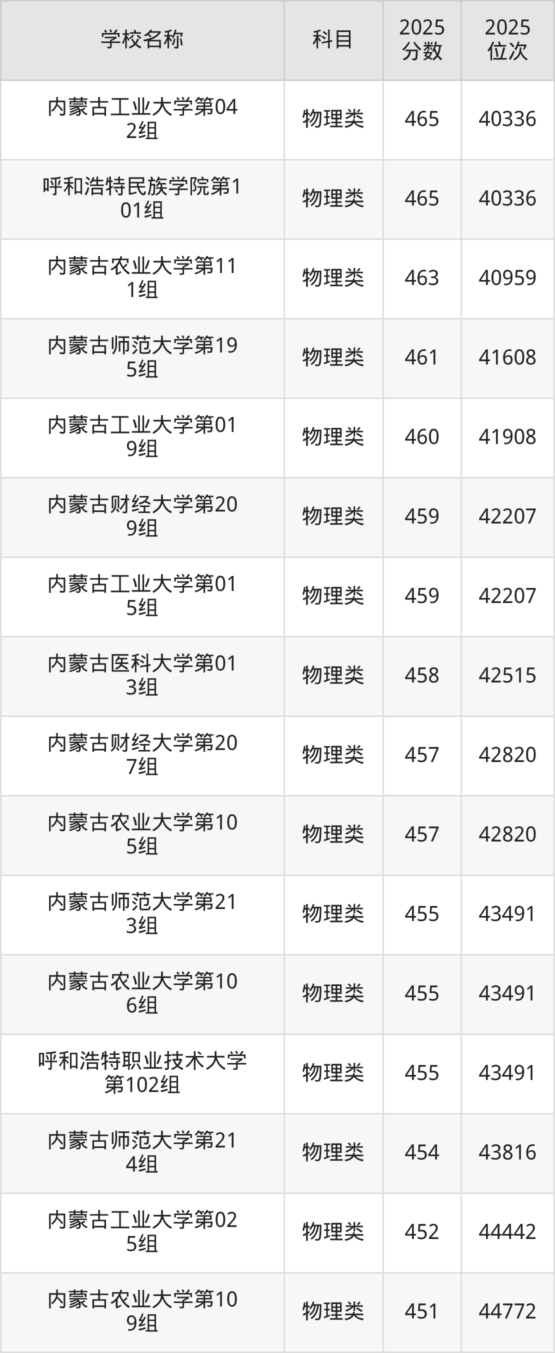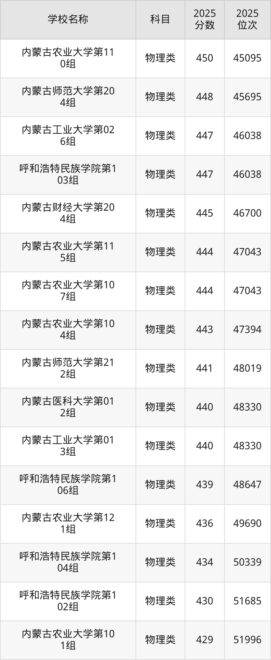下文为2025年呼和浩特市本科大学在内蒙古物理类录取分数线和位次排名表,供大家参考: