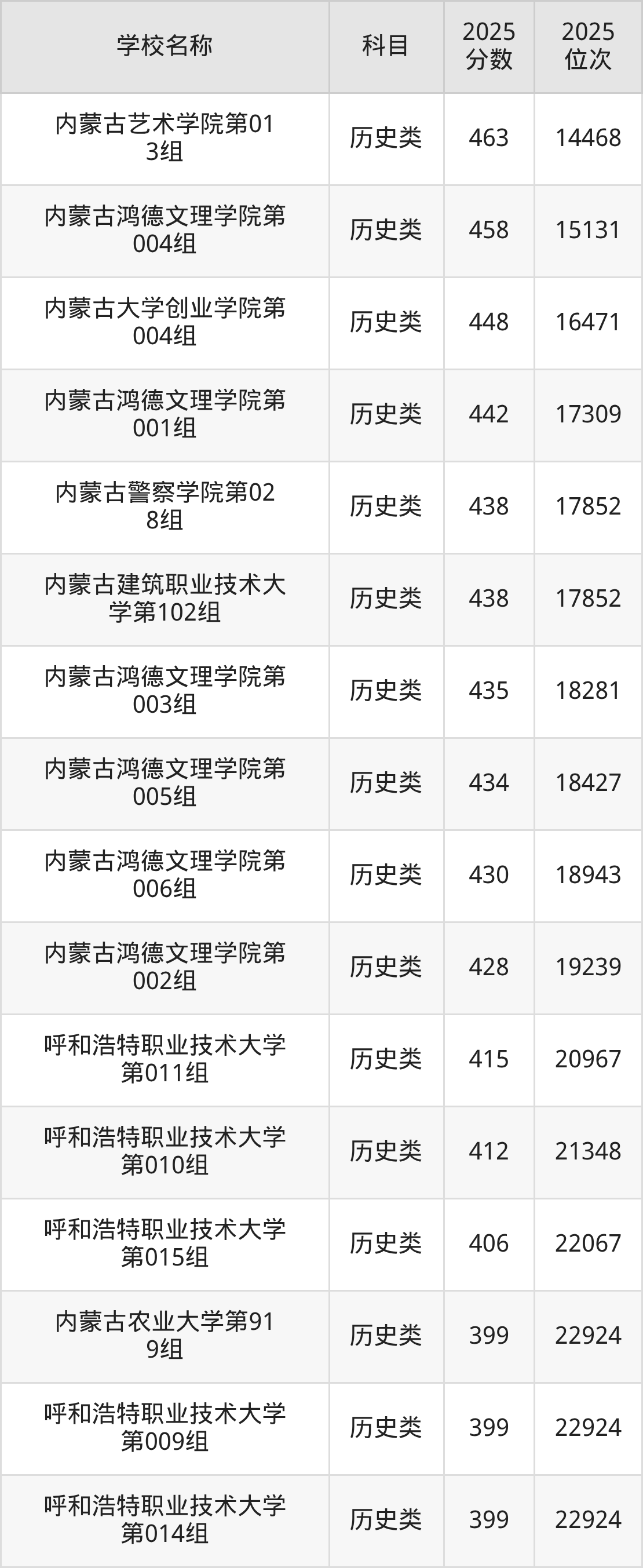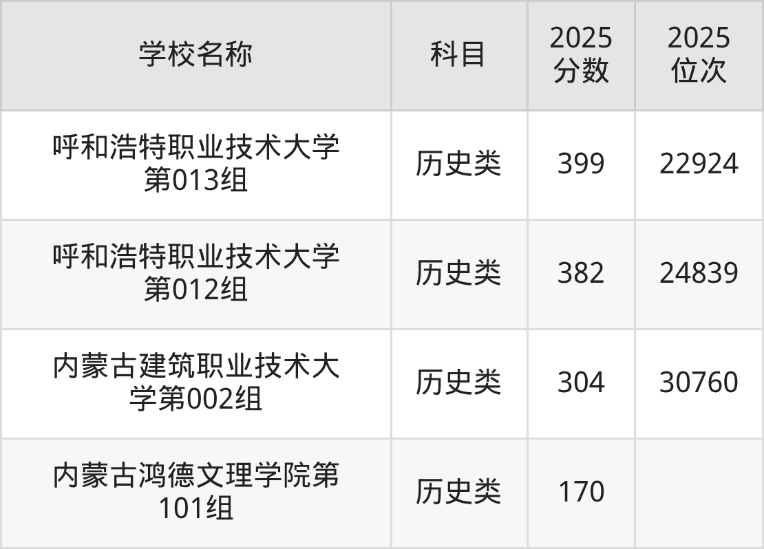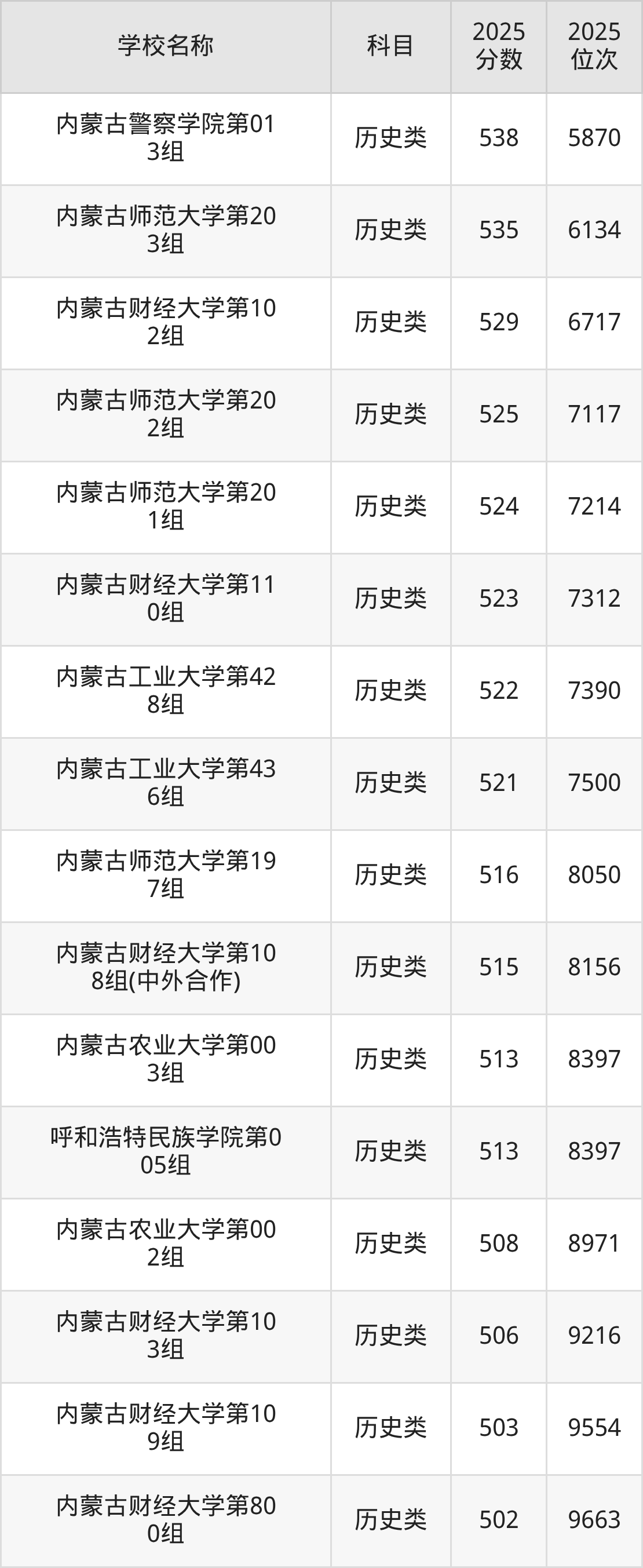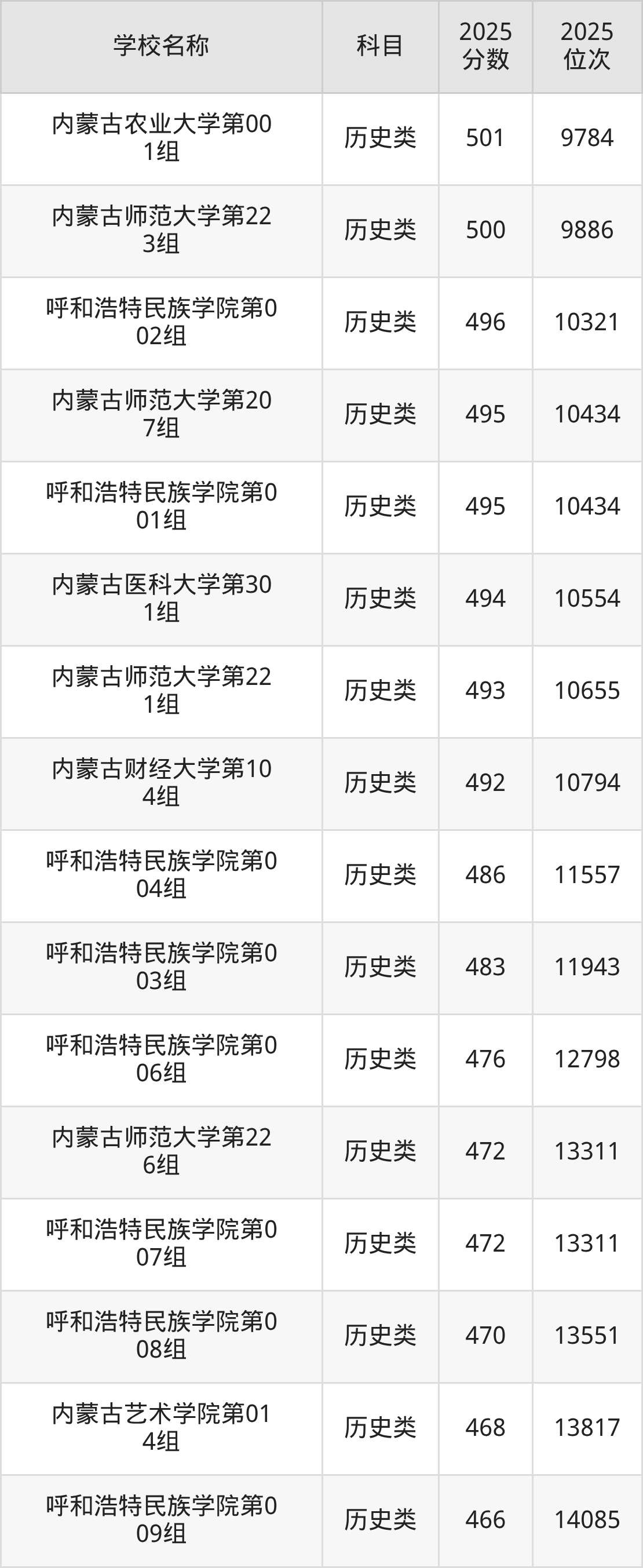 下文为2025年呼和浩特市本科大学在内蒙古历史类录取分数线和位次排名表,供大家参考: