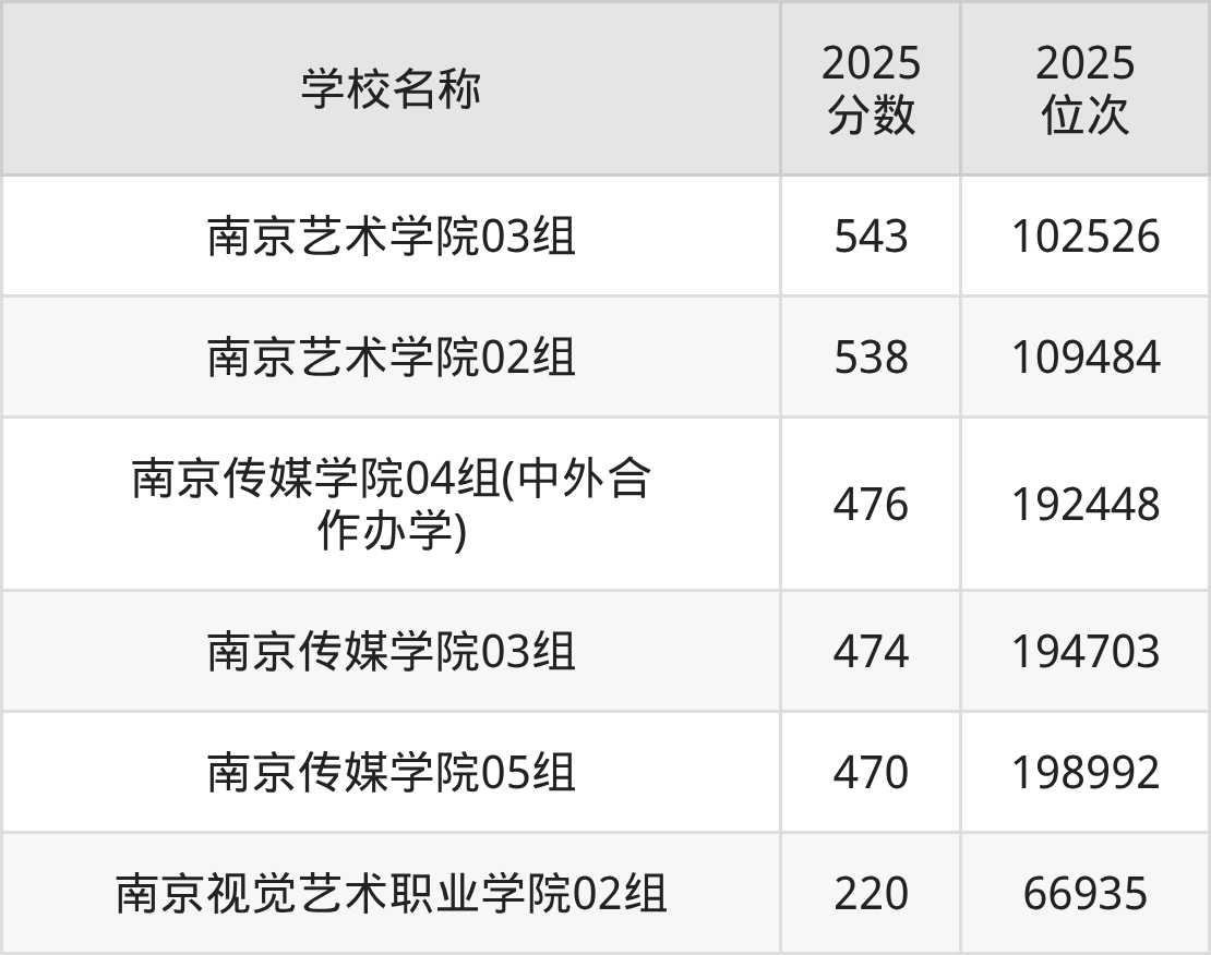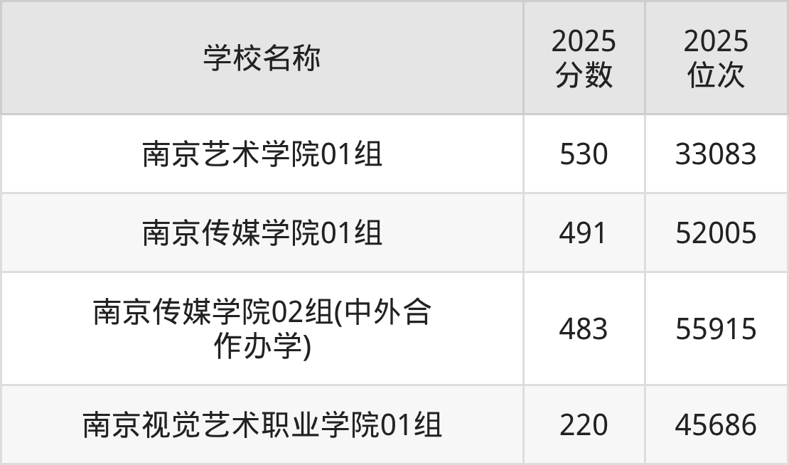 下文为2025年南京市艺术类大学在江苏历史类录取分数线和位次排名表,供大家参考: