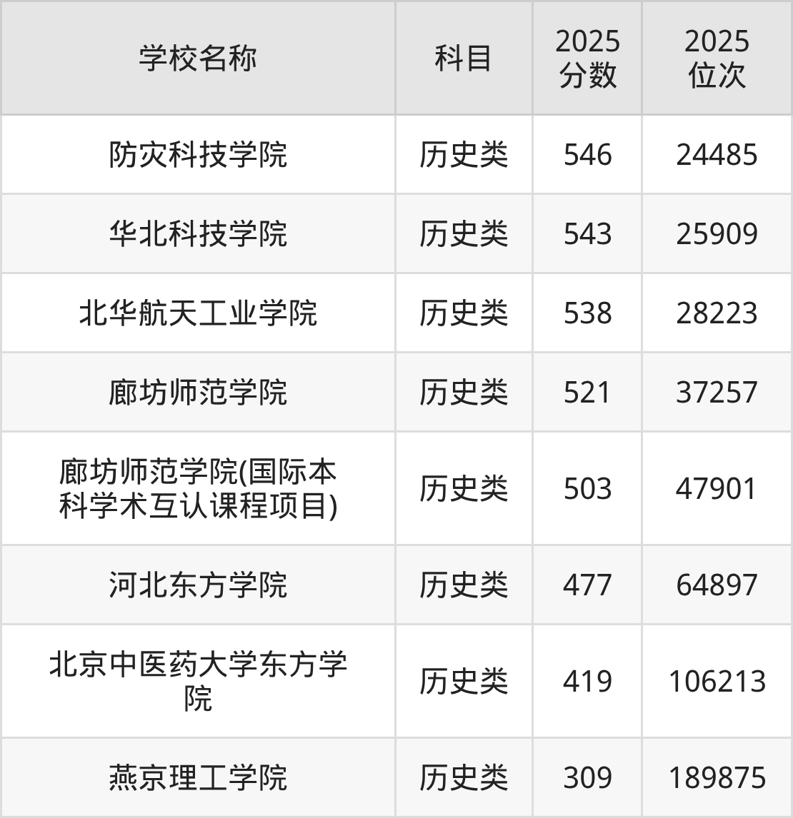 下文为2025年廊坊市本科大学在河北历史类录取分数线和位次排名表,供大家参考: