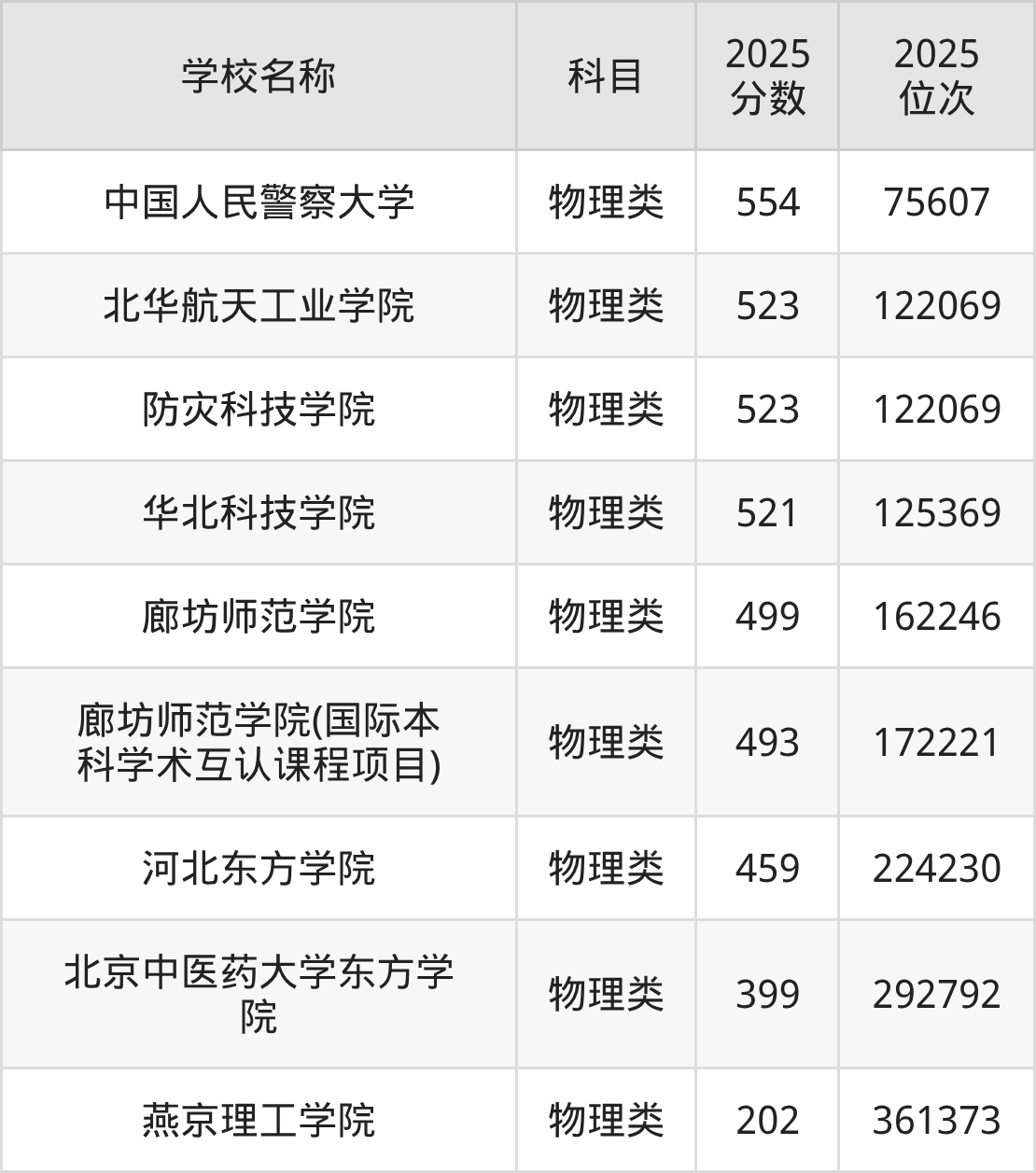 下文为2025年廊坊市本科大学在河北物理类录取分数线和位次排名表,供大家参考: