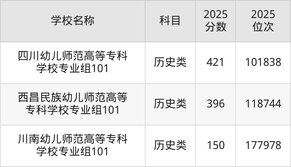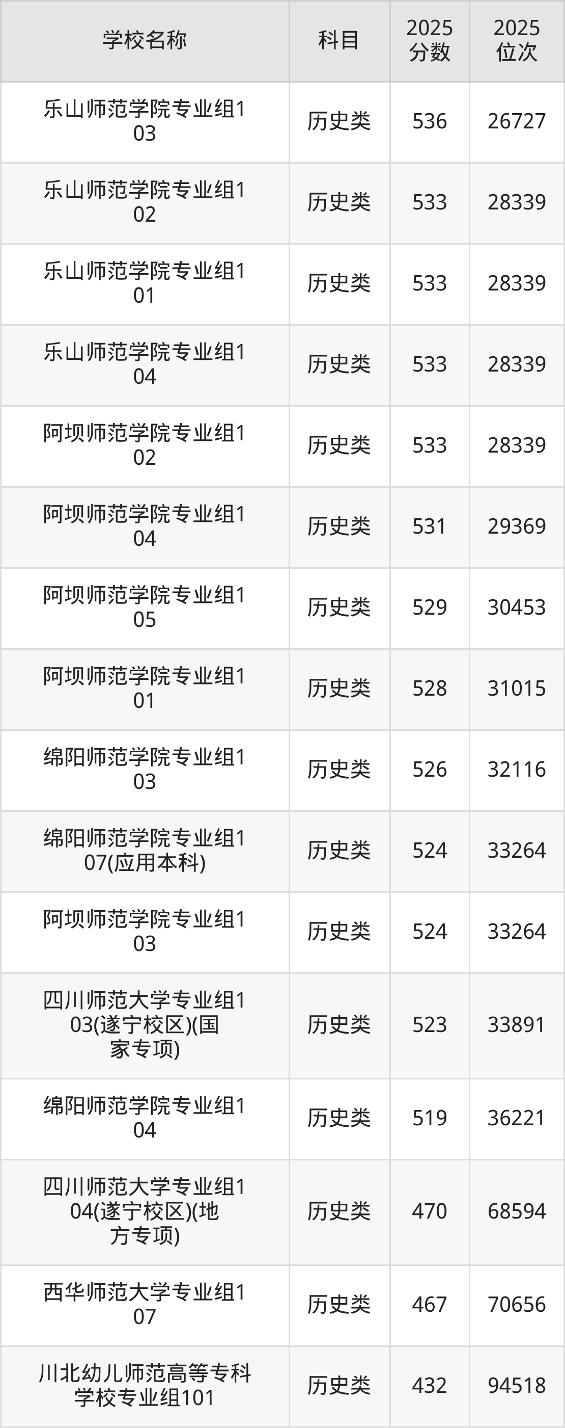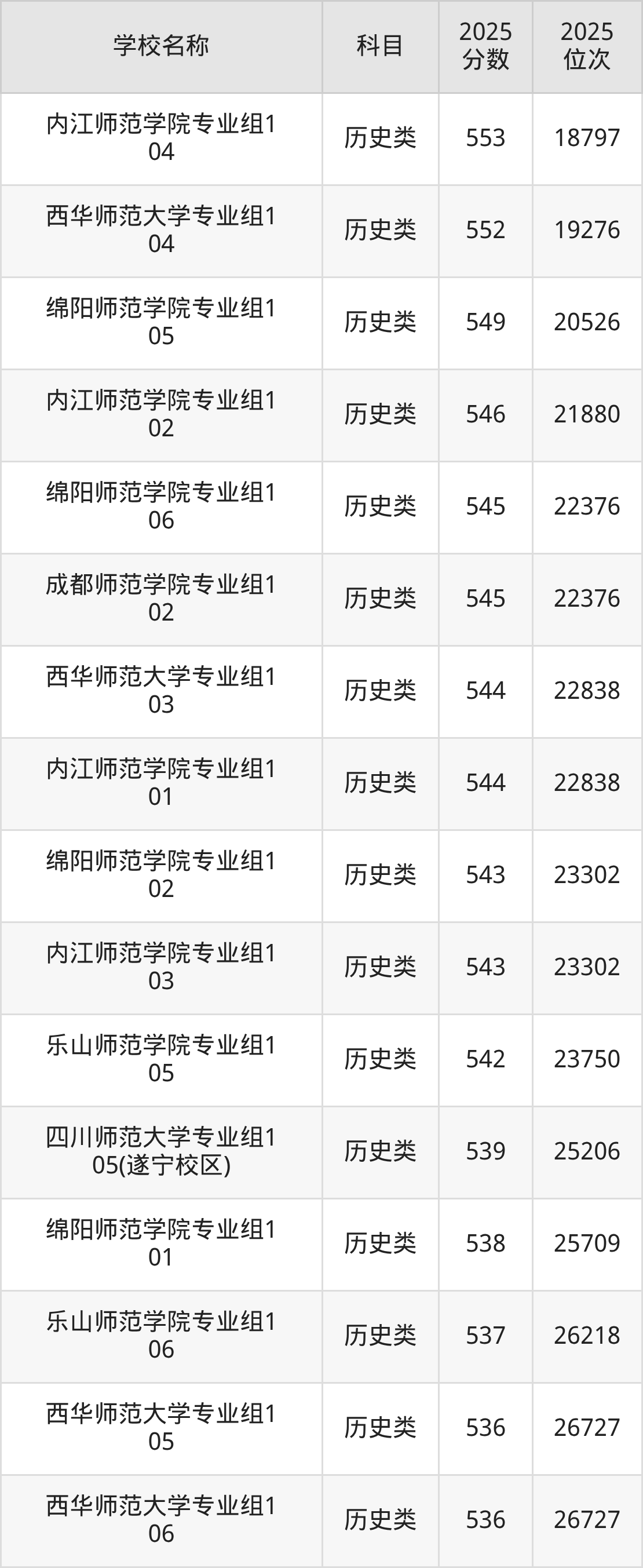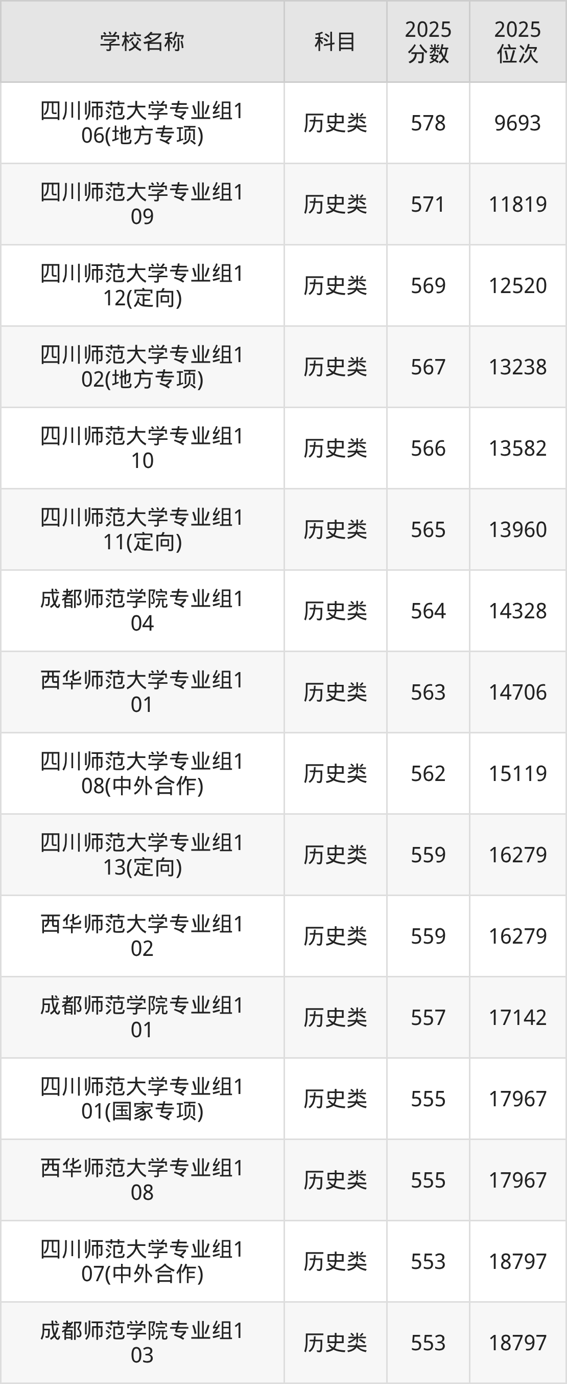 下文为2025年四川省师范类大学在四川历史类录取分数线和位次排名表,供大家参考:
