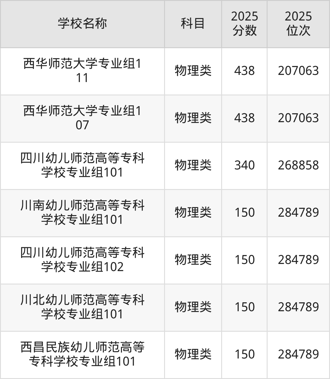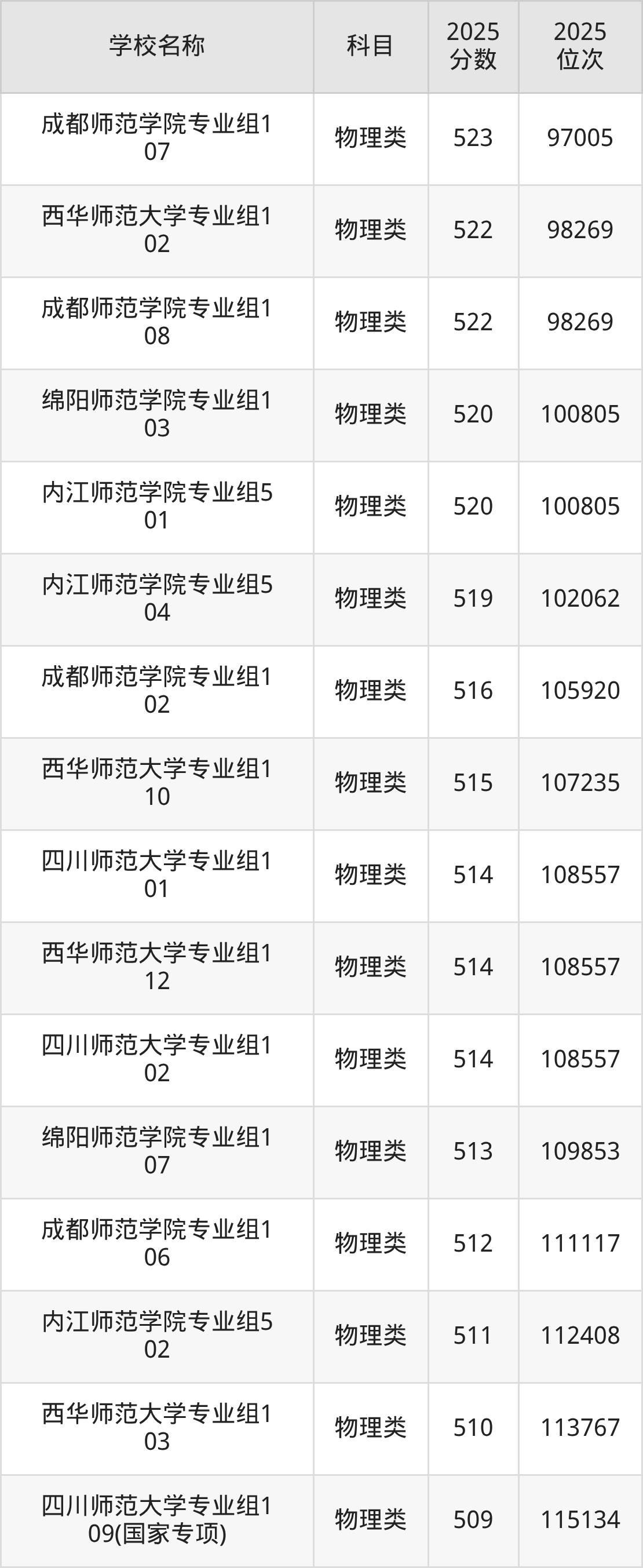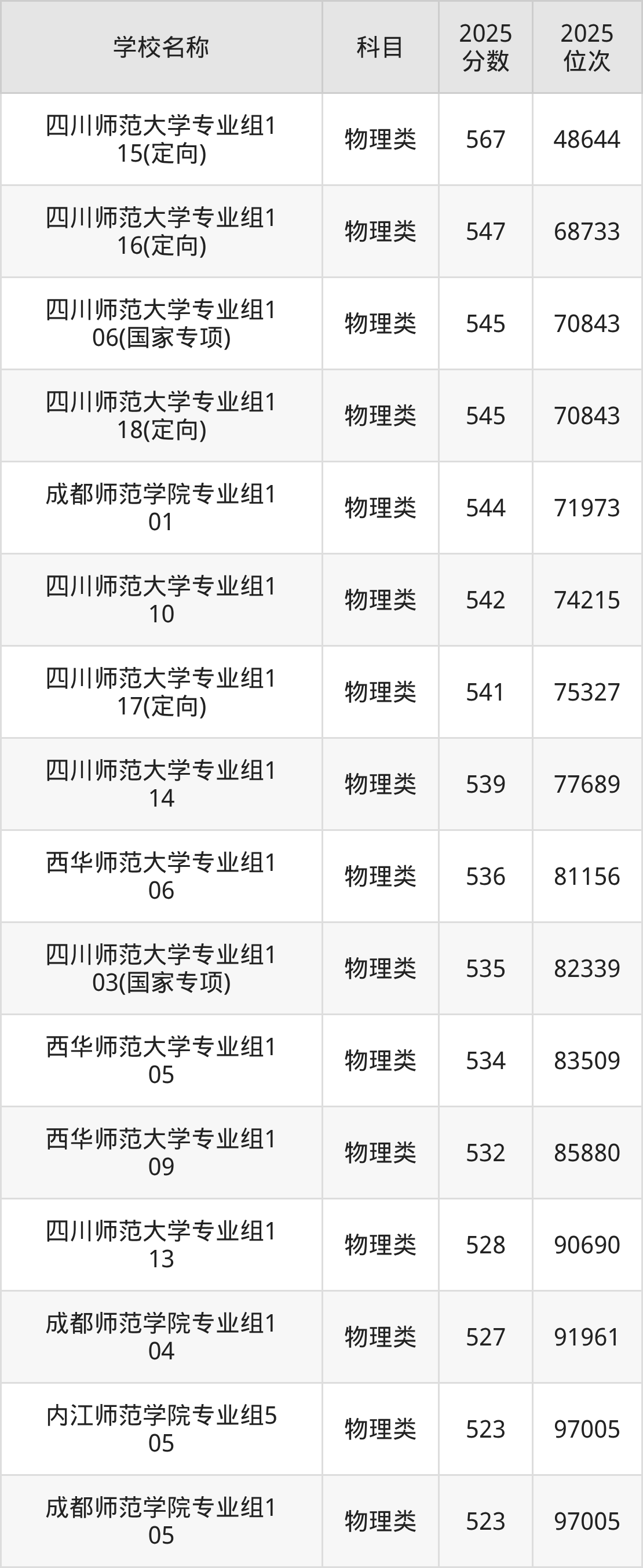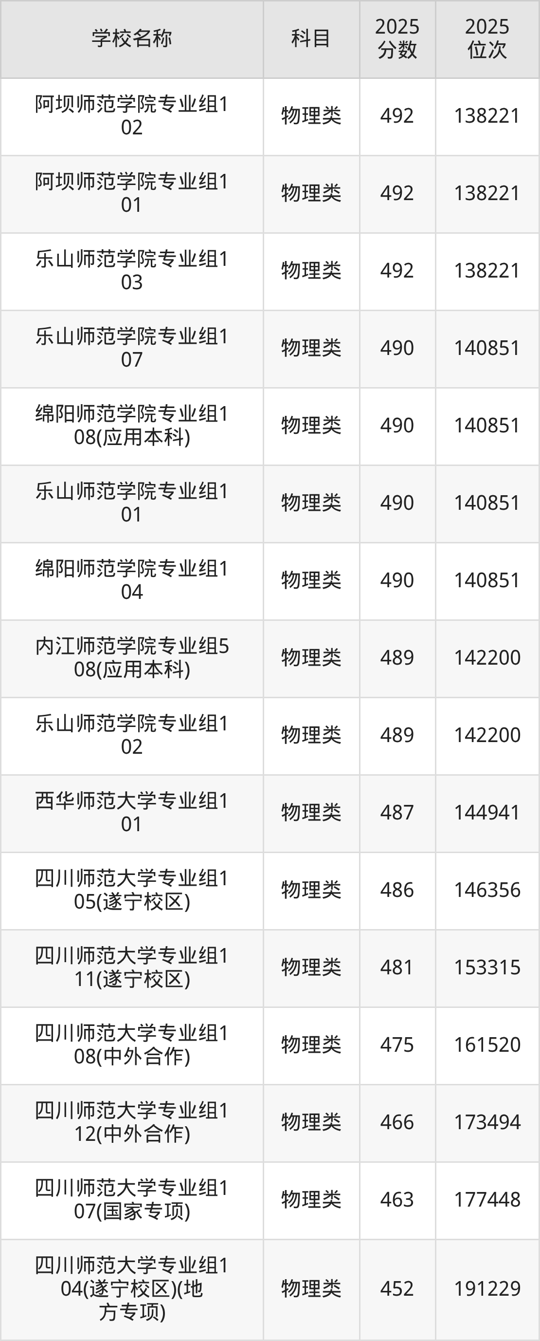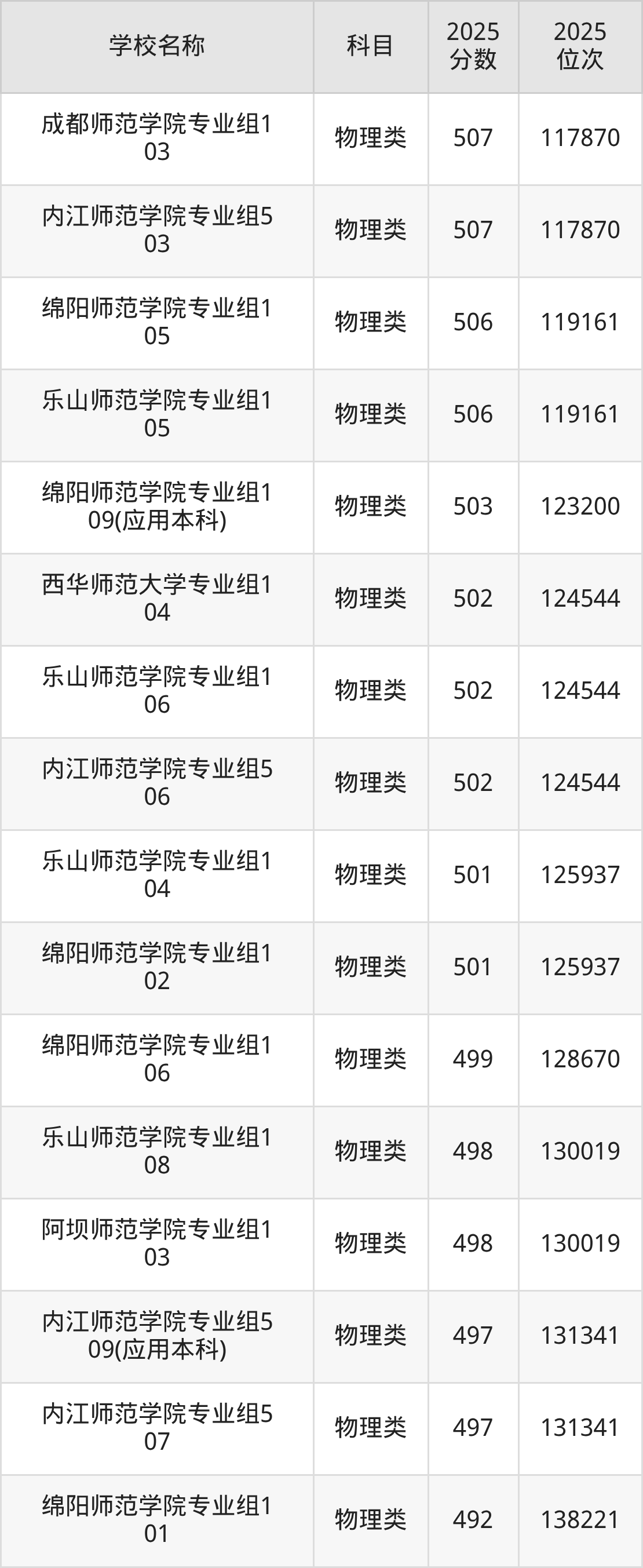 下文为2025年四川省师范类大学在四川物理类录取分数线和位次排名表,供大家参考: