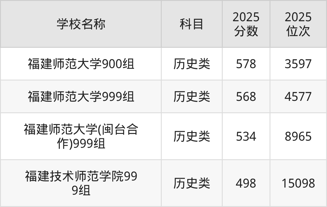 下文为2025年福州市师范类大学在福建历史类录取分数线和位次排名表,供大家参考: