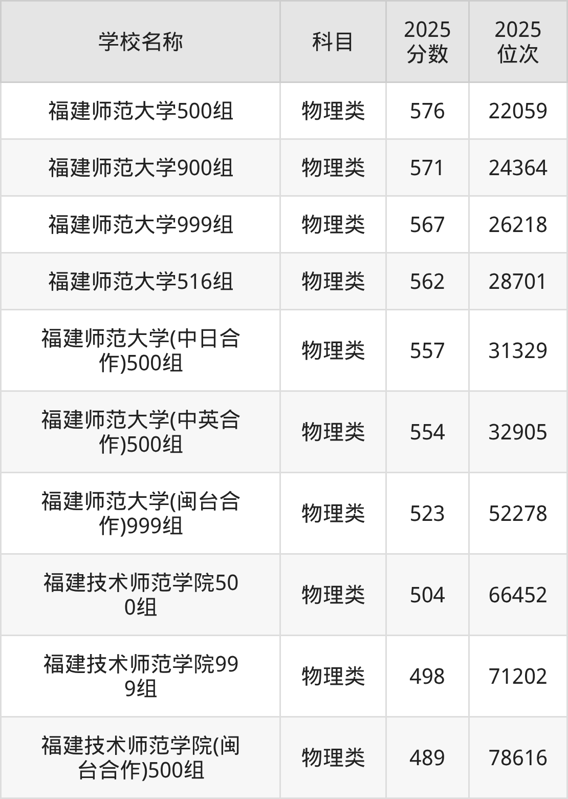 下文为2025年福州市师范类大学在福建物理类录取分数线和位次排名表,供大家参考:
