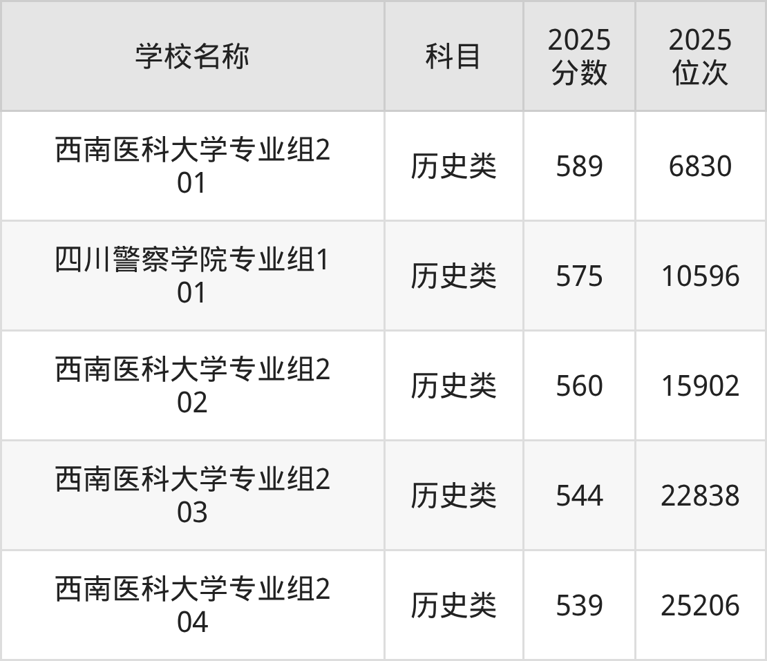 下文为2025年泸州市本科大学在四川历史类录取分数线和位次排名表,供大家参考: