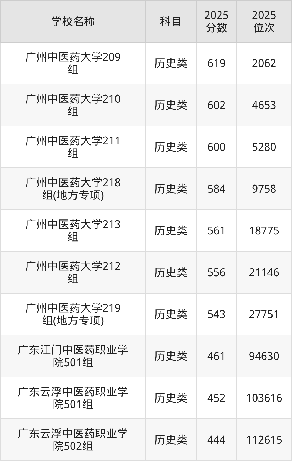 下文为2025年广东省中医药大学在广东历史类录取分数线和位次排名表,供大家参考: