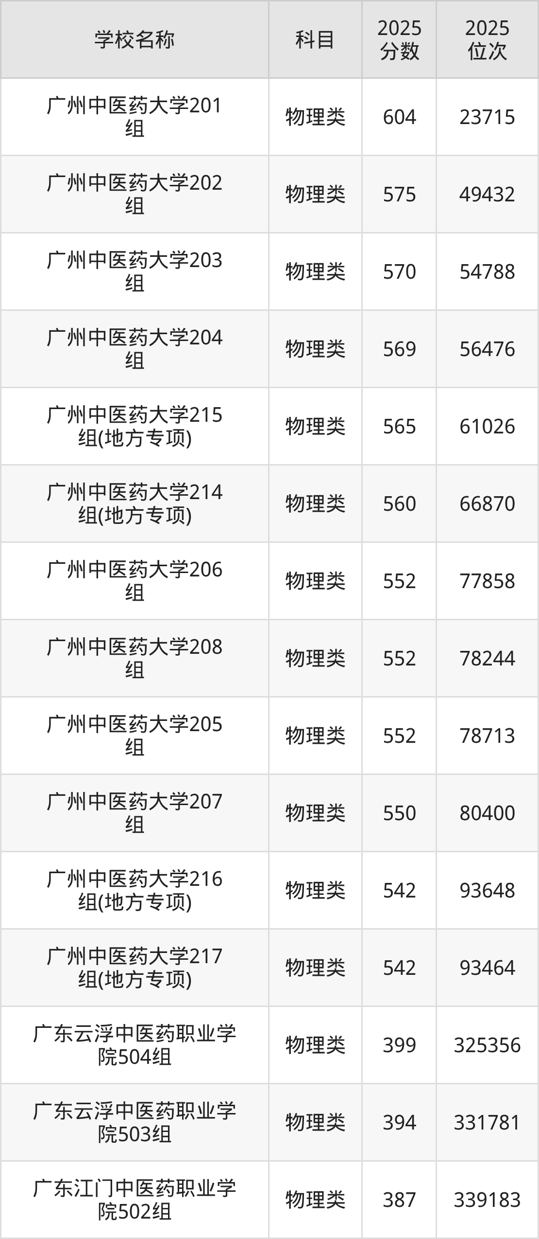 下文为2025年广东省中医药大学在广东物理类录取分数线和位次排名表,供大家参考:
