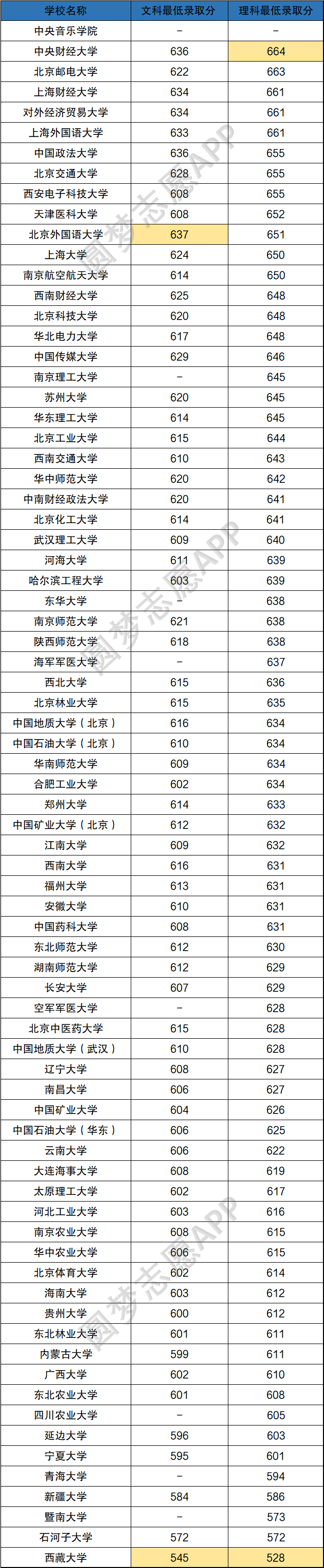 5、延边大学:文科596分,理科603分;1、暨南大学:理科573分 (中外合作办学);