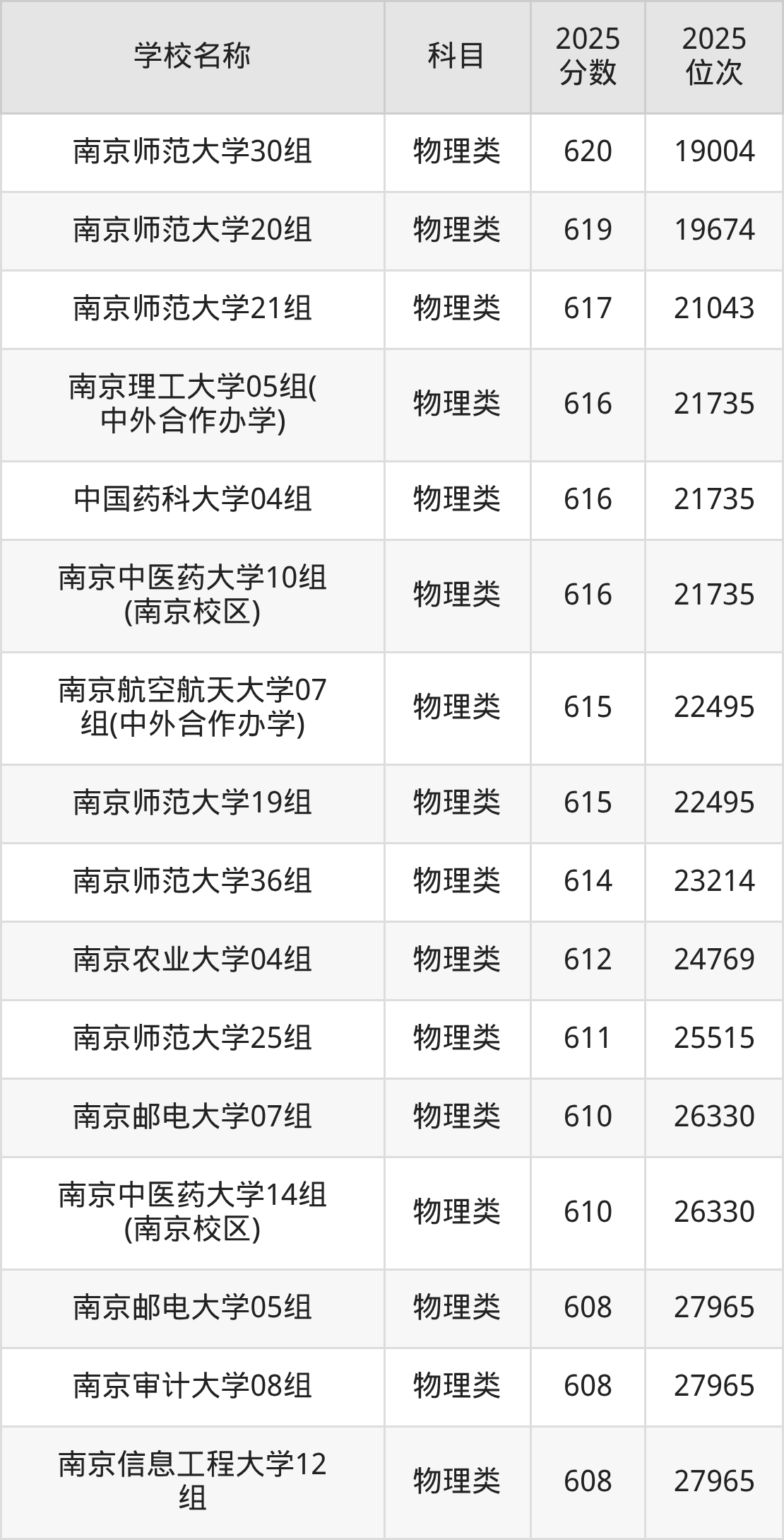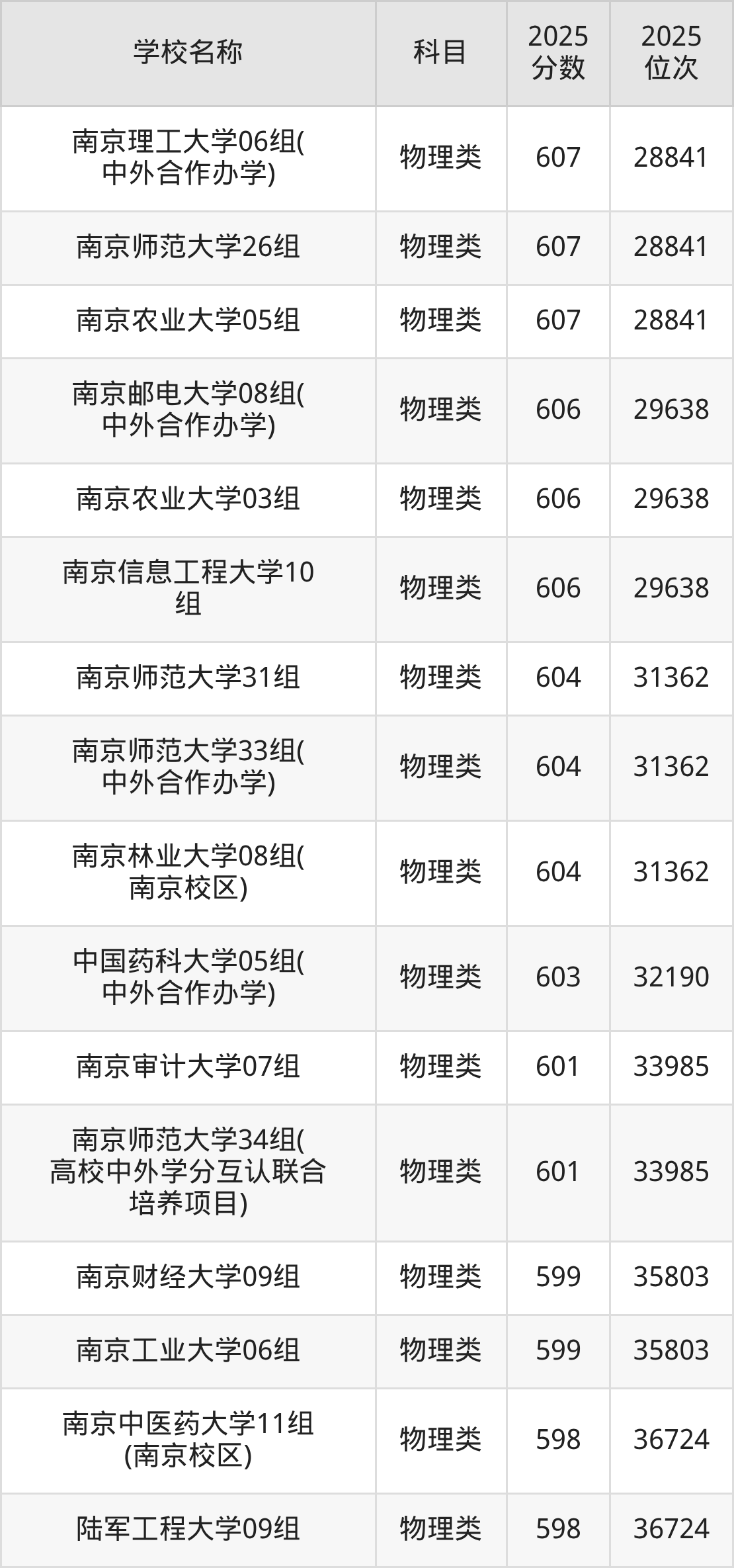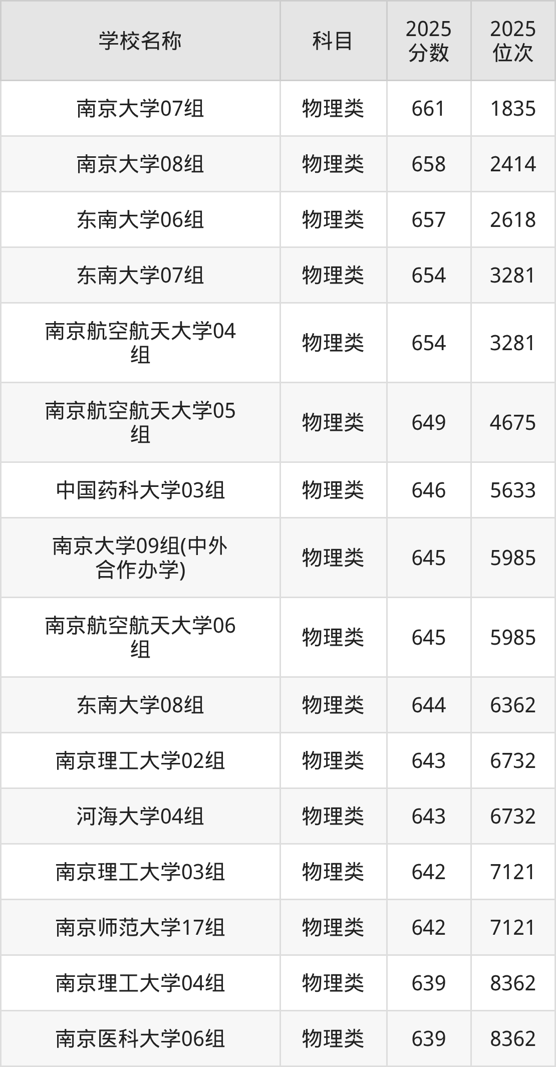 下文为2025年南京市一本大学在江苏物理类录取分数线和位次排名表,供大家参考: