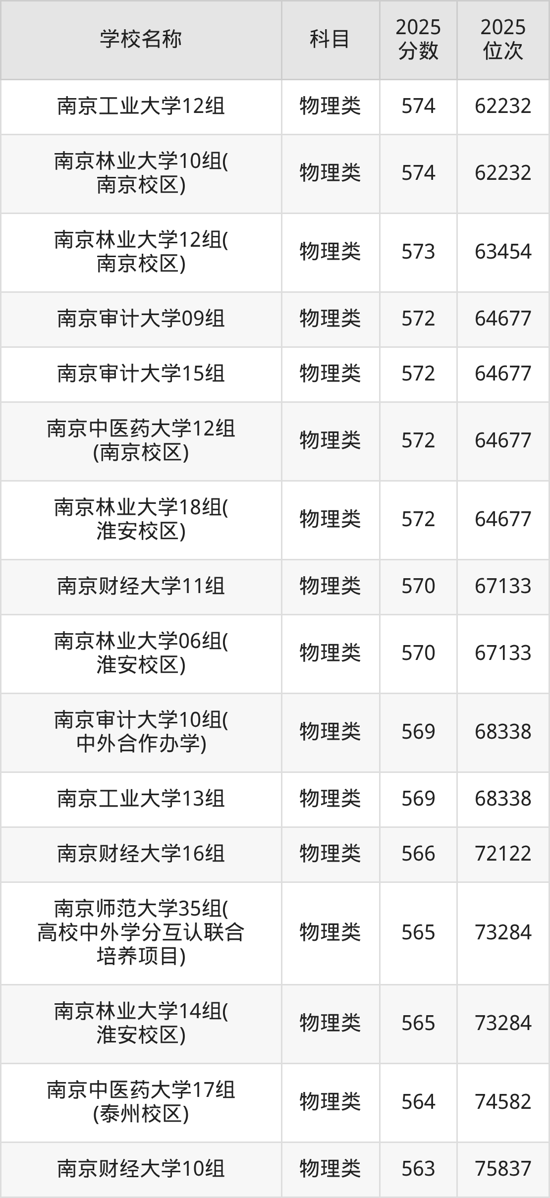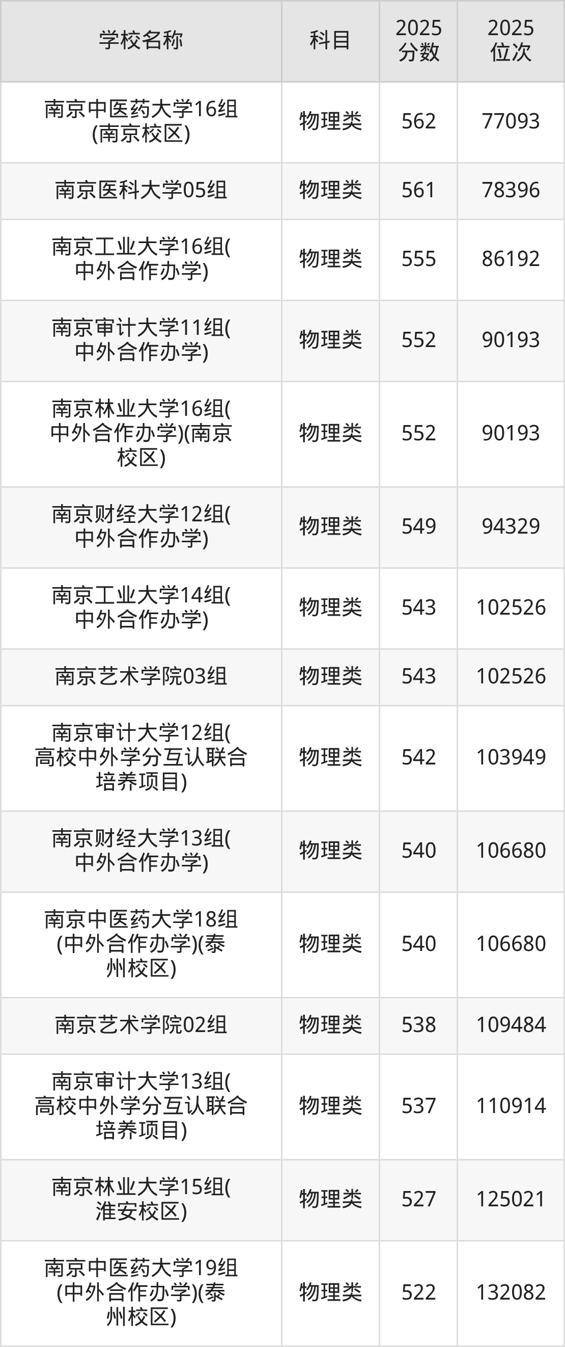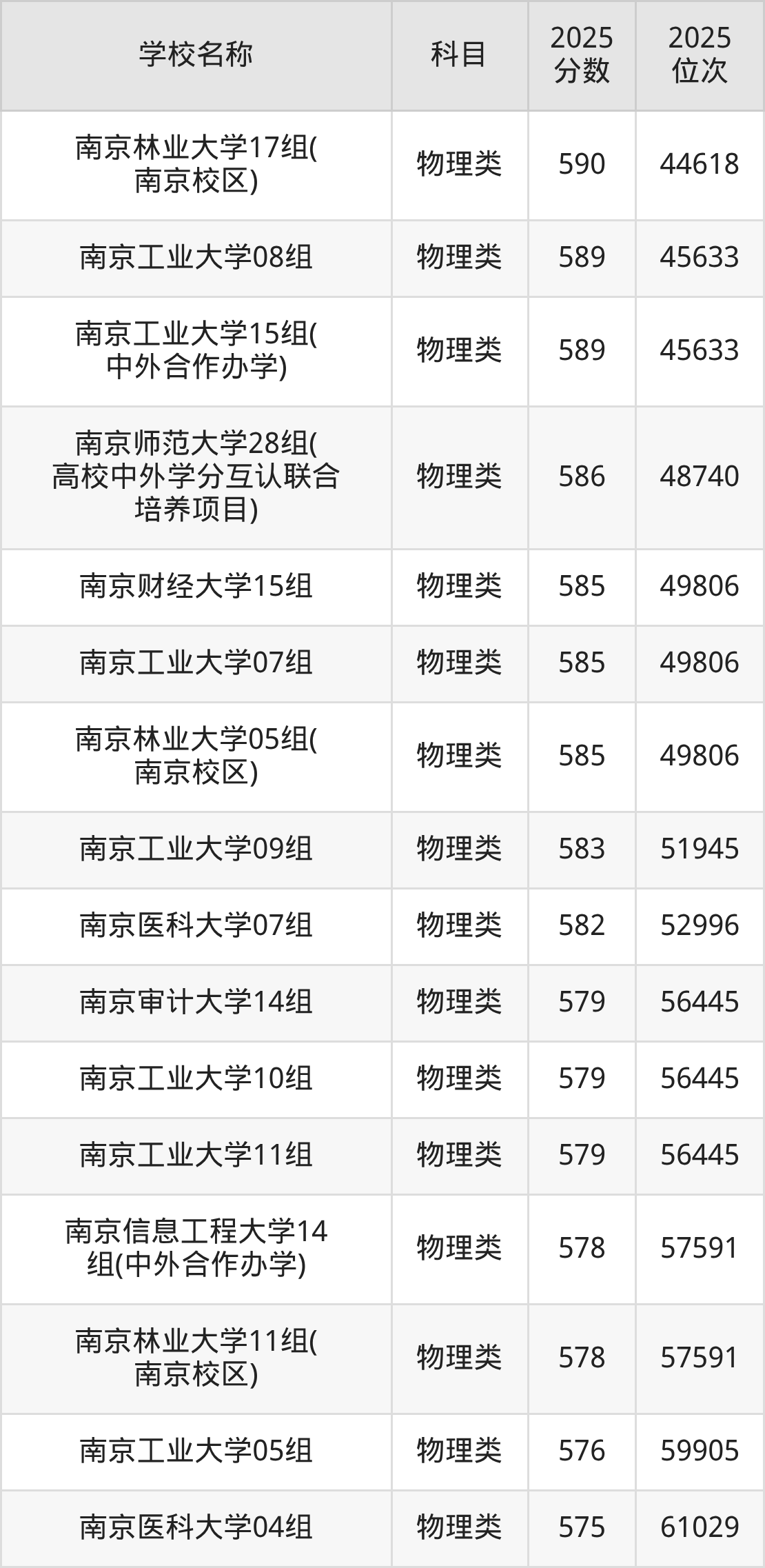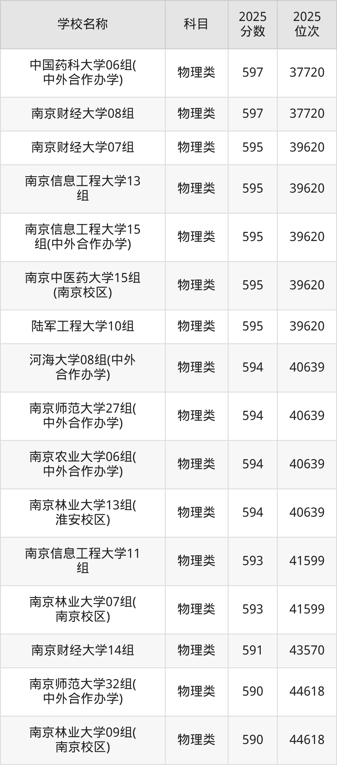 下文为2025年南京市一本大学在江苏物理类录取分数线和位次排名表,供大家参考:
